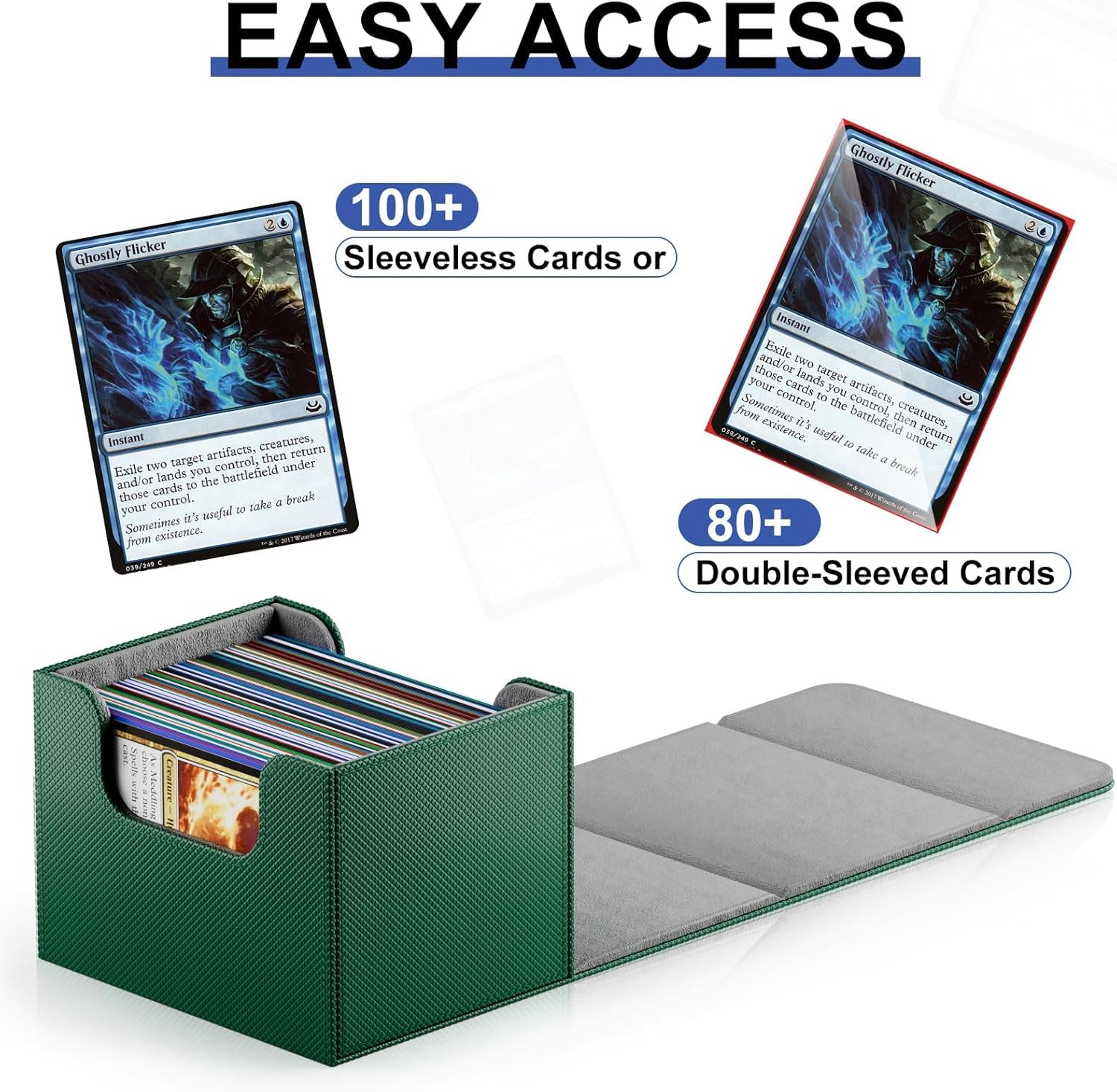 【Grande Conservazione】: Questa deck box è compatibile con carte collezionabili, carte sportive e altre carte della stessa dimensione. La scatola porta carte collezionabili misura 4,09 x 3,58 x 3,19 pollici (10,4*9,1*8,4 cm). Questa custodia per mazzi di carte può contenere facilmente fino a 100 carte con un manicotto o più di 80 carte con due manicotti, in base alle vostre esigenze (Nota: non è compatibile con i manicotti carte rigide). 【Materiale di Alta Qualità】: Realizzato con materiali impermeabili e durevoli in pelle PU. I materiali sicuri, privi di acidi e di PVC trattengono perfettamente la carta. L'interno utilizza una fodera in fibra morbida altamente protettiva per proteggere la carta dai graffi. 【Chiusura Magnetica】: Il coperchio con magneti di alta qualità mantiene la scatola saldamente chiusa e impedisce che le carte collezionabili si aprano accidentalmente e fuoriescano durante il trasporto. Il robusto coperchio magnetico mantiene le carte protette. 【Accessori Utili】: 4 colori scatola di carte hanno 4 pezzi divisori di carte di dimensioni standard, che sono molto adatti per la memorizzazione e la separazione di carte diverse. Aiutano i collezionisti a distinguere i diversi pacchetti di carte. 【Regalo Ideale】: Premium deckbox magnetico può essere carino e regali ideali per le vostre famiglie, amici, fidanzate, fidanzati, soprattutto coloro che amano raccogliere le carte o giocare a giochi di carte.