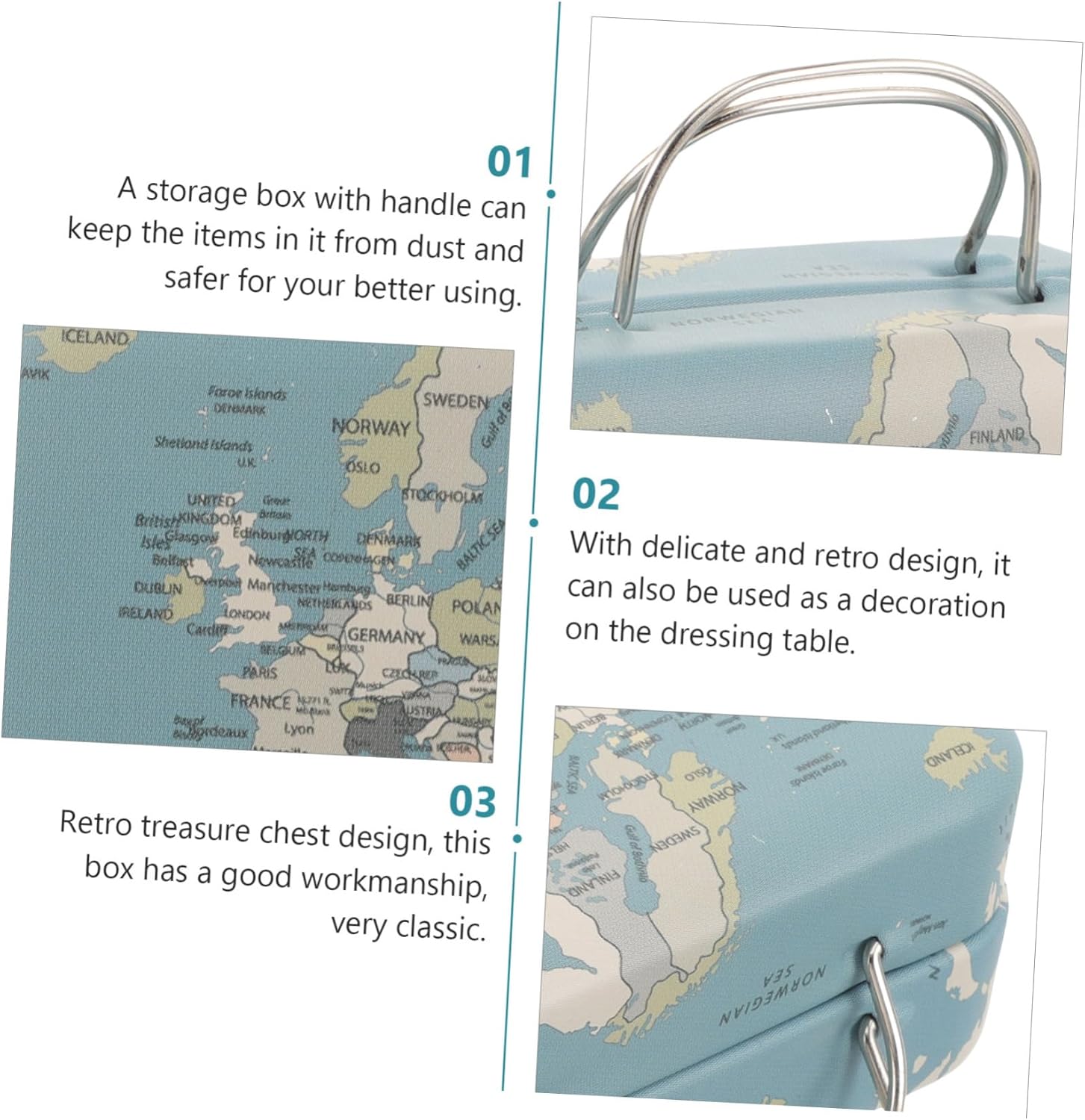 Conservazione pratica: la scatola per ciglia dal design mini valigia retrò offre una soluzione compatta per riporre ciglia finte e piccoli articoli cosmetici, in modo da poter rimanere organizzati e proteggere i tuoi articoli per il trucco. Organizzatore versatile: questo piccolo portagioie è adatto per anelli, orecchini, collane e braccialetti e offre quindi un'alternativa salvaspazio alle tradizionali opzioni di conservazione per i tuoi accessori preferiti. Lavorazione robusta: realizzata in robusto ferro con lavorazione finemente dettagliata e aspetto decorativo come mappa del mondo, la piccola scatola portaoggetti garantisce una protezione duratura e arricchisce ogni toletta con un tocco di fascino vintage Ideale per la vita di tutti i giorni e i viaggi: il design pratico con una pratica maniglia facilita il trasporto e rende la scatola per ciglia un elegante compagno in viaggio che tiene al sicuro i vostri piccoli tesori Affascinante design retrò: il look nostalgico del mini portagioie si adatta particolarmente bene agli amanti della decorazione classica e crea un'atmosfera accattivante in occasioni speciali come compleanni o anniversari