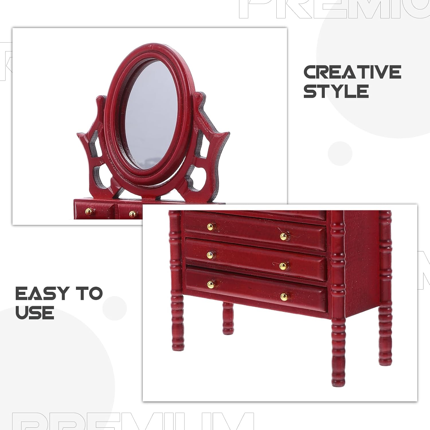 Artigianato in miniatura dettagliato: questo tavolo da toeletta per casa delle bambole con specchio e cassetti è una splendida aggiunta all'arredamento della camera da letto della casa delle bambole, che mette in mostra dettagli intricati per i collezionisti Comodo spazio di archiviazione: i ripiani in legno per cassetti offrono un pratico spazio di archiviazione per piccoli oggetti, rendendo questo tavolo da toeletta per casa delle bambole un funzionale pezzo di arredamento per casa delle bambole in miniatura Design autentico dello specchio: lo specchio realistico migliora l'esperienza del tavolo da toeletta della casa delle bambole, aggiungendo profondità e interazione agli accessori e alle scene della casa delle bambole in miniatura robusto: realizzato in legno, questo mobile in miniatura è costruito per resistere al tempo, per gli appassionati e i collezionisti di mobili in miniatura per case delle bambole Creatività senza fine: compatibile con vari accessori per mobili in miniatura, questa mini scrivania da toeletta consente agli utenti di progettare senza sforzo configurazioni uniche di mobili per la camera da letto della casa delle bambole