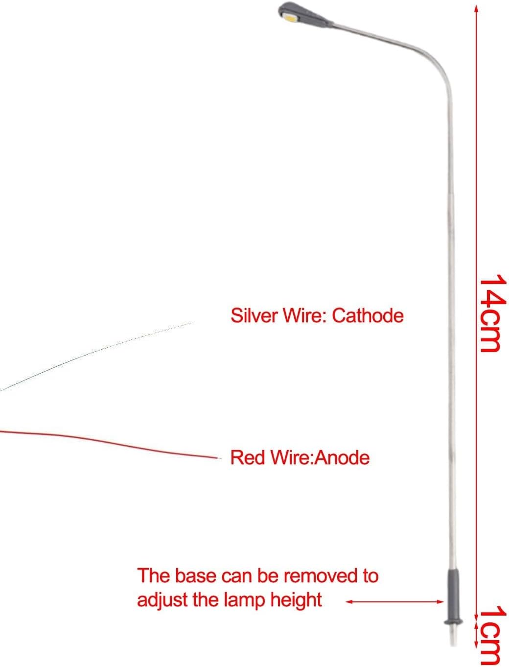 Lampada bianca calda: 12 luci stradali ferroviarie modello con design a testa singola, ogni 14 cm di altezza, realizzate in metallo per un uso duraturo; perfette per layout in scala HO e scene di costruzione, offrendo un bagliore bianco caldo realistico per migliorare l'atmosfera di configurazione del treno Soluzione di illuminazione ferroviaria modello: I LED funzionano a 3V DC o AC con corrente 20mA; include 12 resistori serie per collegare in modo sicuro a fonti di alimentazione 12-16V, assicurando una corretta regolazione della tensione e proteggendo i LED da danni durante il funzionamento Design di facile installazione: ogni lampione da 14 cm presenta una semplice compatibilità di cablaggio per modellini ferroviari; basta integrare il resistore incluso nella linea di alimentazione quando si utilizzano trasformatori da 12-16 V, non sono necessari componenti aggiuntivi per le configurazioni standard Dettagli realistici in scala: costruite in scala 1:75 con precisione costruttiva precisa, queste lampade bianche calde aggiungono autentici effetti di illuminazione stradale a paesaggi urbani, stazioni o zone industriali nel layout del modello per ottenere risultati visivi coinvolgenti Uso sicuro e adatto all'età: non per bambini sotto i 14 anni; la sorgente luminosa a LED genera calore basso e illuminazione stabile, adatta per l'uso continuo in mostre di modelli o layout di casa con prestazioni affidabili nel tempo