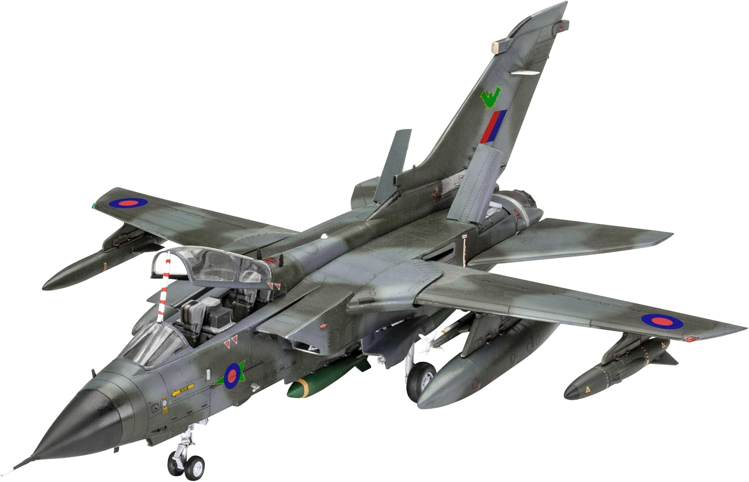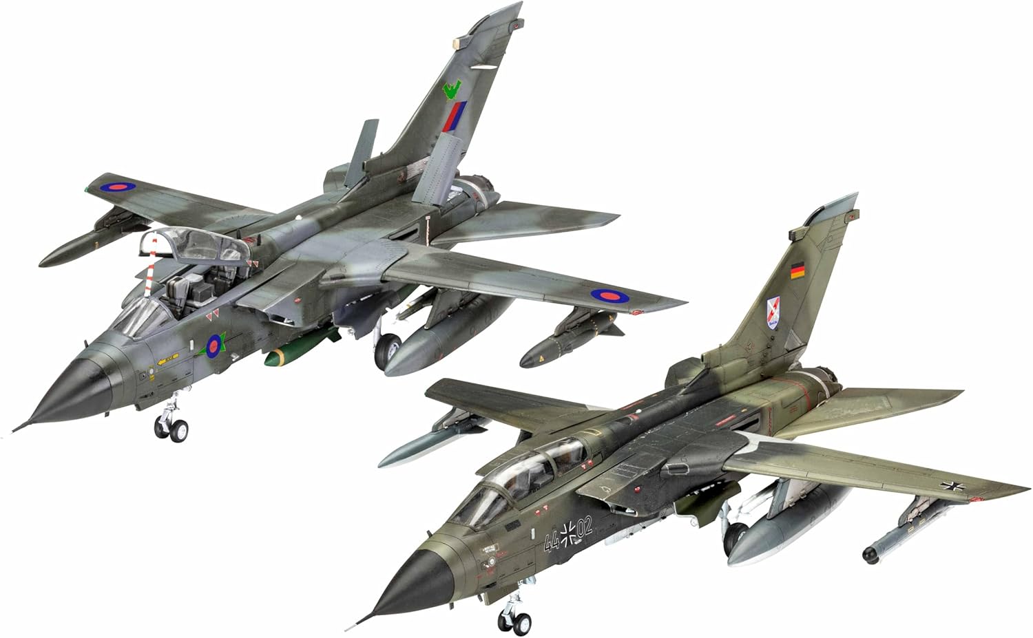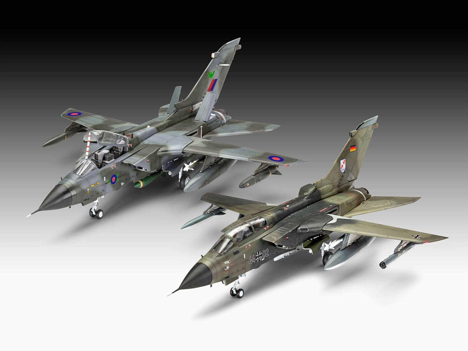 DUE VERSIONI IN UN SET: Il set contiene il Tornado in due versioni: la prima versione della Bundeswehr e la versione base della Royal Air Force, che offre versatilità e autenticità storica SISTEMA D'ARMA INFLUENTE: Il Tornado è equipaggiato con uno dei sistemi d'arma più versatili e di successo della NATO e si è dimostrato valido in numerose situazioni di conflitto GAMMA ECCELLENTE: Grazie ai grandi serbatoi aggiuntivi da 2250 l, i Tornado della RAF hanno una portata eccezionale che estende le loro capacità operative DETTAGLIATO RAPPRESENTAZIONE: Il kit contiene una varietà di dettagli, tra cui ampi carichi esterni, giunti dei pannelli incassati, una cabina di pilotaggio dettagliata con pannelli strumenti pronunciati, carrello di atterraggio dettagliato, una sonda di rifornimento aereo e sedili di espulsione dettagliati DECALCOMANIE PER VERSIONI TEDESCHE E BRITANNICHE: il set contiene decalcomanie per le versioni tedesca e britannica del Tornado per garantire un'autenticità che ne consenta la replica