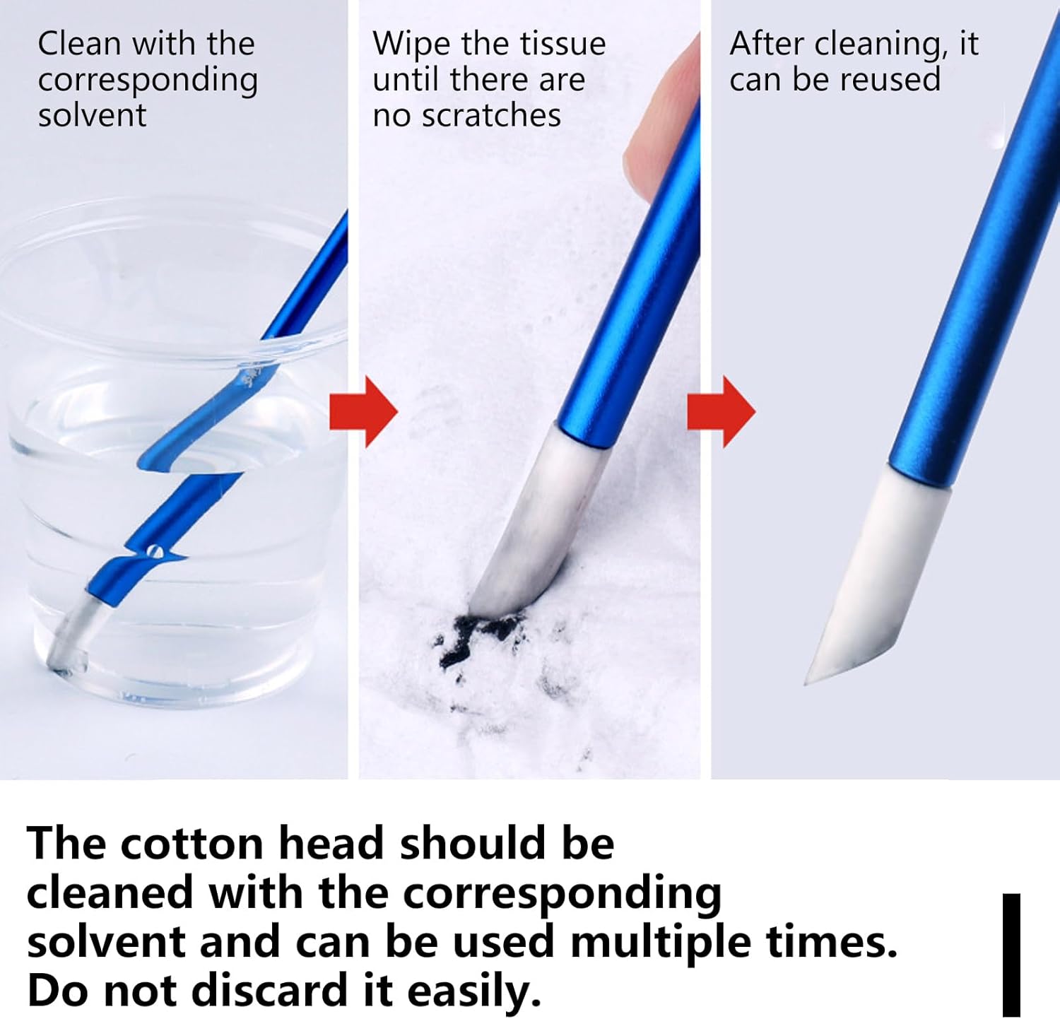 Le punte in cotone sono realizzate in fibra di poliestere, che ha un forte assorbimento d'acqua e non lascia residui. Il design inclinato a 45° è più facile da usare. Può essere pulito con il solvente appropriato della soluzione di infiltrazione, può essere utilizzato più volte e può rimuovere facilmente aree difficili da trattare come traboccamento della soluzione di infiltrazione e vecchie macchie nel modello, evitando efficacemente le superfici Design leggero, facile da impugnare e da usare, adatto per un uso a lungo termine senza fatica Lega di alluminio ad alta resistenza, garantendo che il bastoncino di pulizia sia robusto e adatto per un uso a lungo termine Non solo adatto per modelli, ma anche ampiamente utilizzato per pulire altri modelli o imbarcazioni, in particolare nella gestione di superfici curve e angoli giunti per garantire che ogni dettaglio sia liscio come nuovo Le doppie punte consentono l'installazione di due dimensioni di punte in cotone lavabili, 3 mm e 5 mm, consentendo di gestire diversi scenari e rendendo il lavoro pulito più efficiente