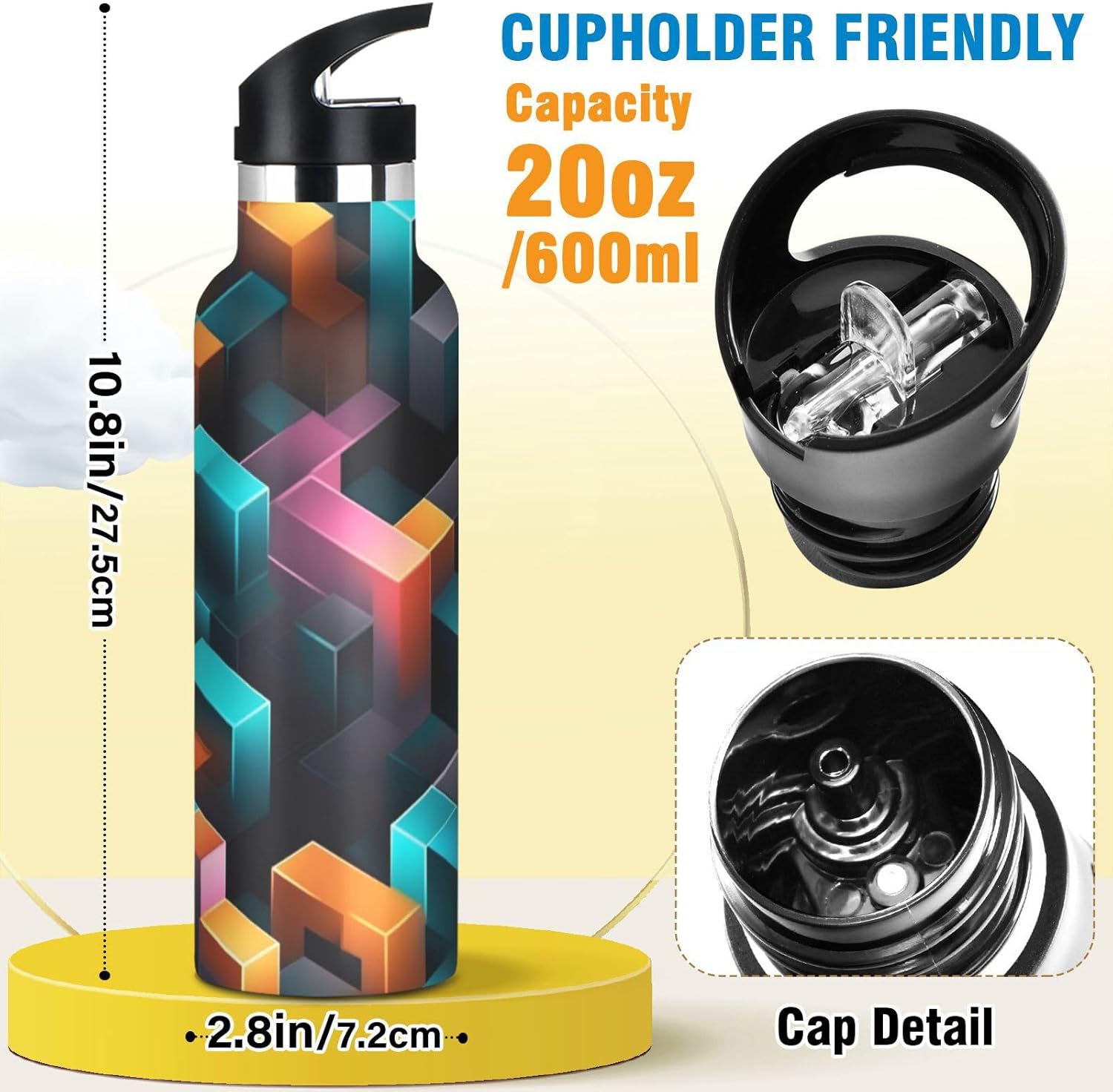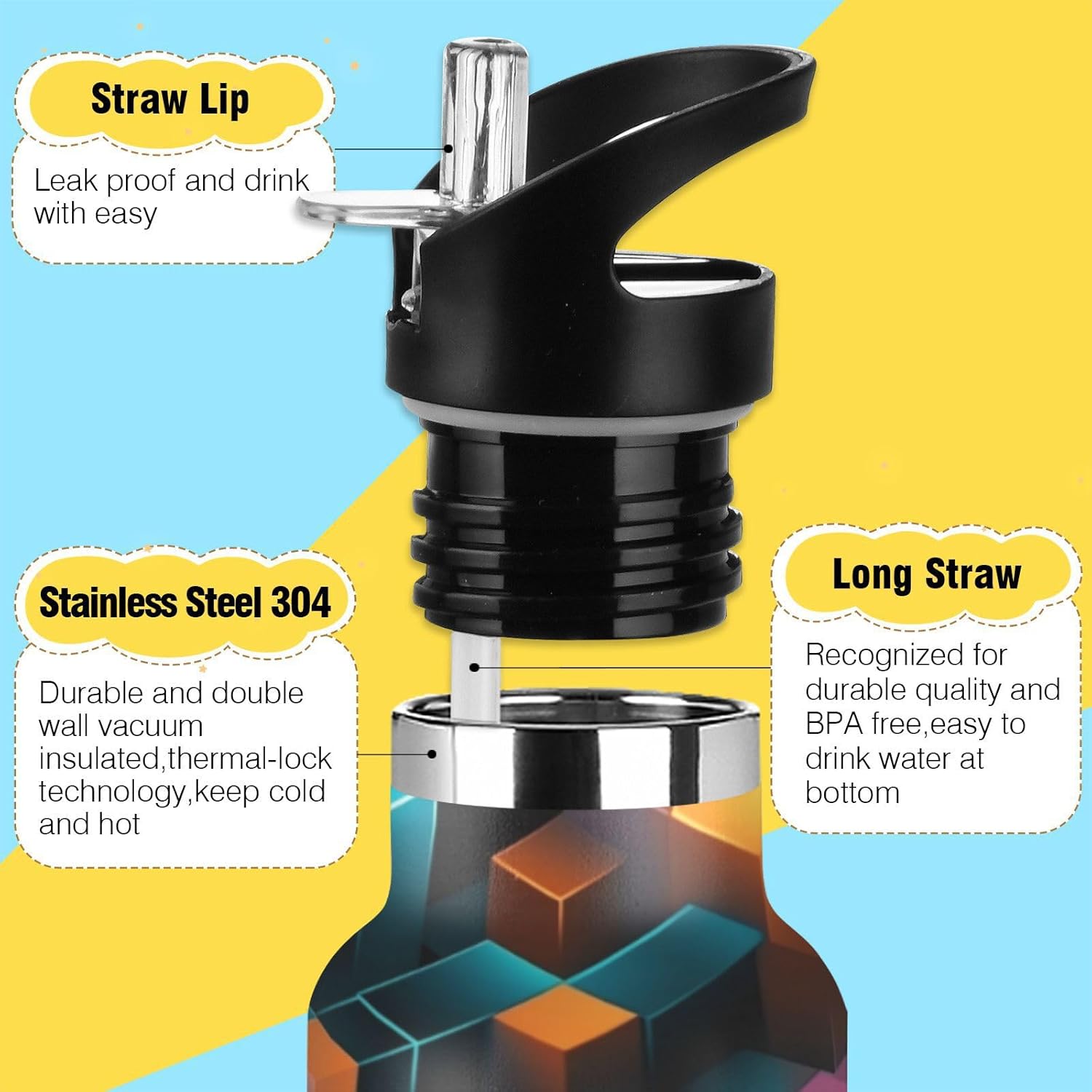 Modello Cubi Astratto Moderno Borraccia per Bambini in Acciaio Inossidabile Termica a Vuoto per Ragazzi e Ragazze (600 ml)