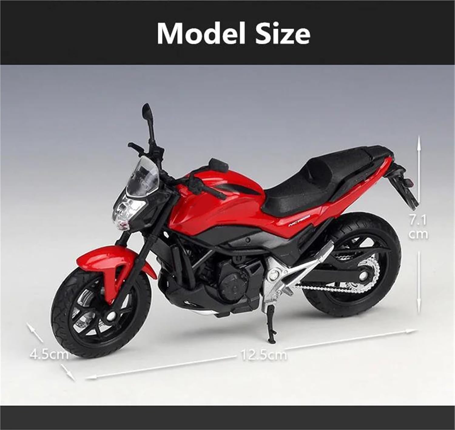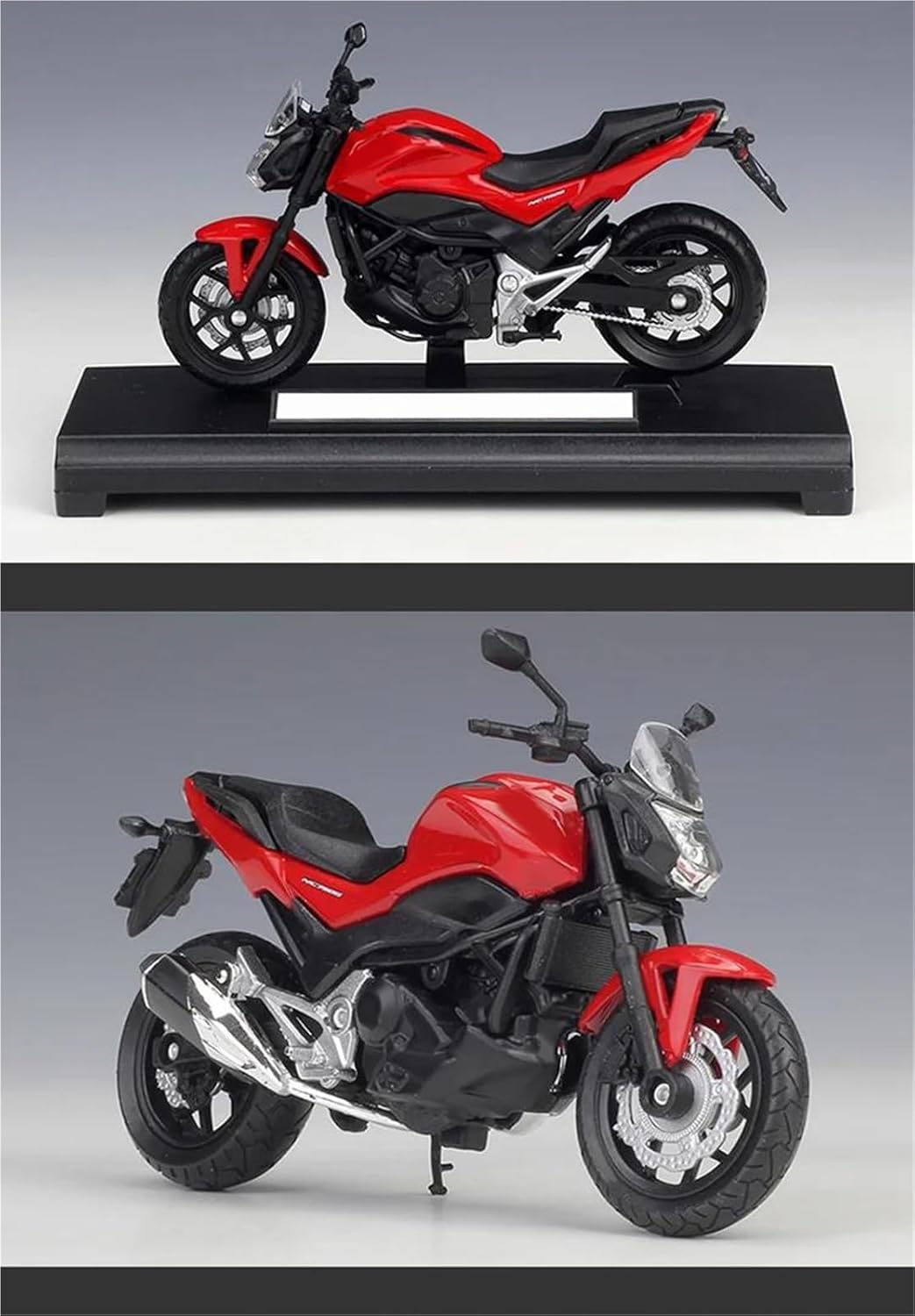 Modello di motocicletta per NC750S, la confezione include: 1 modello in lega Modello di auto giocattolo in scala 1:18, realizzato con precisione e attenzione a ogni dettaglio, questo modello di motocicletta offre una replica realistica dell'originale, perfetto per i giovani appassionati di motociclette che ammirano la cosa reale. Parti squisite progettate secondo le proporzioni dell'auto originale, cruscotto, pedali del freno e dell'acceleratore sono progettati per essere realistici e precisi. Modello di auto di simulazione La finitura liscia e senza sbavature e la vernice lucida e uniforme dimostrano una maestria artigianale eccezionale. Questo modello incarna lo stile di una motocicletta, soddisfacendo l'amore degli appassionati per i modelli nostalgici.
