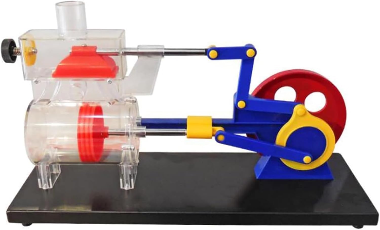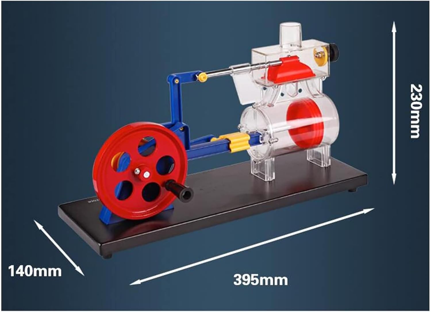 * Questo modello di motore a vapore appartiene ad un motore a vapore a doppia propulsione. Il vapore viene controllato modificando la valvola e l'aria aspirata da entrambe le estremità del cilindro può spingere alternativamente il pistone a funzionare. * Alcune parti sono progettate in trasparenza, il che è utile for osservare i dettagli di funzionamento di ciascuna parte in modo completo senza angoli morti. * Lo strumento è composto da cilindro, pistone, camera di vapore, valvola di inversione del flusso di vapore, meccanismo di biella a manovella, volano, staffa e piastra inferiore. * for facilitare l'osservazione del processo di lavoro del pistone in funzione e della valvola di inversione del flusso di vapore, il cilindro e la camera del vapore sono realizzati in plastica trasparente. * Sopra il cilindro è previsto un passaggio del vapore for il collegamento con la camera del vapore; un lato della camera del vapore è progettato con un meccanismo di regolazione della pressione del vapore for regolare la velocità di funzionamento della macchina e il volano è in ghisa.