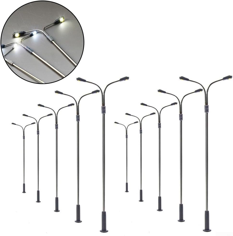 Modello in scala realistica: queste lampade bianche a due teste in scala OO HO sono progettate con un rapporto 1:100, misurano circa 1,1 cm di altezza. Perfetto per aggiungere un'illuminazione autentica ai layout di modellini ferroviari, diorami o scene in miniatura. ILLUMINAZIONE VERSATILE: ogni set include 10 lampioni a LED, fornendo ampie opzioni di illuminazione per i tuoi progetti di modello. Usali per illuminare piattaforme ferroviarie, strade, parchi o esterni di edifici nel tuo mondo in miniatura. Facile installazione: complete di fili e LED, queste lampade sono pronte per l'installazione. Funzionano con una tensione di alimentazione di 3 V, rendendoli compatibili con la maggior parte dei sistemi di alimentazione ferroviari modello. Ideale sia per principianti che per esperti. Dettagli realistici: realizzati con tubi in acciaio, questi lampioni offrono un aspetto realistico. Il design a due teste imita la vera illuminazione stradale, migliorando il realismo delle scene del tuo modello e creando un'atmosfera notturna accattivante. Multiuso: sebbene siano progettate principalmente per modellismo ferroviario, queste luci versatili sono adatte per vari progetti di modellazione. Utilizzali in modelli architettonici, installazioni ferroviarie da giardino o come elementi decorativi in progetti artigianali per aggiungere un tocco di illuminazione e fascino.