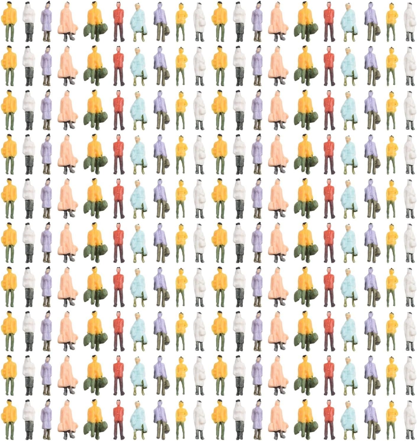 Figure di treno in scala: queste figure dipinte sono realizzate con materiali di alta qualità, sicurezza, rispetto dell'ambiente e durata. Colorazione realistica: con colorazione manuale, queste figure hanno colori realistici che soddisfano le esigenze delle aziende di modelli e degli appassionati. Migliora lo scenario: perfette per scene di modellini, queste figure danno vita alle piattaforme della stazione e alle scene di strada, aggiungendo vivacità ai tuoi display. Ottima collezione: un'ottima decorazione per case, scrivanie, salotti, cucine, ecc., queste figure possono anche essere regalate ad amici e compagni di classe. Specifiche multiple: disponibili in confezioni da 100 o 200, queste figure sono disponibili in scala 1:87 con un'altezza di circa 21-22 mm.