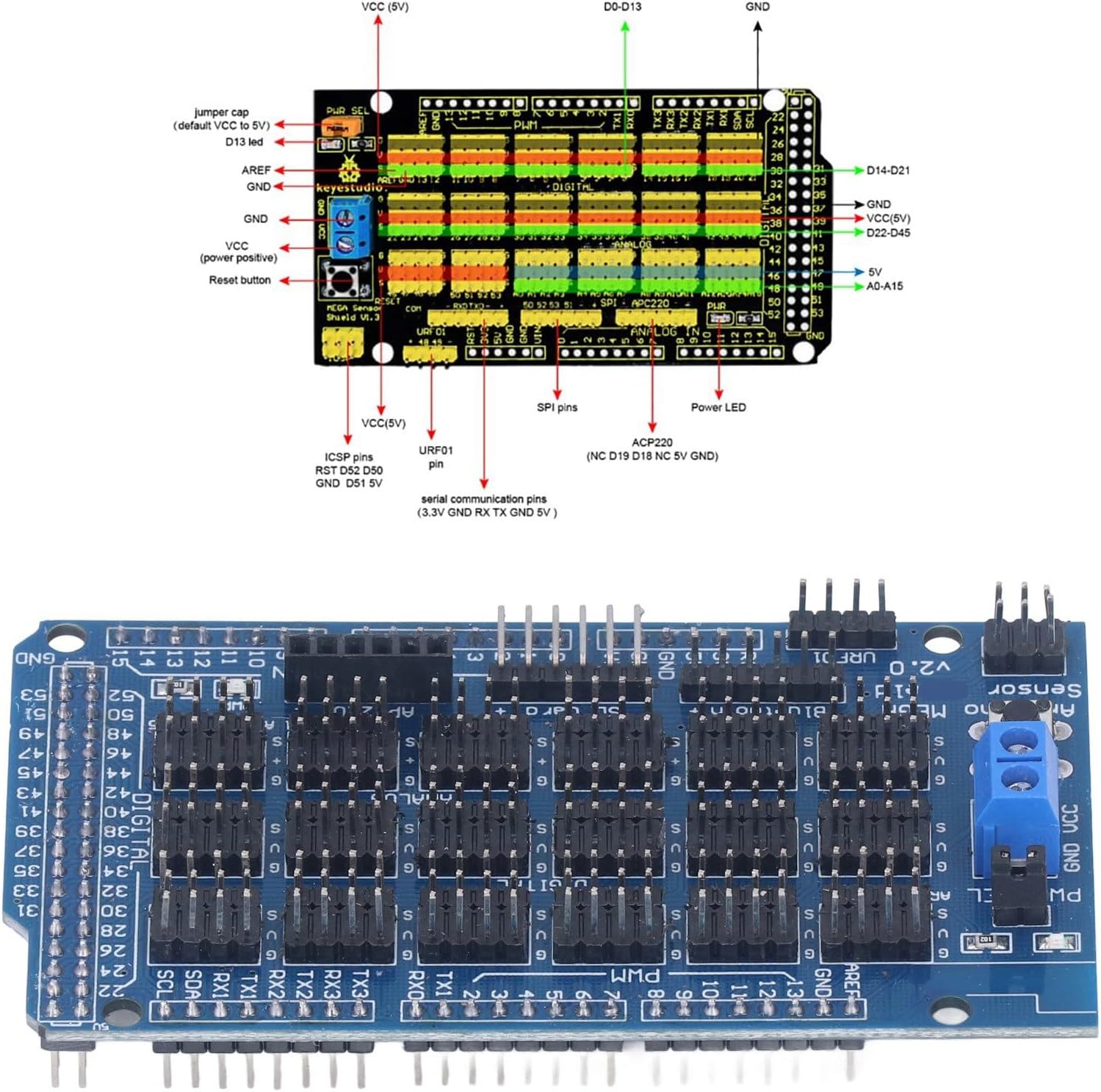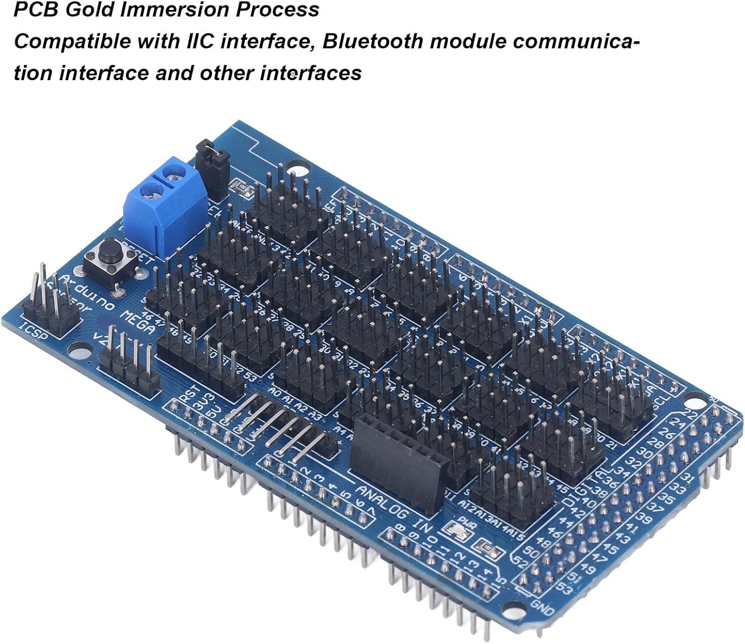 Fine fattura: è conforme alla progettazione standard della scheda di espansione e adotta anche il processo di immersione in oro PCB. Lavoro affidabile: appositamente progettato per Sensor Shield v1.0, questa scheda di espansione garantisce prestazioni di lavoro stabili. Corrispondenza perfetta: abilita la corrispondenza perfetta con interfaccia IIC, interfaccia di scudo a motore servo a 32 , ecc. Ampia applicazione: è possibile collegare la scheda di espansione a vari moduli, come sensore, relè, pulsante e così via. Facile installare: progettato per avere una dimensione compatta e anche un peso leggero, l'installazione è molto conveniente.