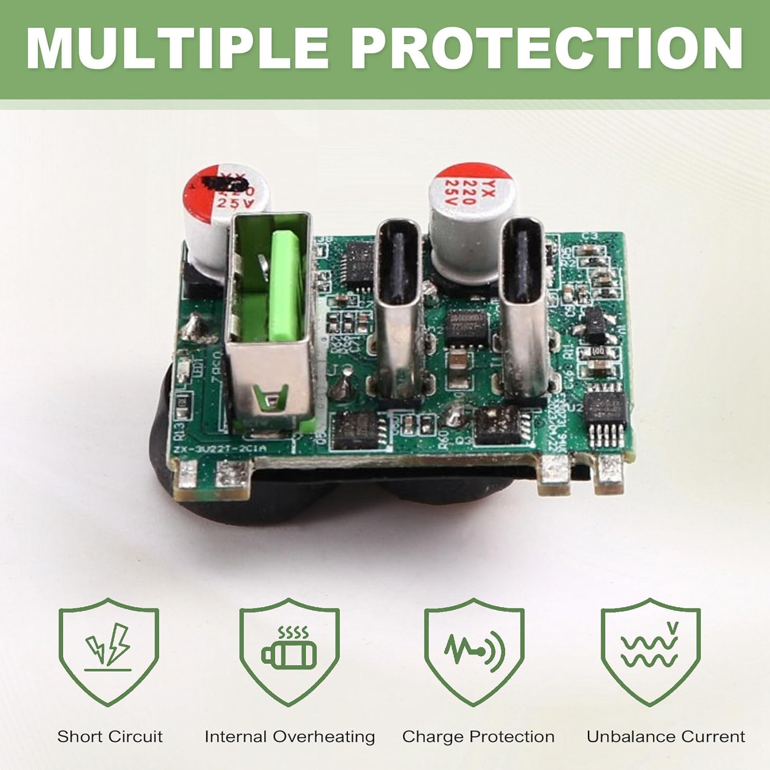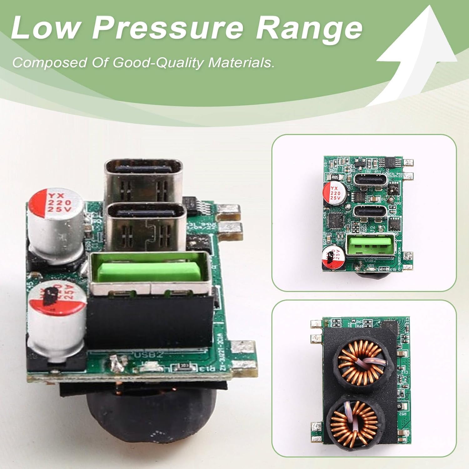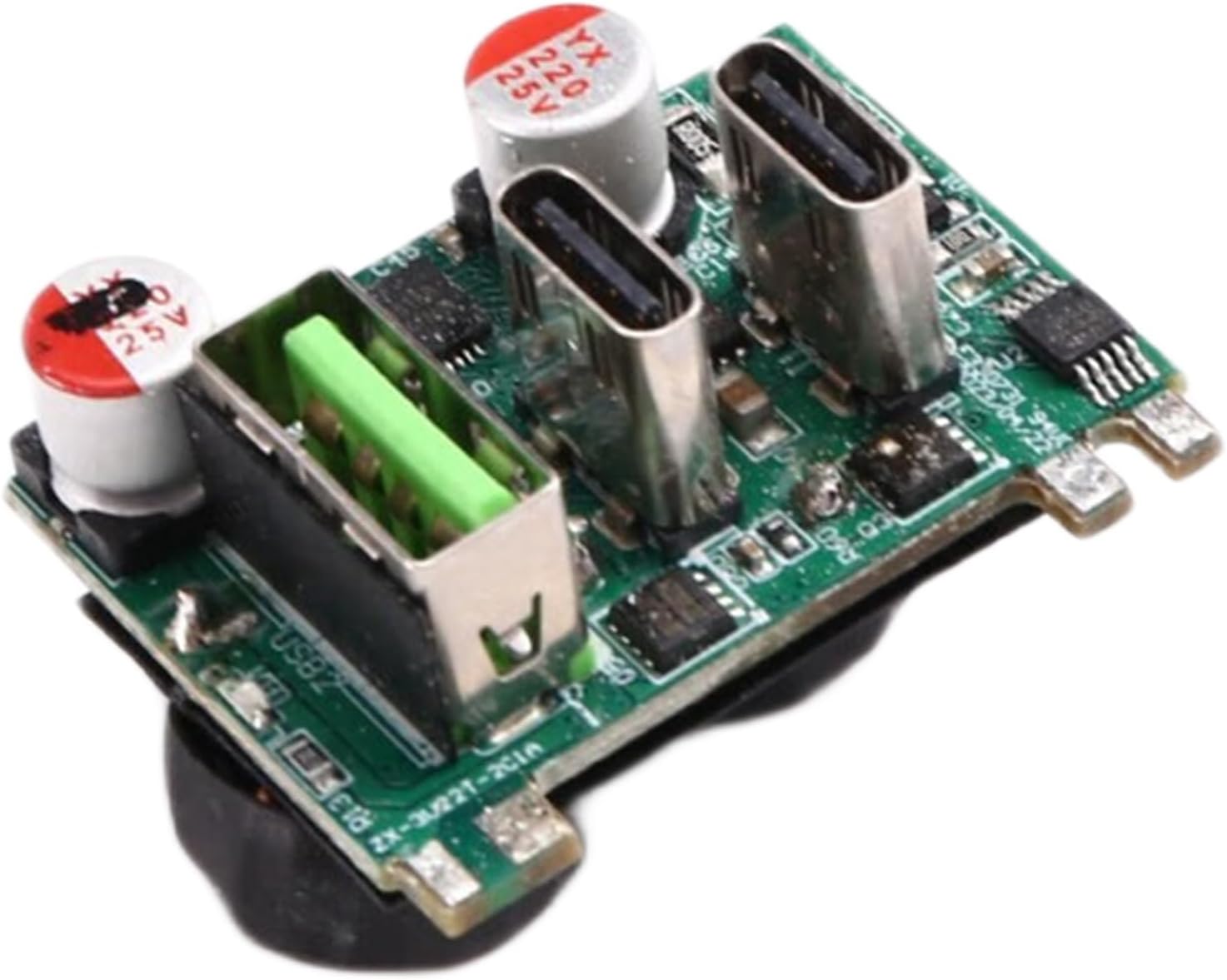 Questo modulo di ricarica rapida è dotato di chip SW3516P. Si tratta di un chip di ricarica a due porte altamente integrato con più protocolli di ricarica rapida. Ha un ingresso CC di 6,5-24 V e supporta l'uscita di ricarica rapida di tutte le porte A+C. Supporta il limite di corrente indipendente delle doppie porte. Il chip SW3516P un convertitore download sincrono 5A ad alta efficienza per supportare più protocolli di ricarica rapida come /PD/QC/AFC/FCP/SCP/PE/SFCP4 con una potenza PD massima di 100 W, CC/CV e di gestione a doppia porta. Si tratta di una soluzione di carico a doppia porta ad alte prestazioni con più protocolli di ricarica rapida. Inoltre, induttori a doppio avvolgimento e condensatori di filtro vengono utilizzati per ridurre l'ondulazione di carico.