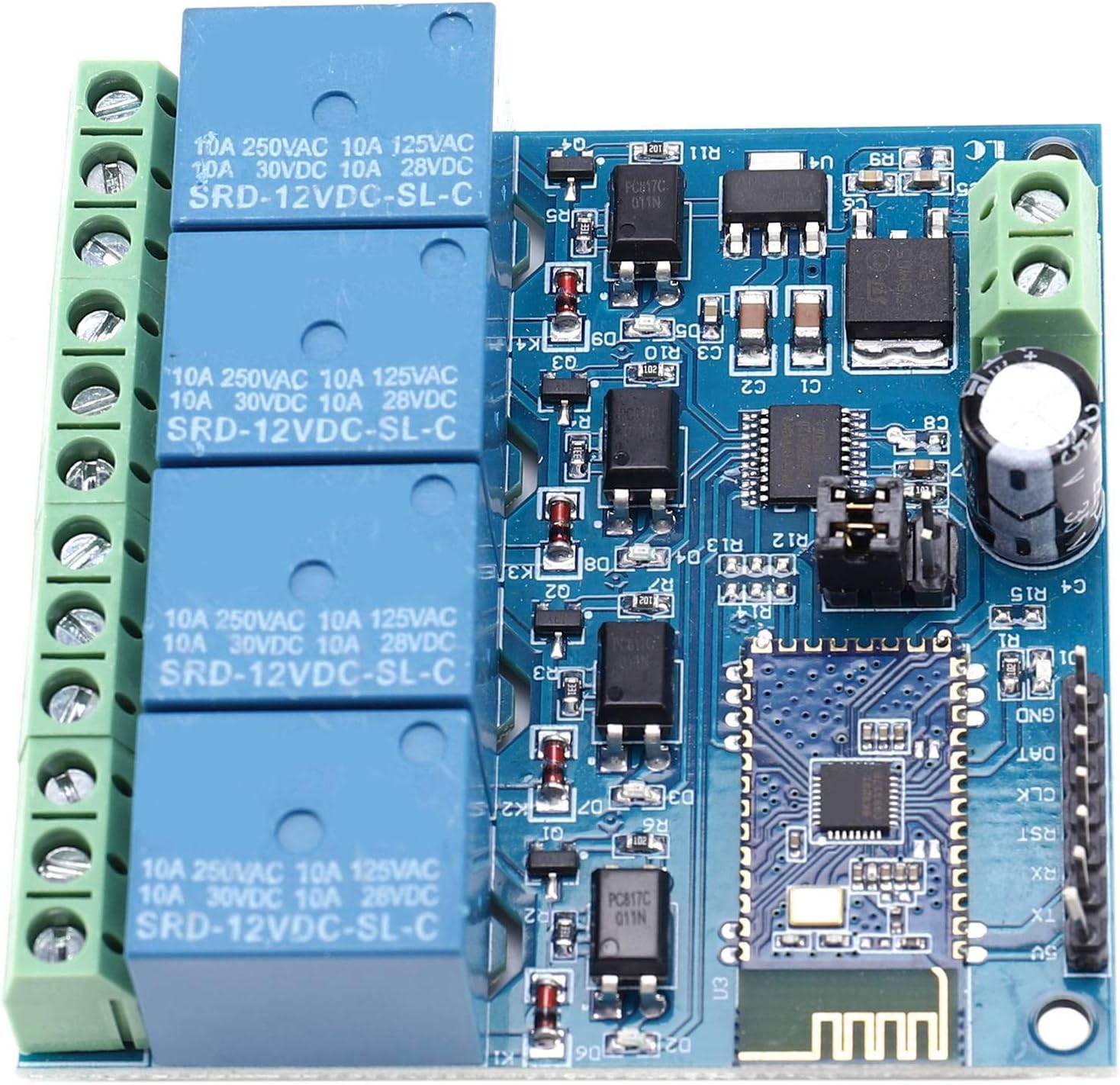 Fonte di alimentazione: DC Voltaggio: 5 V. Utilizzo: telecomunicazione Teoria: relè bluetooth Il modulo relè Bluetooth a 4 canali LC 12V è dotato di modulo slave Bluetooth 2.1 SPP-C e MCU ad alte prestazioni a 8 bit, è possibile controllare direttamente il relè con l'APP cellulare.