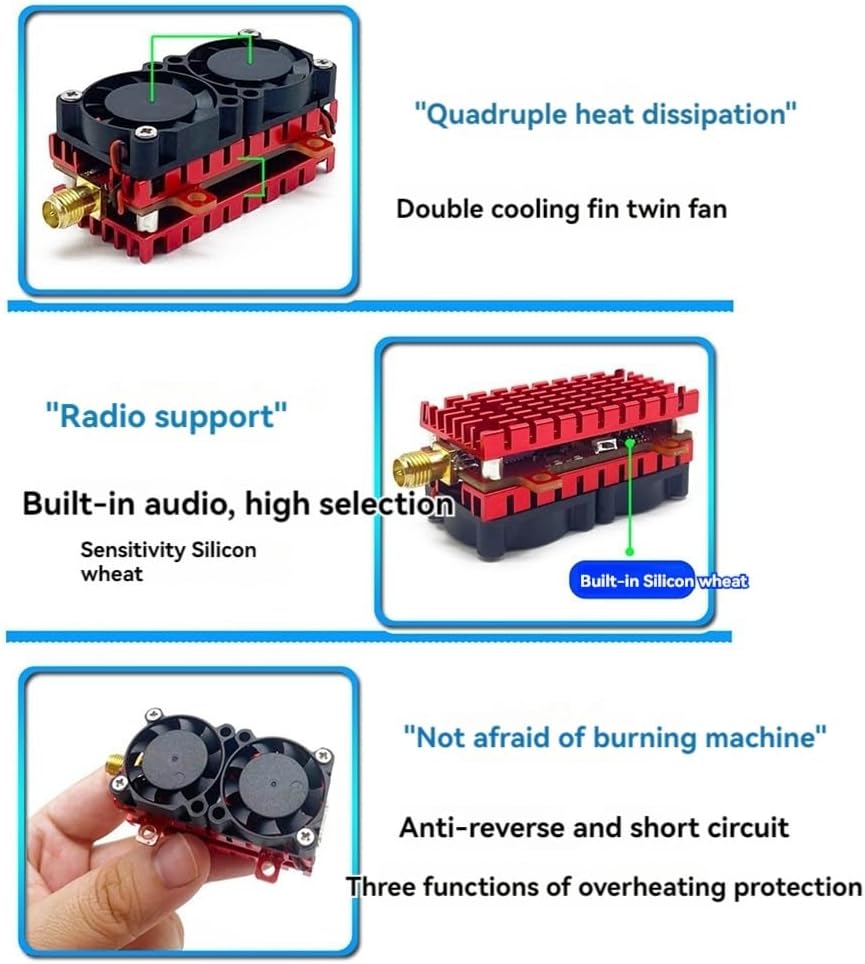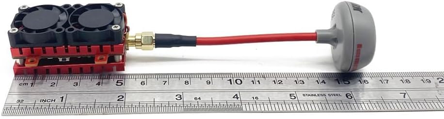 Caratteristiche: doppio dissipatore di + doppia ventola di raffreddamento. Modulo trasmettitore FPV VTX 5W 5.8G 48 canali con telecamera 1500TVL, doppia ventola di raffreddamento, microfono integrato per droni da FPV. Indicazione del modulo: pulsante singolo, indicatore luminoso doppio (rosso e blu) Antenna: connettore SMA standard, 2dBi. Terminale di cablaggio: 6 fili, JST + 1,25*3 pin interfaccia telecamera esterna. Frequenza di : 5,8 G;Canale di : 48 CH;Tensione di : 7 - 36 V;Tensione di uscita: 5 V/200 mA;Potenza di uscita: 200 mW/500 mW/1,2 W/5 W regolabile Descrizione del pulsante: Dopo l'accensione, premere a lungo il pulsante per scorrere e regolare la frequenza del canale, il gruppo di canali e la potenza. Premere a lungo l'interruttore (luce ), premere brevemente l'interruttore (luce blu), premere due volte per passare alla modalità Pit.