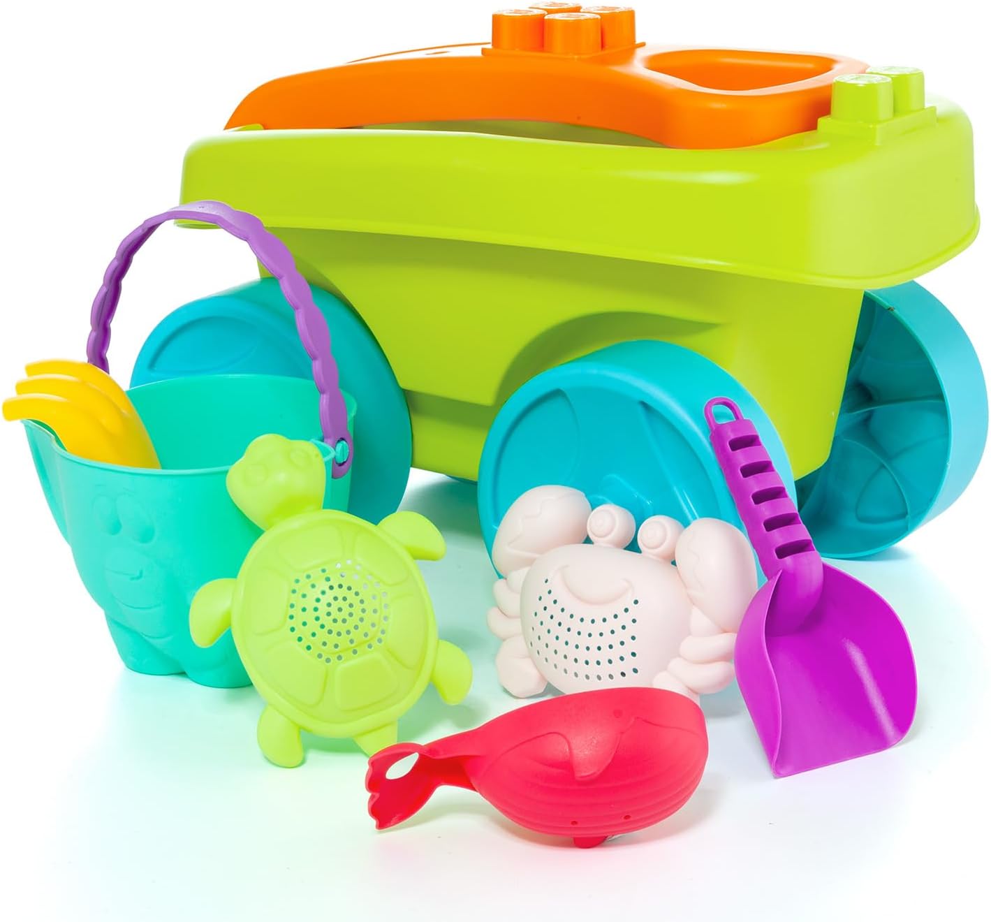 Carrello da spiaggia: perfetto per trasportare e organizzare gli accessori da spiaggia per bambini. Materiali robusti: realizzati con materiali durevoli per resistere al gioco intenso. Facile da trasportare: trolley leggero e maneggevole, ideale per i bambini. Regalo estivo ideale: perfetto per giornate divertenti in spiaggia o nella sabbiera. Set completo di accessori: include un secchio, una pala, un rastrello e stampi per la sabbia a forma di tartaruga, granchio e pesce, garantendo ore di divertimento.