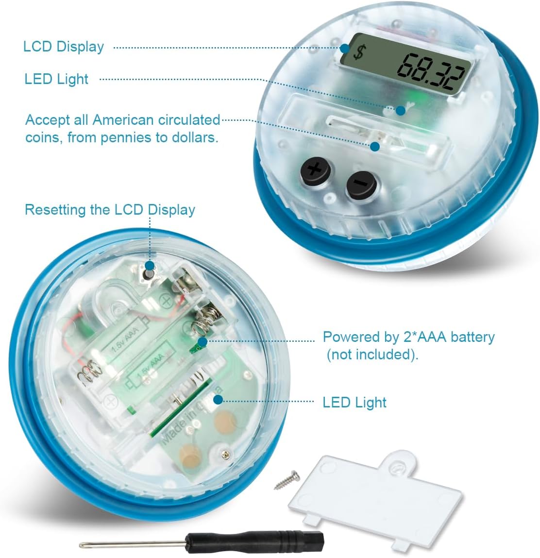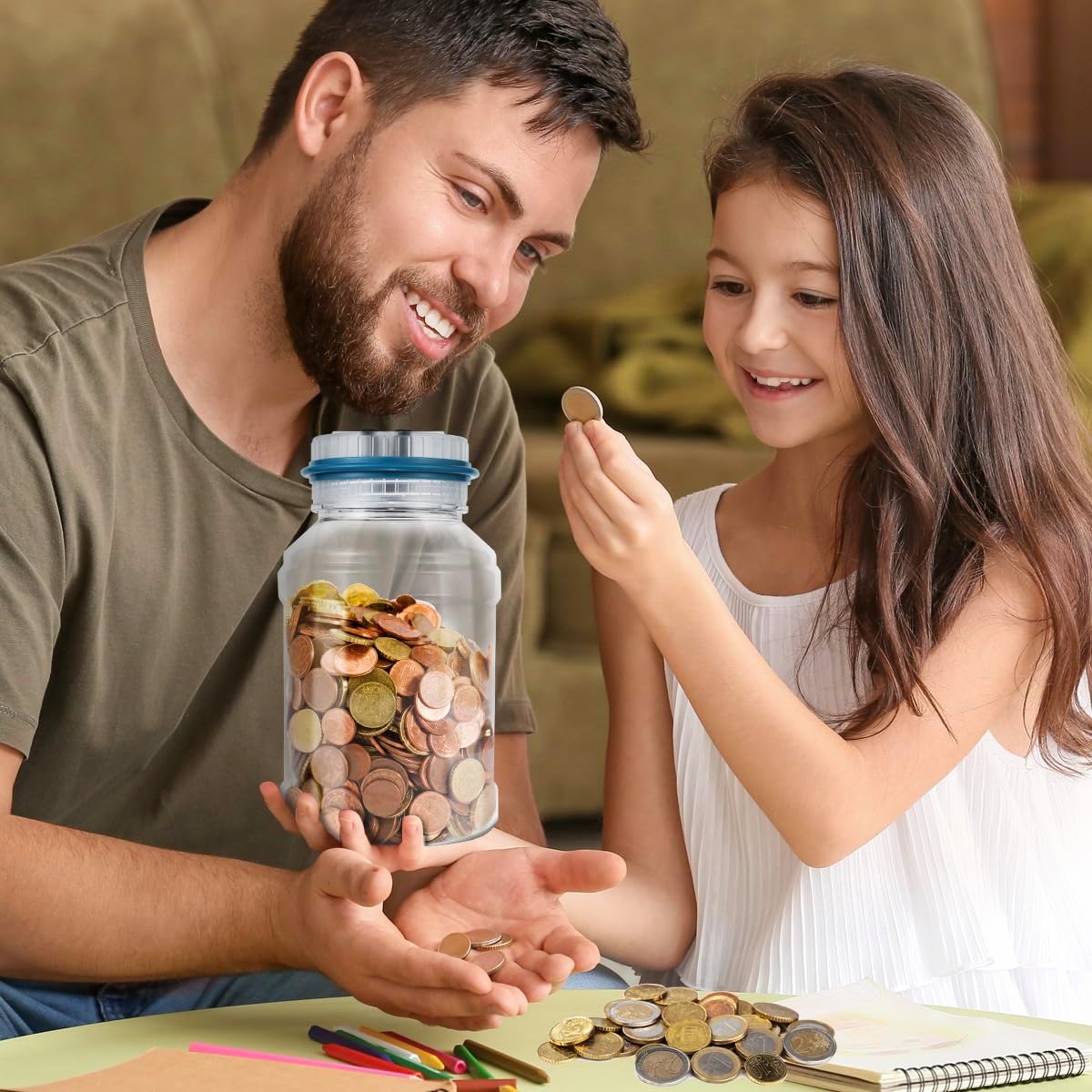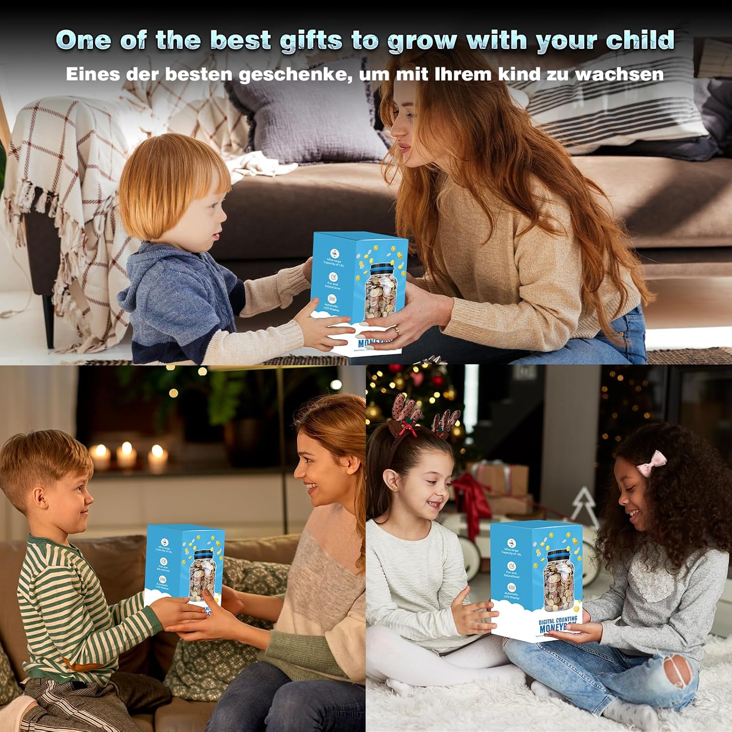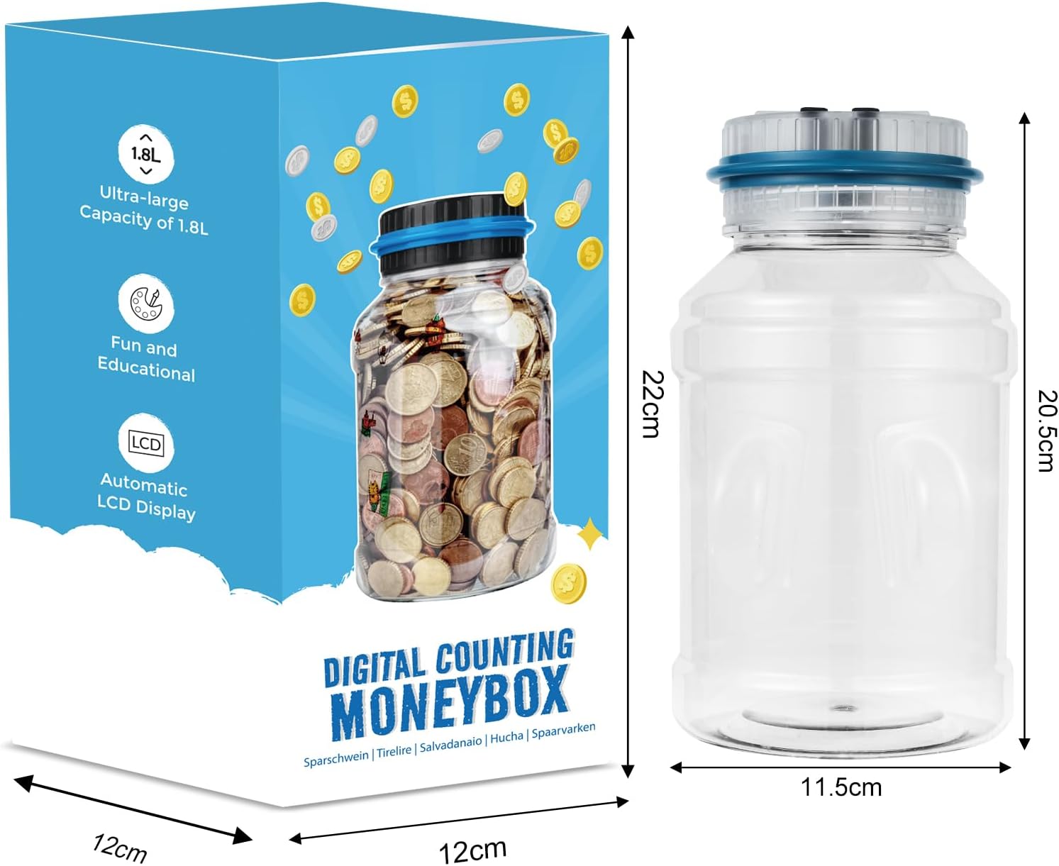 Regalo perfetto – Il salvadanaio contamonete MOMMED è un dispositivo tutto-in-uno pratico per contare e conservare le monete. Supporta tutte le monete in euro in circolazione e può contenere circa 800–1000 monete, a seconda della combinazione. Funziona con 2 batterie AAA (non incluse). Design moderno & Display LCD colorato con coperchio trasparente – Realizzato in plastica ABS di alta qualità, inodore. Il coperchio trasparente è stato migliorato: quando si inseriscono le monete, si illuminano sette colori, rendendo il risparmio più divertente. Facile da usare – Il salvadanaio per bambini ha un pulsante +/- sul coperchio. Quando si rimuovono monete o si inseriscono banconote, l’importo può essere facilmente regolato per mantenere il totale corretto. Importanza del risparmio – Risparmiare per grandi sogni! Promuove buone abitudini di risparmio nei bambini. Questo salvadanaio è la scelta perfetta come regalo per Natale, Capodanno o compleanni – per bambini, ragazze, ragazzi e adulti. Servizio clienti affidabile – Ci impegniamo a offrire un’esperienza di acquisto piacevole con il nostro salvadanaio automatico contamonete. In caso di domande o problemi, contattaci e risponderemo rapidamente.