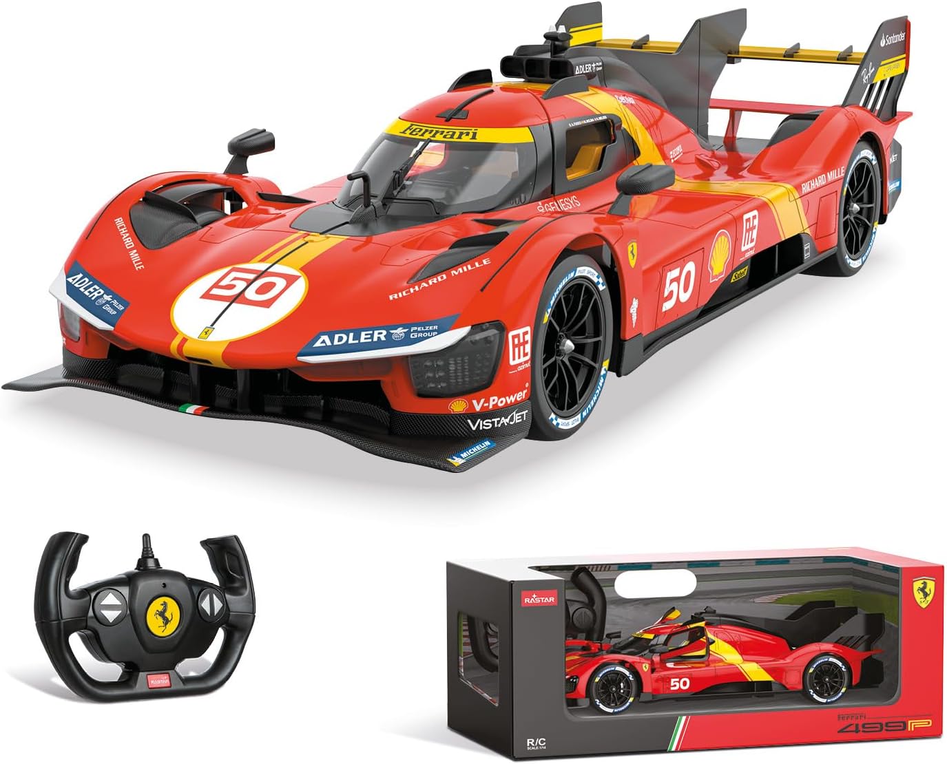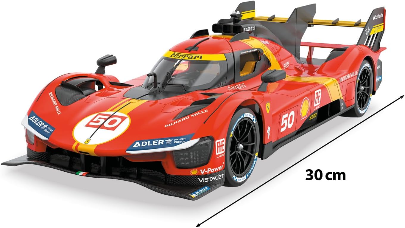 Design ufficiale Ferrari 499 P Le Mans Qualità elevata - come tutta la gamma di giocattoli marchiati mondo la qualità e la cura dei dettagli è ai massimi livelli; auto dalla scocca dura e molto resistente agli urti; modello reso ancora più simile al reale grazie ai dettagli ben definiti Radiocomando - la macchina telecomandata presenta un radiocomando rc a frequenza 2.4 GHz per un utilizzo senza interferenze, 7 funzioni di guida: avanti-sinistra-destra, indietro-sinistra-destra, stop; controller innovativo a doppio tasto per un utilizzo immediato ed intuitivo Batterie - questa auto radiocomandata per bambini funziona grazie a 5 batterie AA (non incluse nella confezione) e 2 batterie AA per il radiocomando (non incluse nella confezione) Ottimale per un regalo - macchinina telecomandata ideale da regalare ai vostri bambini per ogni occasione: natale, compleanno o qualunque cerimonia o festa con questo pacchetto farete sempre un' ottima figura