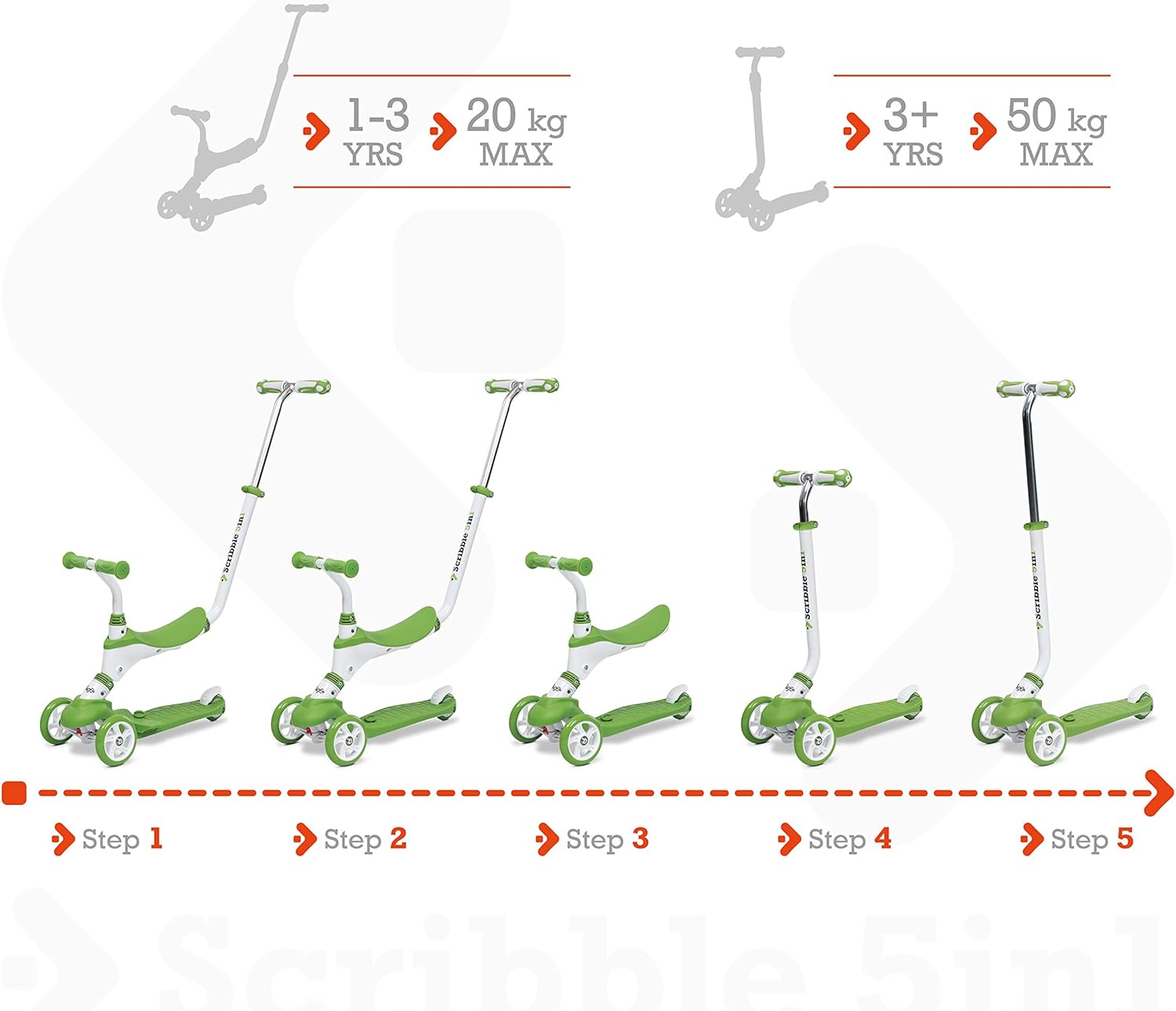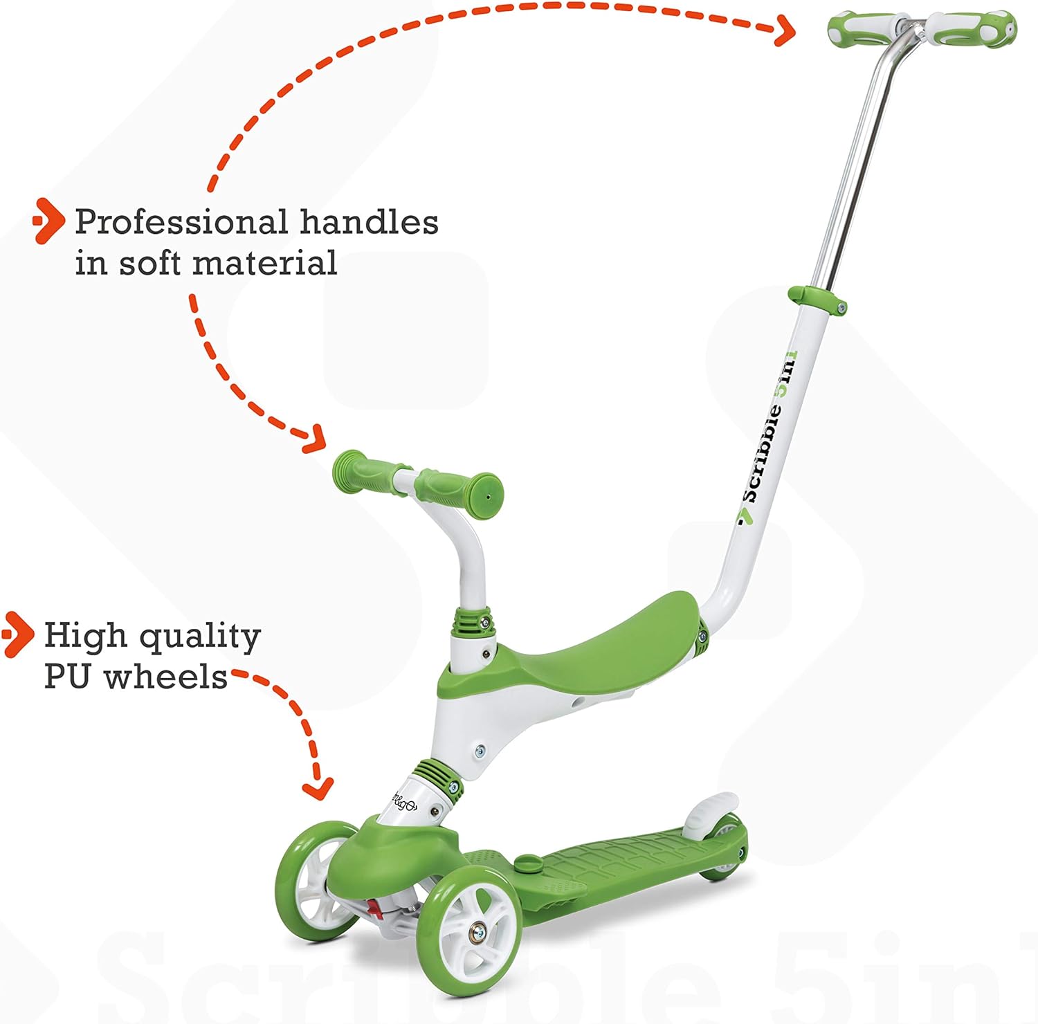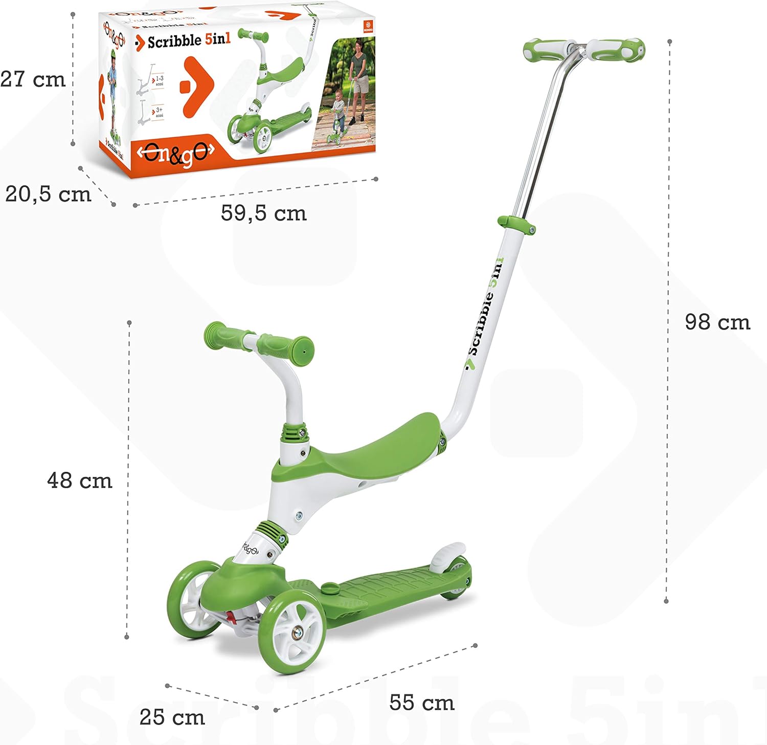 Scribble ongo 5in1 - questo monopattino “cinque in uno” ha una facile installazione: Dispone di un asta pieghevole che lo rende comodissimo da trasportare e/o caricare in macchina; il sedile estraibile si può staccare dalla struttura una volta che il bambino/bambina sarà cresciuto/a e potrà utilizzarlo come monopattino; a completare il tutto manopole professionali in materiale morbido e ruote di alta qualità Alta qualità - le tre ruote del monopattino sono realizzate in materiale pu, quindi hanno una grande capacità di presa sull'asfalto e garantiscono una maggiore scorrevolezza; la seduta, anch'essa comoda e resistente accompagnerà la crescita del vostro bambino/bambina fin dall'età di un anno; l'impugnatura realizzata con un nuovo materiale morbido e di protezione ambientale tpr di alta qualità, che protegge le mani del bambino e del genitore, pur mantenendo un ottimo grip 5 funzioni in 1 - lo scooter/ monopattino può svolgere 5 funzioni: un'articolo completo che si può trasformare con il tempo, durante il percorso di crescita del bimbo/bimba; i primi tre step sono perfetti per i bambini di età compresa tra i 12 mesi fino ai 36 (20 kg massimo); il quarto ed il quinto step sono indicati per i bambini dai 3 anni in su (50 kg massimo) Base pedana robusta -; la pedana che sta alla base è realizzata in materiale plastico duro e resistente; ha un elevata capacità di carico sopporta fino a 50 kg di peso Regalo perfetto - lo scribbel 5in1 della ongo è senza dubbio l'ideale da regalare ai vostri bambini per ogni occasione: natale, compleanno o qualunque cerimonia o festa; un regalo completo che verrà sfruttato per lungo tempo regalando questo prodotto farete senza dubbio una piacevole sorpresa