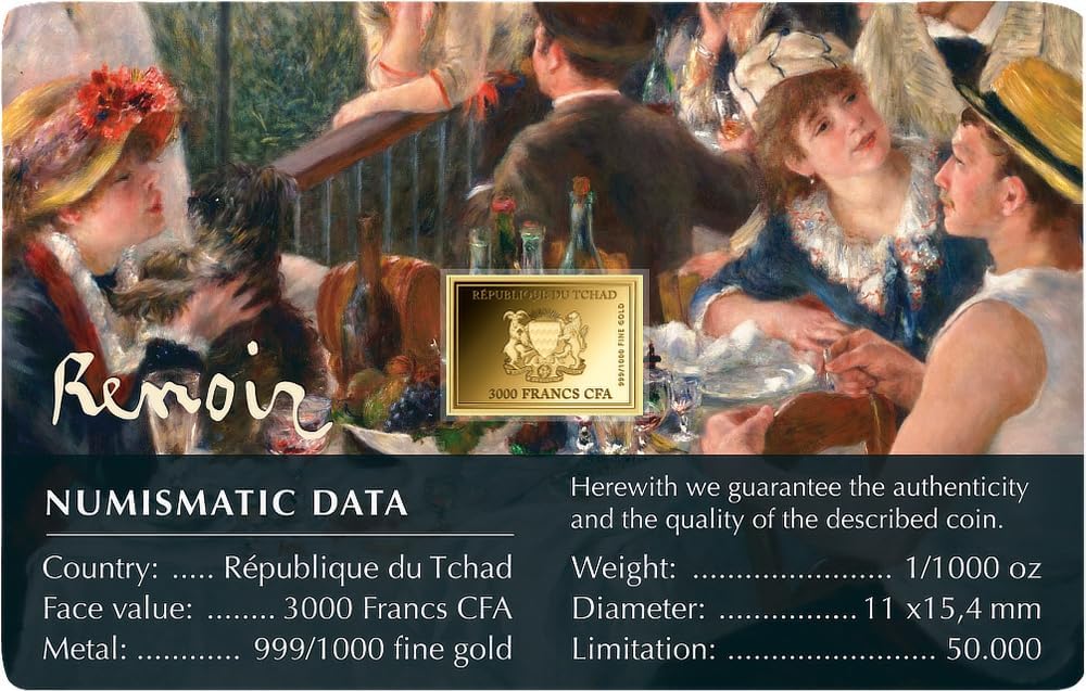 ALTA QUALITÀ - Il prodotto è realizzato con l'oro fino più puro! DESIGN – Puoi vedere il famoso dipinto “La colazione dei rematori” di Pierre-Auguste Renoir! LIMITATA – Edizione di soli 50.000 pezzi in tutto il mondo! CONSERVAZIONE – La consegna avviene in una moneta card con certificato di autenticità!