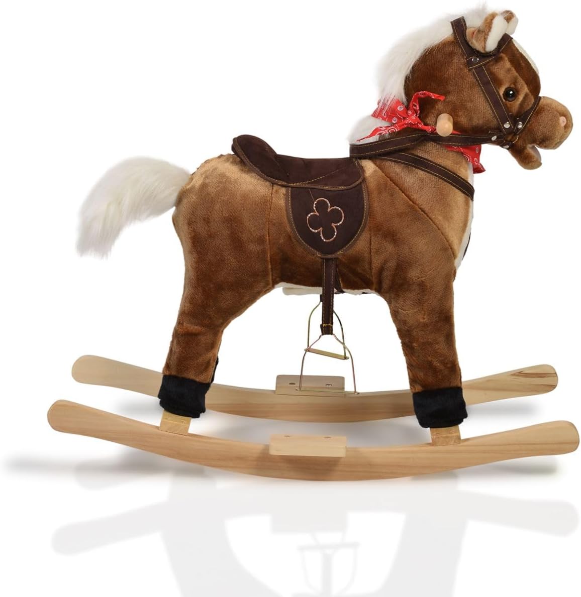 Mostra cippatrice a cavallo con guide e manici in legno con sella, staffa e briglia felpato premendo l'orecchio, la bocca e la coda si muove. Rumori dei cavalli (batterie non incluse)