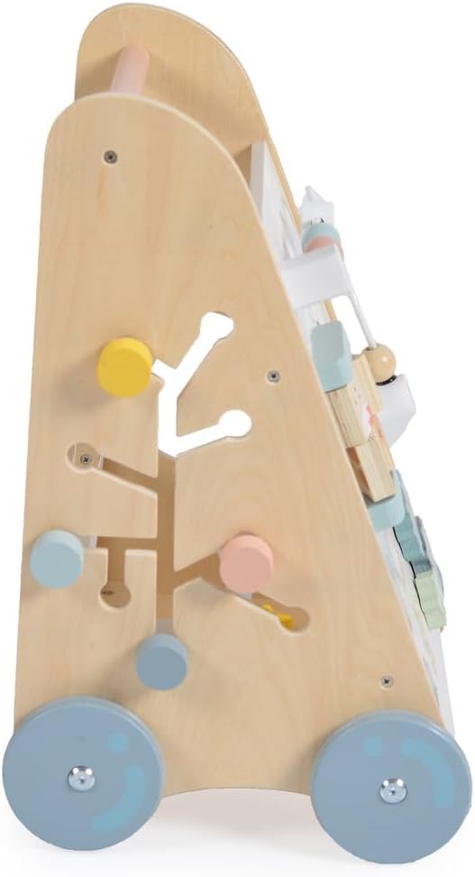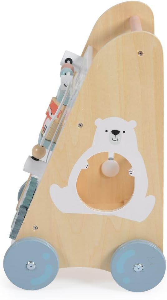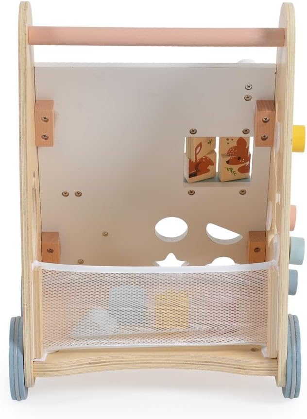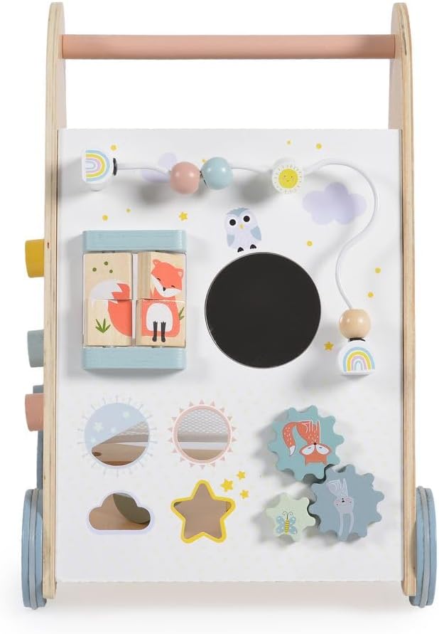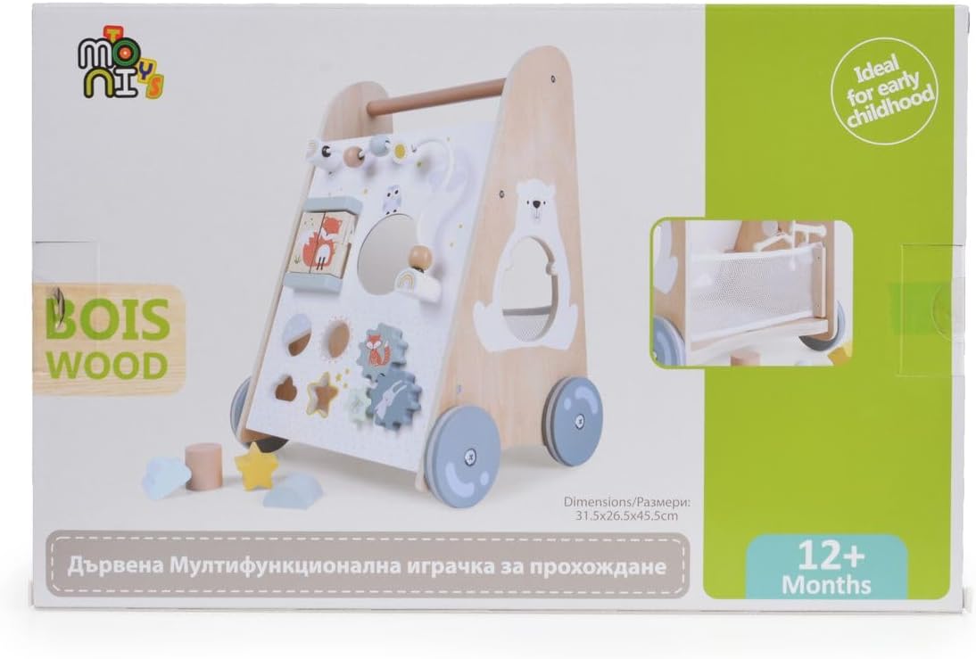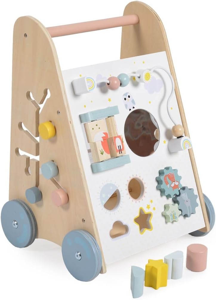 Carrozzina da gioco e da passeggio in legno, per bambini dai 12 mesi in su sostiene i primi tentativi di stare in piedi, colorati, interessanti e funzionali può essere giocato da seduti, molto stabile, centro di gioco per girare, premere e afferrare ingranaggi, rulli, palle, bottoni, si imparano le abilità motorie nella parte posteriore con una rete per conservare le forme, gioco di plug-in con forme diverse, molto da scoprire