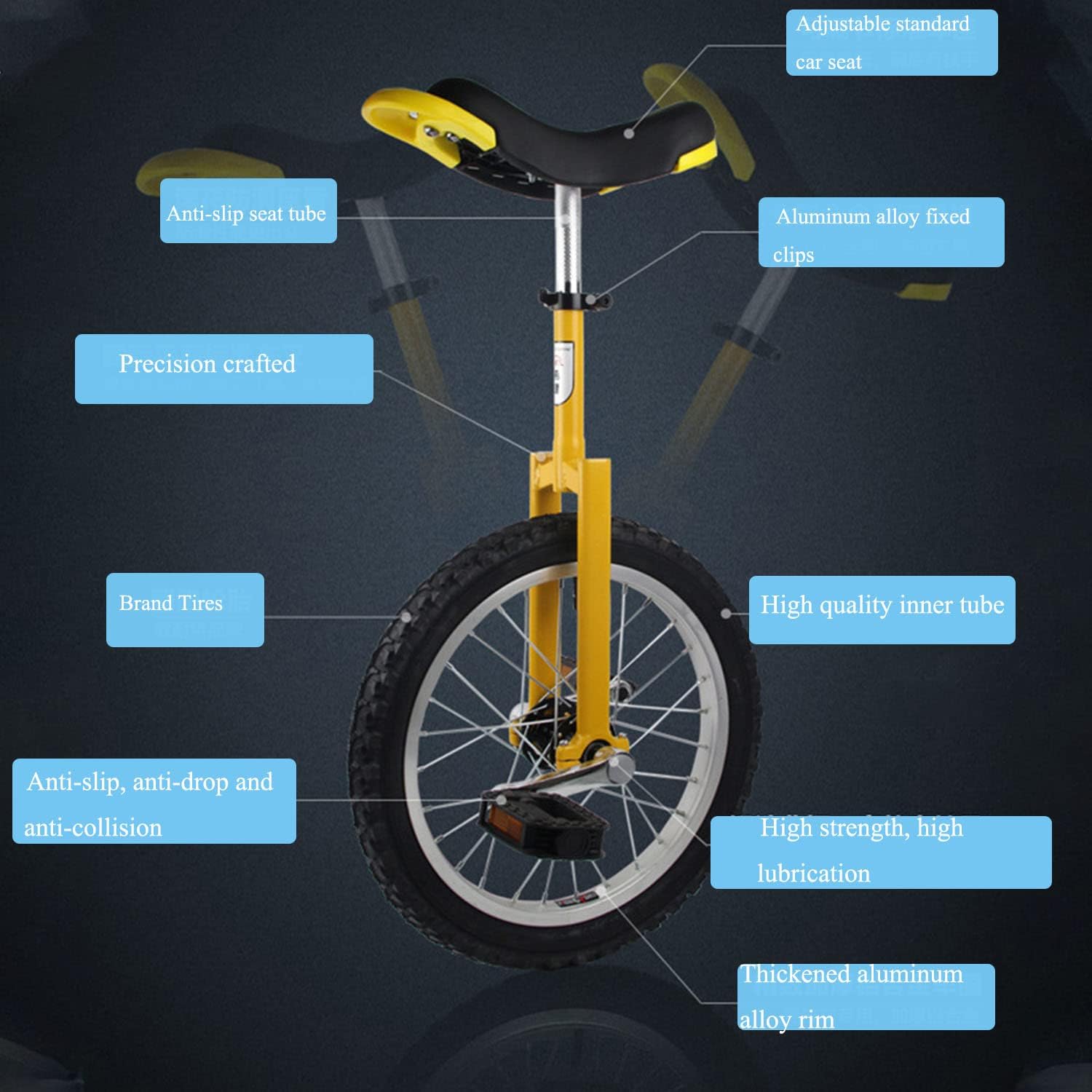 Ruote da 16 pollici (pneumatici da 16 pollici x 2.125 pollici); Colori: rosso, giallo, blu, viola Limite di peso: 100 kg per altezza da 45 a 61 pollici Design ergonomico, morbido e confortevole; modellatura una tantum senza giunzioni, non facile da indossare; presa più comoda, guida più sicura; leva di regolazione estesa, ampio campo di regolazione. Design razionale secondo la fisiologia e le caratteristiche sportive Adatto a principianti e professionisti, uomini e donne