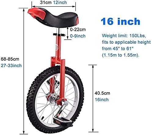 Monociclo per adulti Bambini Rosso Monociclo da allenamento 16 18 20 pollici Ruote per bambini Ragazze Ragazzi Bicicletta per bambini resistente Sedile regolabile Capacità di carico 150 kg / 330 libbre (Colore: Rosso, G