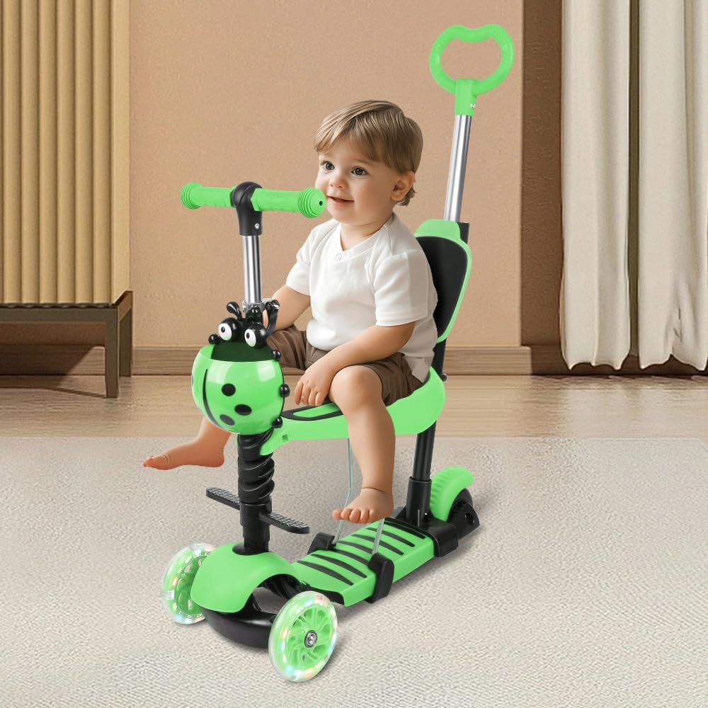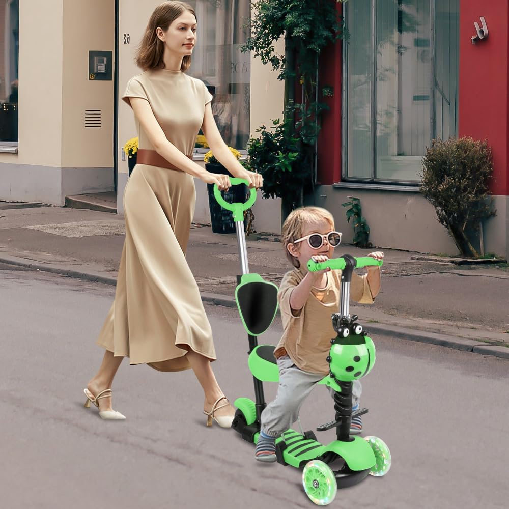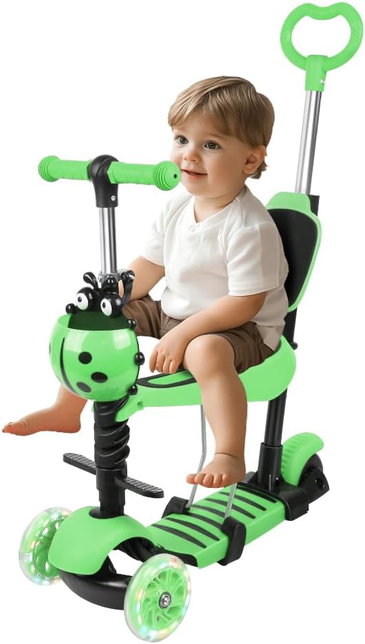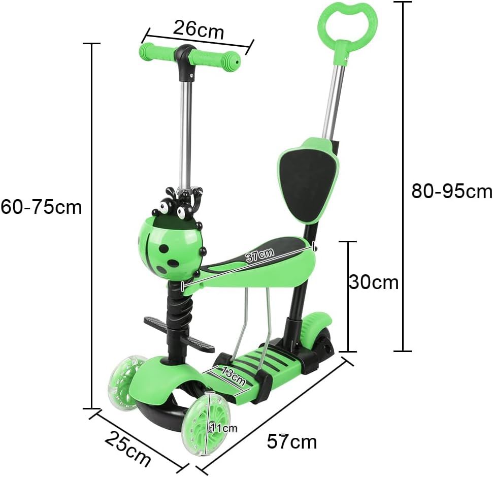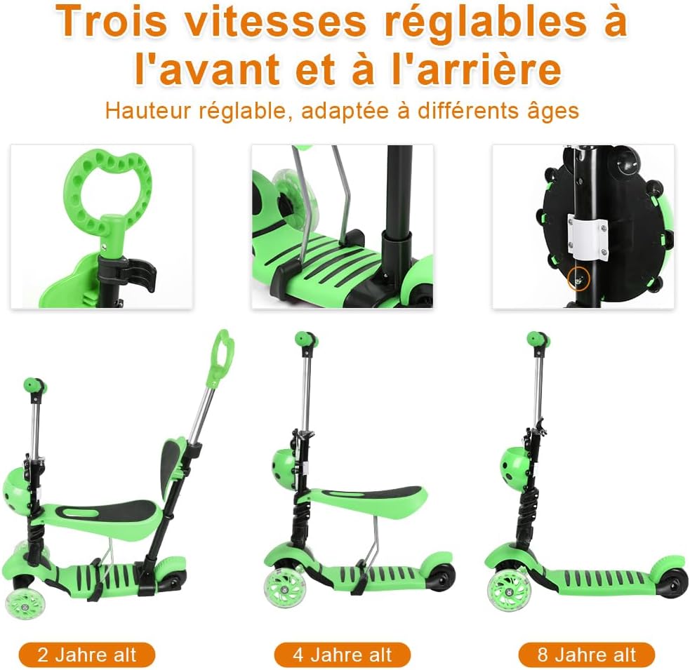 Monopattino pieghevole: monopattino 5 in 1, potenza + sedile, regolazione a tre velocità. Si ripiega velocemente quando non viene utilizzato, risparmia spazio ed è quindi facile da portare con sé. 💙Sedile tutto in uno: monopattino multifunzionale staccabile. Due modi di giocare: seduto e in piedi. Sicuro, stabile e confortevole. Sedile ergonomico, liscio e senza bave, comodo per sedersi. Sicuro e durevole: materiale: lega di alluminio + PU + plastica. Un'ampia piattaforma, la forma antiscivolo e la struttura a triciclo garantiscono stabilità. Gomma rinforzata contro urti e usura, flash lucido in PU, antipuleggia, flash magnetico senza batteria. Regolabile in altezza: questo monopattino per bambini ha 3 altezze regolabili: 68 - 73 - 78 cm. Questo monopattino è teoricamente adatto a bambini dai 2 agli 8 anni, ma l'altezza del bambino è diversa per ogni età, si consiglia di scegliere in base all'altezza e al peso del bambino, si consiglia che l'altezza del bambino sia 85-120 cm. Carico massimo dell'intero veicolo: 50 kg, carico massimo del sedile: 20 kg. Ruota luminosa a basso rumore: la ruota ha una ruota flash silenziosa da 5 cm per l'ingrandimento, silenziosa e resistente all'usura, buona stabilità dell'equilibrio. Monopattino con maniglia di spinta, trasformabile in modalità push-up.