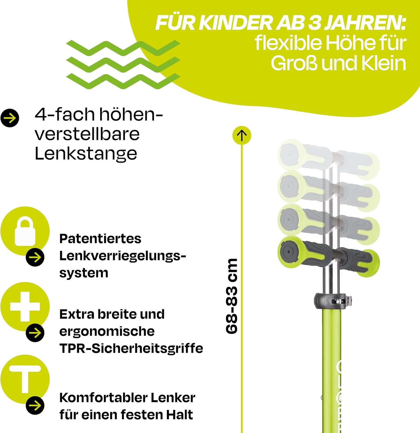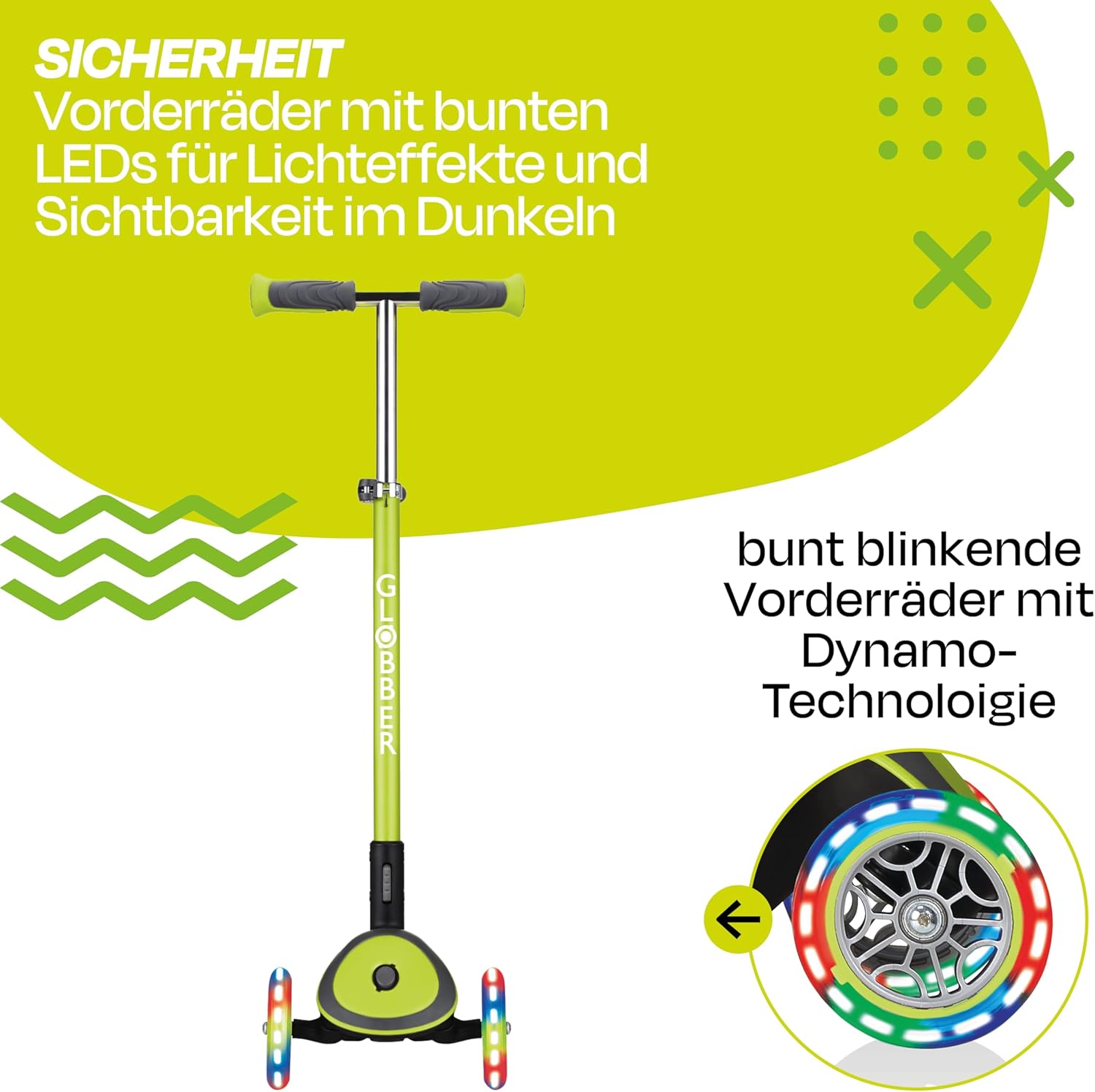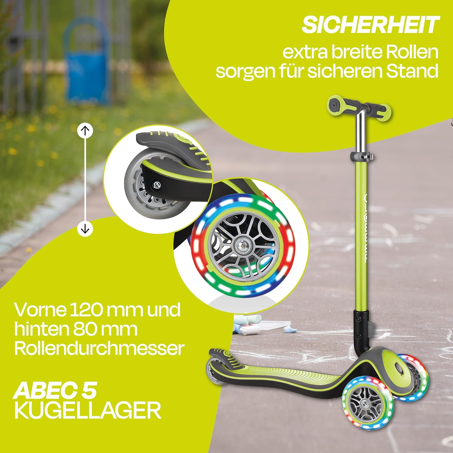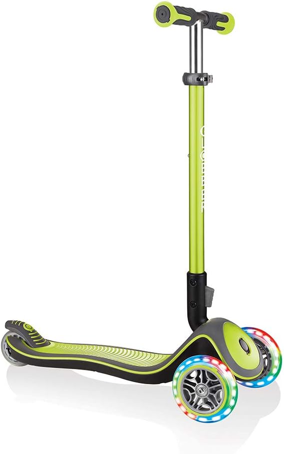 LUCI ELITE DELUXE - Monopattino a 3 ruote dal ritmo frenetico con ruote luminose per bambini fantastici. Grazie al meccanismo di chiusura ellittico brevettato, lo scooter può essere ripiegato rapidamente e facilmente dopo l'uso premendo un pulsante e può essere facilmente tirato dietro in modalità trolley. Divertimento di guida con comfort: con un diametro del rullo di 120 mm davanti/80 mm dietro, elevato ritorno, fusione in PU e cuscinetto a sfere ABEC 5, il massimo comfort è garantito. Le ruote anteriori a LED dell'ELITE DELUXE LIGHTS creano un effetto luminoso permanentemente colorato (tecnologia dinamo) durante la guida e forniscono fantastici effetti luminosi durante la guida. Più veloce guidi, più luminose brillano le luci a LED. Più sicurezza: il freno a frizione della ruota posteriore ottimizzato ed extra largo garantisce un arresto sicuro anche durante la guida ad alta velocità. Il ponte rinforzato ed extra profondo con battistrada antiscivolo bicolore è particolarmente confortevole, offre una presa ottimale e un appoggio sicuro ad ogni viaggio. Il bloccasterzo brevettato e commutabile fissa il sistema di sterzo delle due ruote anteriori in modo che lo scooter si muova solo avanti e indietro. In questo modo i bambini imparano in modo sicuro e veloce. Per grandi e piccini: il manubrio in alluminio anodizzato colorato è regolabile in altezza in 4 direzioni tra 69 e 84 cm, incluso sgancio rapido e blocco di sicurezza. Quindi le ELITE DELUXE LIGHTS crescono semplicemente nel tempo! Il manubrio con impugnature di sicurezza ergonomiche in TPR bicolore di nuova concezione garantisce un'esperienza di guida confortevole. Il peso massimo dell'utente è di 50 kg. L'articolo è consigliato per bambini dai 3 anni in su. In qualità di partner ufficiale tedesco Globber vi offriamo un servizio post-vendita completo e un'ampia scelta di pezzi di ricambio su www.authentic-sports.de.