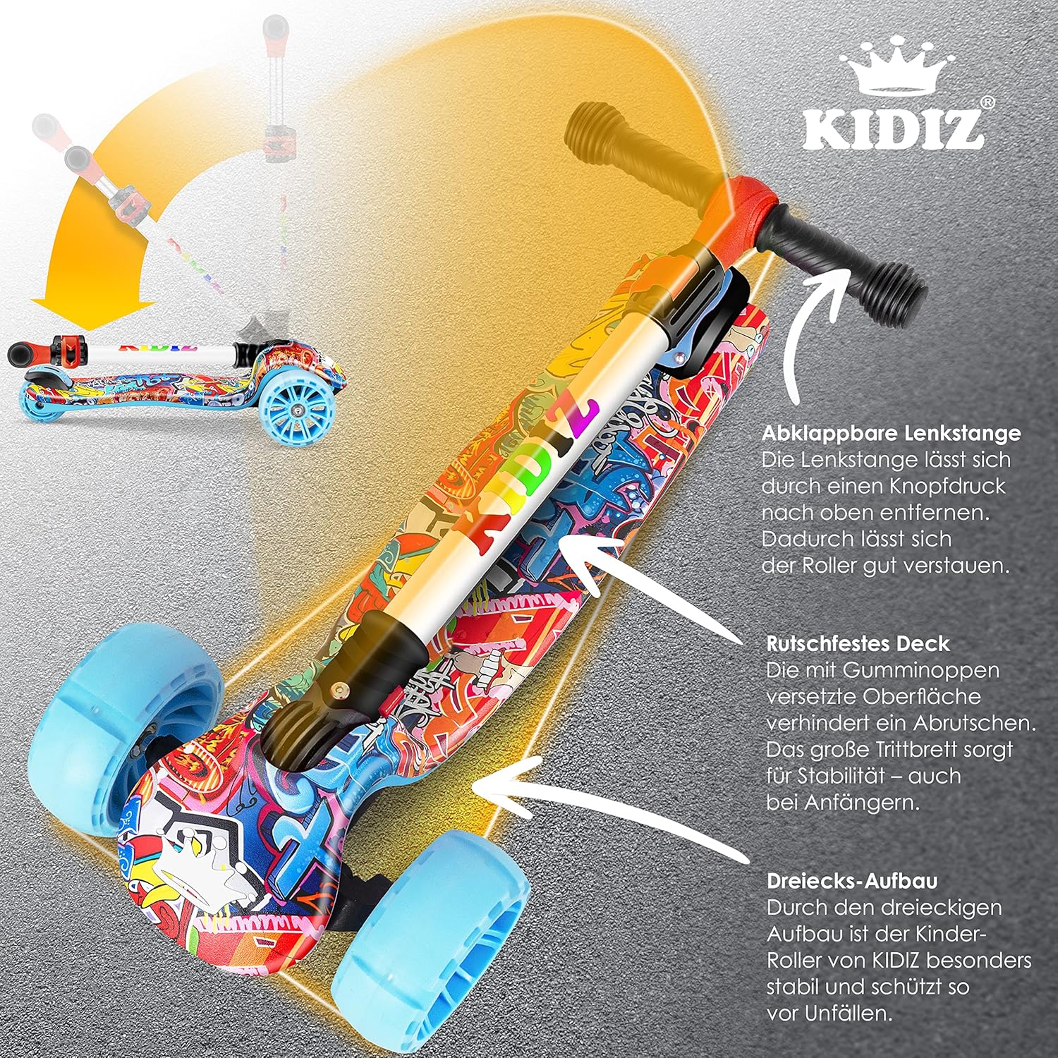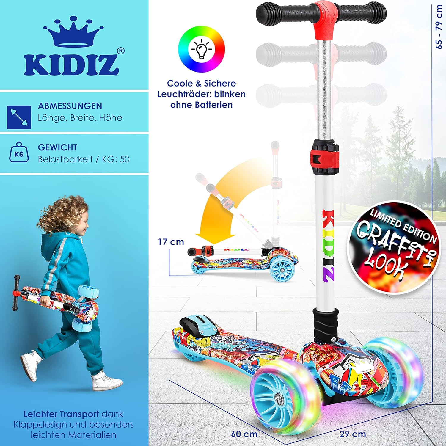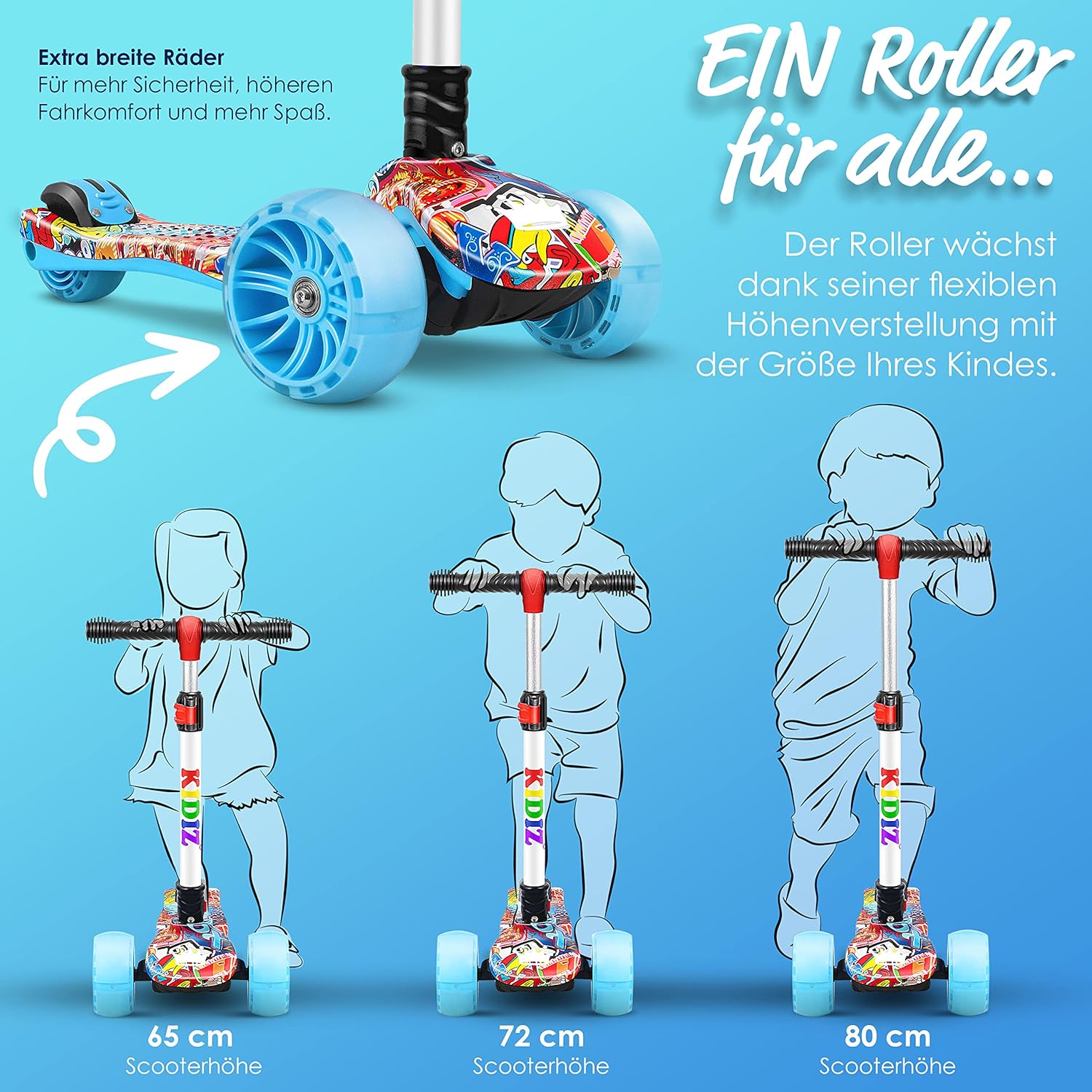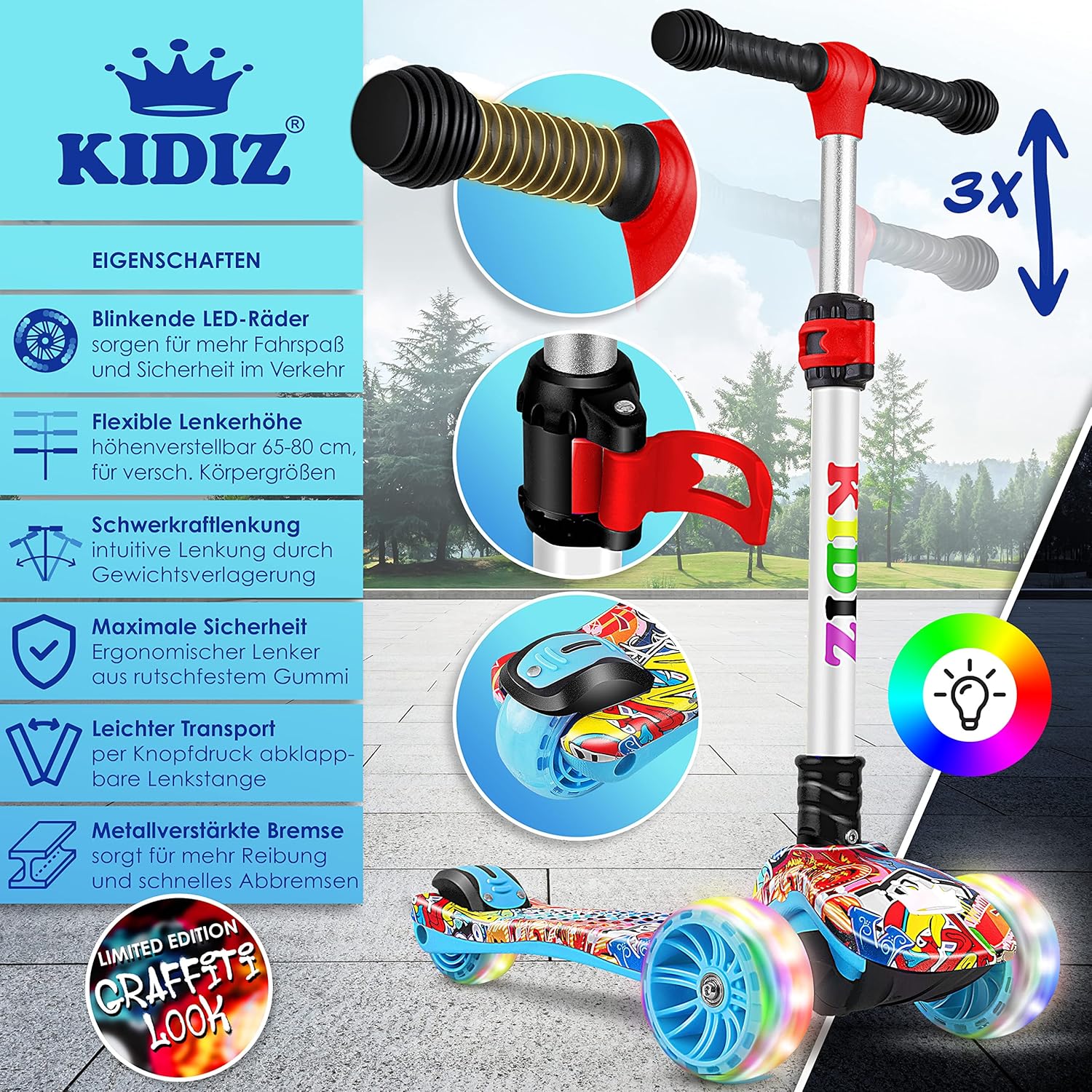 Facile da usare: un manubrio ergonomico con impugnature in gomma antiscivolo garantisce la massima sicurezza. Il freno rinforzato in metallo provoca un grande attrito e garantisce una frenata rapida e sicura nel traffico. Il manubrio è realizzato in alluminio anodizzato. Inoltre, il manubrio può essere ripiegato premendo un pulsante, rendendo lo scooter da città facile da trasportare e riporre. Alta qualità: le ruote extra larghe non solo garantiscono un elevato comfort di guida e più divertimento, ma sono anche particolarmente silenziose e si illuminano o lampeggiano - senza batterie - durante la guida. Divertimento di guida garantito e ancora più sicurezza grazie all'elevata visibilità - su diverse superfici come ciottoli, erba, asfalto, cemento o pavimenti in legno. L'ampia pedana dello scooter garantisce stabilità, anche per i principianti. 𝐌𝐈𝐓𝐖𝐀𝐂𝐇𝐒𝐄𝐍𝐃: Uno scooter da città per tutte le età e diverse corporature - grazie alla regolazione flessibile dell'altezza, lo scooter cresce con le dimensioni del tuo bambino ed è regolabile in altezza su tre livelli - tra 65-80 cm. Il divertente scooter sportivo ha uno sterzo intuitivo per gravità spostando il peso. In questo modo si evita che il volante si strappi e allo stesso tempo si allena il senso dell'equilibrio del bambino. Alta qualità: il monopattino è realizzato in plastica e metalli di alta qualità e dispone di rinforzi sul sottoscocca, sullo sterzo e sui freni. Lo scooter può sostenere fino a 50 kg. Il kickboard è adatto sia a ragazzi che a ragazze. Il monopattino di KIDIZ è particolarmente stabile e sicuro grazie alla sua struttura triangolare e protegge quindi dagli incidenti. Grande valore: con il suo design sportivo ed elegante, lo Sport-Pro-Scooter non è solo un regalo ideale per tutti coloro che amano il divertimento, lo sport e l'azione e amano stare all'aria aperta, ma segna anche un vero e proprio eye-catcher con un look street style trendy e senza tempo. Non vorrai rinunciare al tuo monopattino freestyle: verificalo tu stesso. Il nostro scooter professionale viene consegnato parzialmente assemblato.