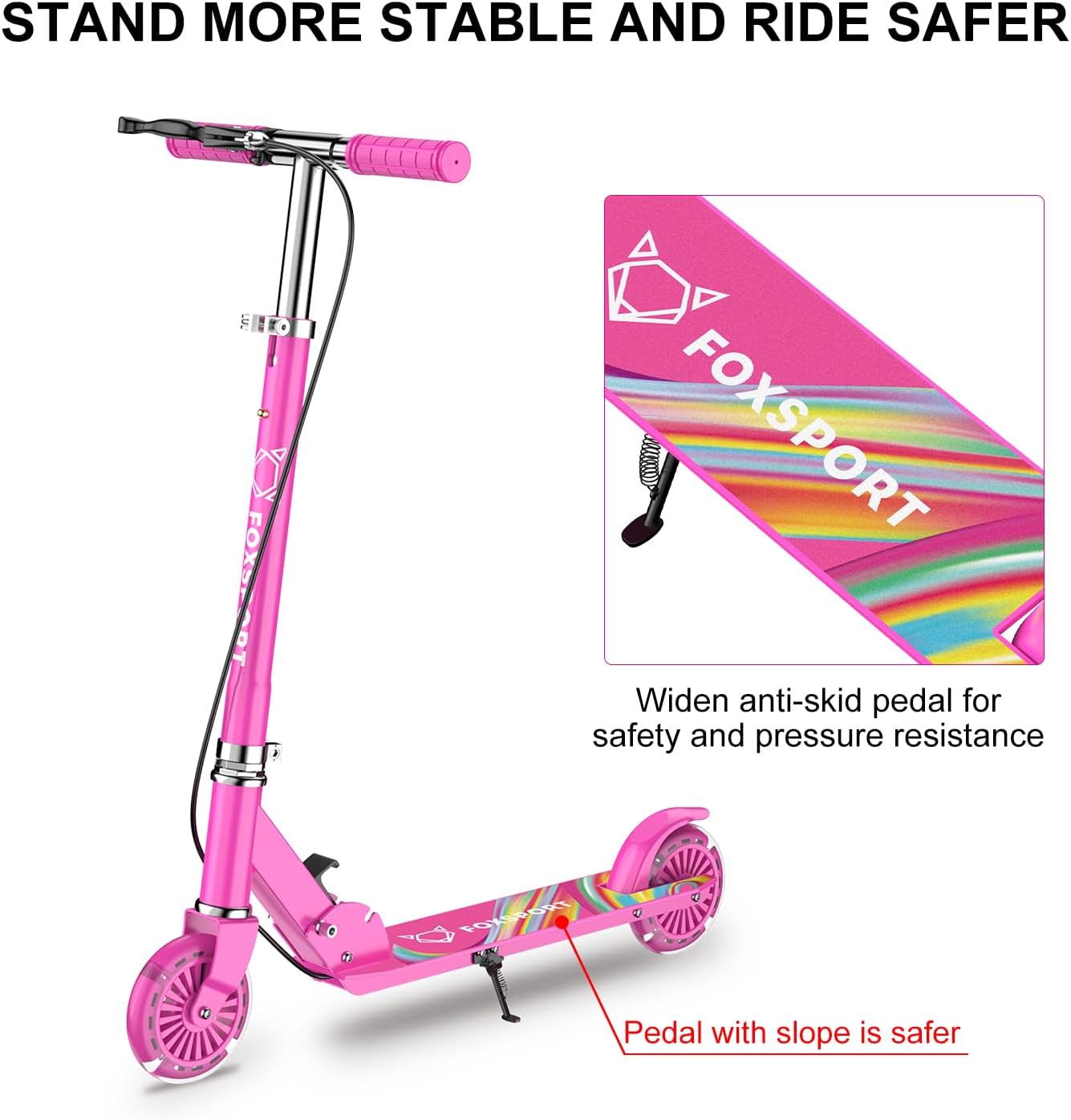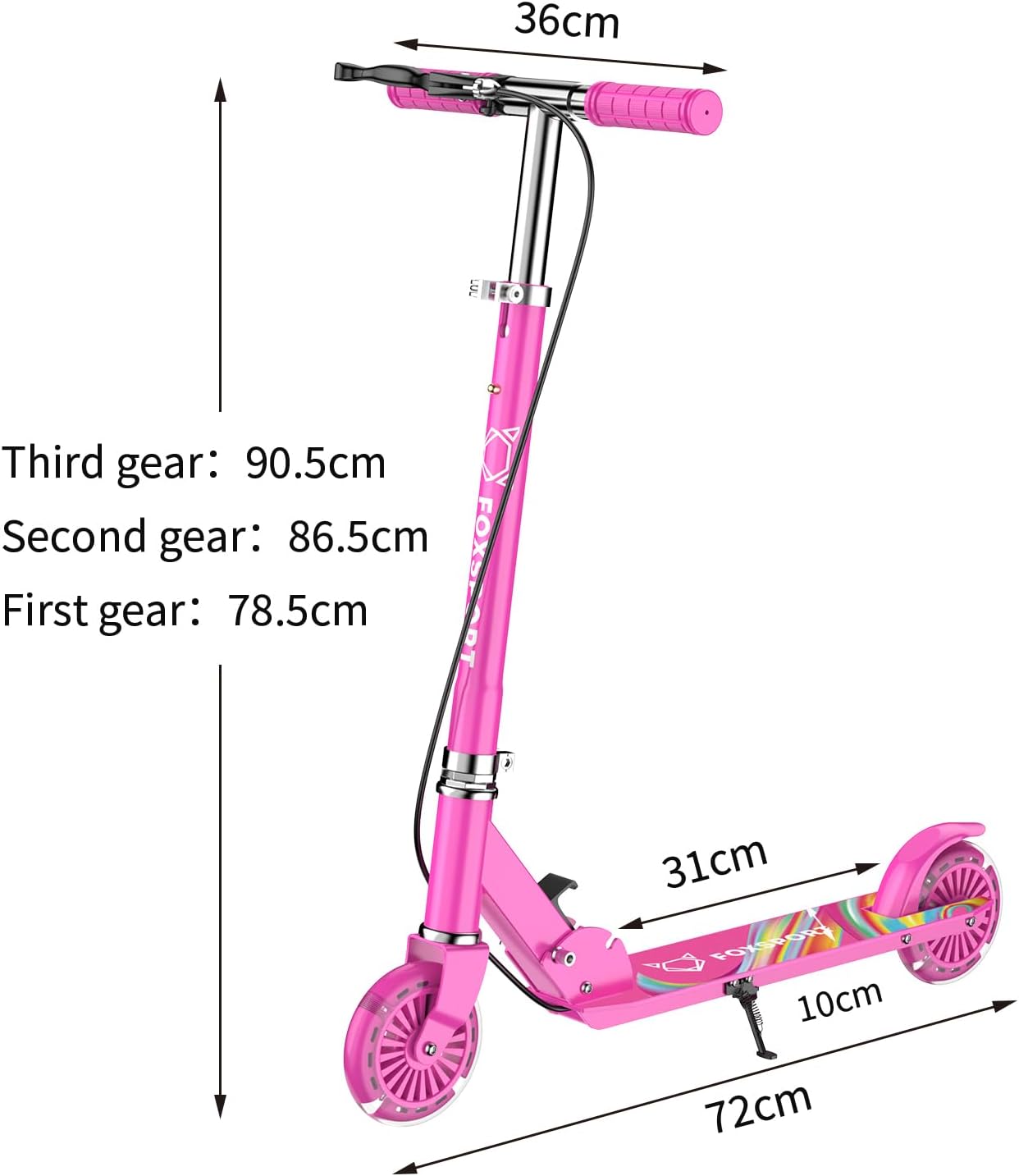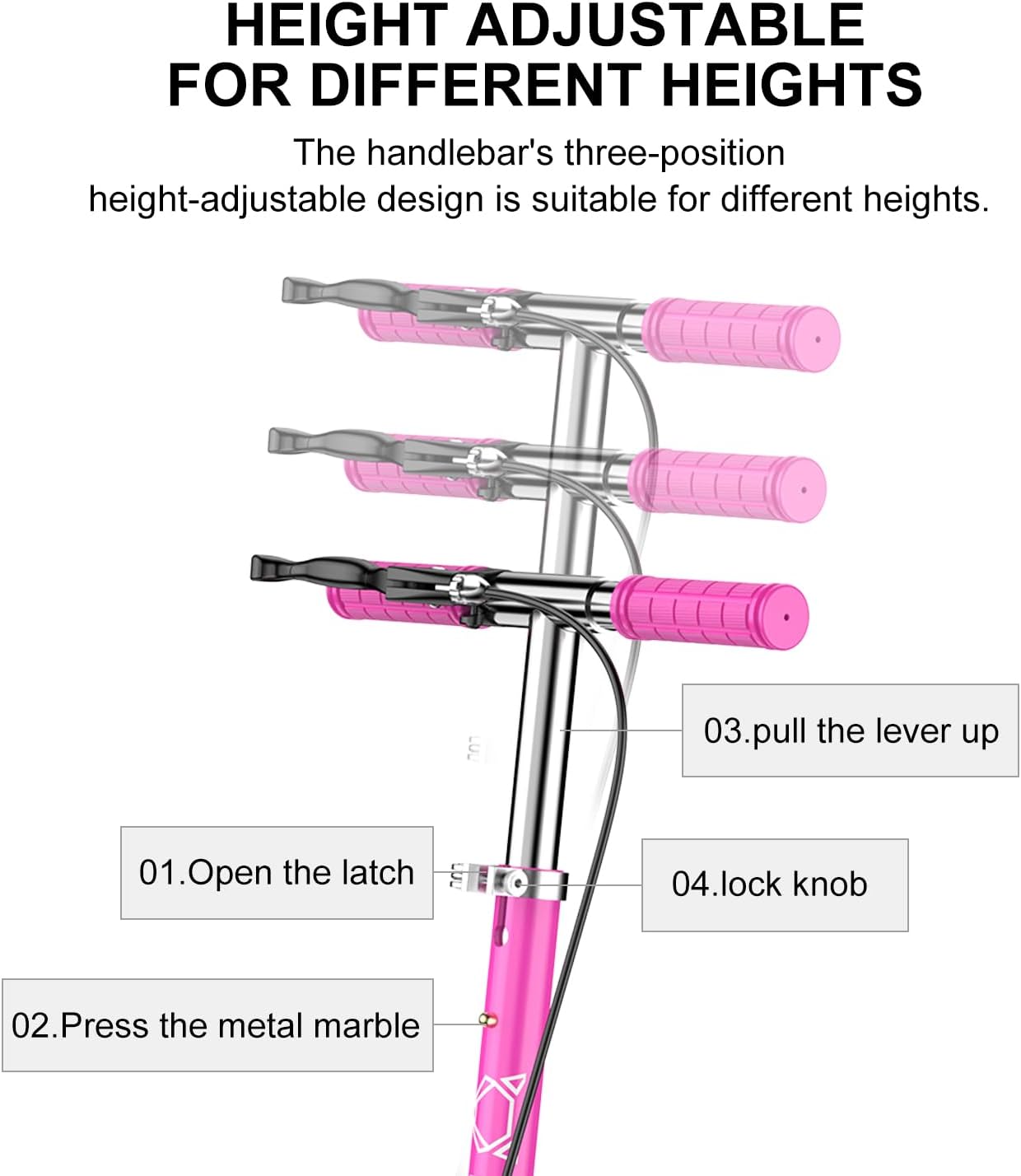 【Design pieghevole】 Lo scooter per bambini è pieghevole e può essere piegato e aperto in pochi secondi. Una volta piegato, occupa poco spazio ed è facile da trasportare e trasportare. 【Manubrio a T regolabile】 Lo scooter per bambini può essere regolato su tre diverse altezze a seconda delle dimensioni e della corporatura del bambino e cresce con lui. 【Ruote luminose a LED】 Le ruote luminose si accendono durante la guida e si spengono dopo la guida. Le ruote da 120 mm di diametro assicurano una guida fluida su diverse strade. 【Stabile e leggero】 Il pedale antiscivolo aumenta l'attrito per evitare che i bambini scivolino durante la guida. Il manubrio antiscivolo garantisce ai bambini una presa salda. Il peso di 3,75 kg garantisce un'esperienza di guida più semplice e sicura. 【Regalo per bambini】 Uno scooter pieghevole per ragazzi e ragazze per migliorare l'equilibrio e la coordinazione.