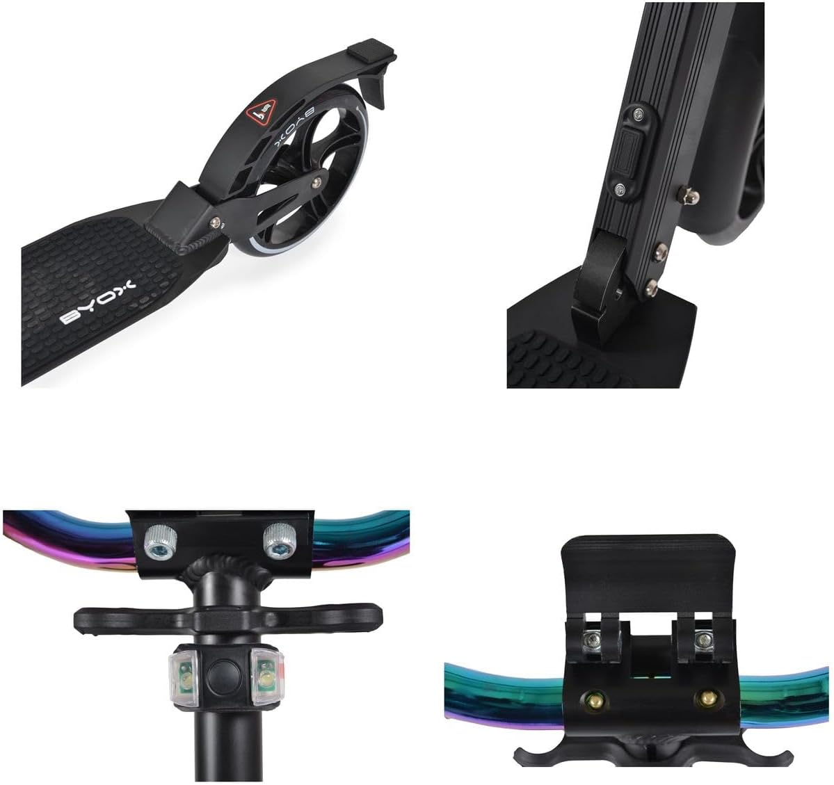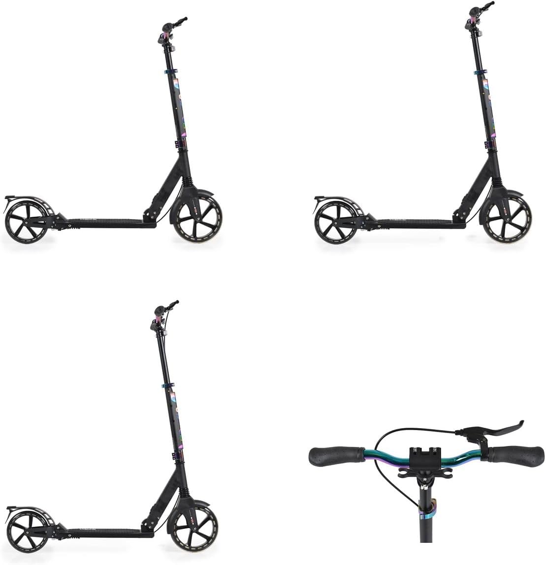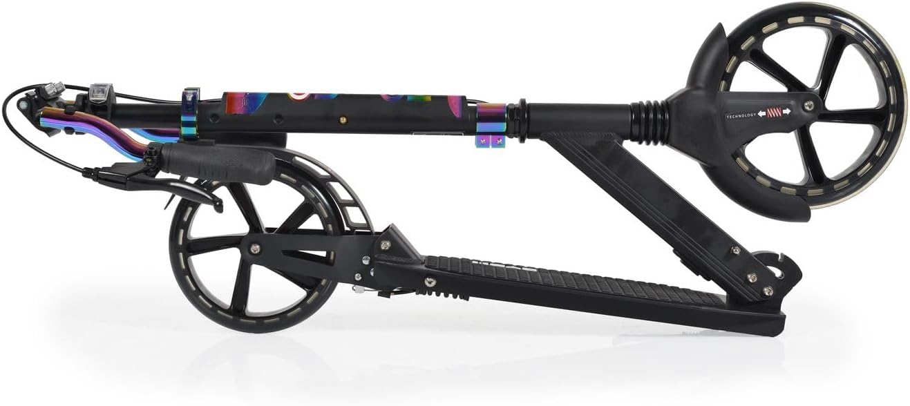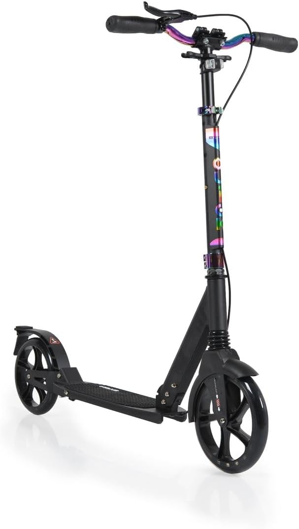 monopattino per bambini a partire da 8 anni e con un peso massimo di 100 kg Ruota anteriore con sospensione, in alluminio leggero, manubrio regolabile in altezza, pneumatici in PU, freno a disco sulla ruota posteriore con manopola di comando al volante, cuscinetti ABEC-7 pieghevoli, manubrio a T rivestito in gomma NBR antiscivolo, fari a LED da 12 cm, ammortizzatori posteriori e anteriori, cavalletto laterale, ponte con rivestimento antiscivolo, realizzato con materiali innocui