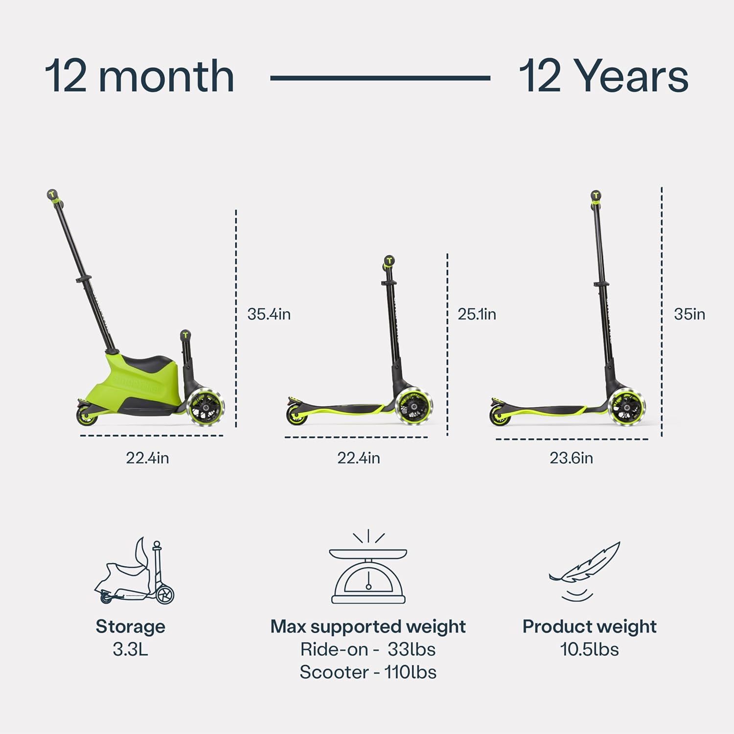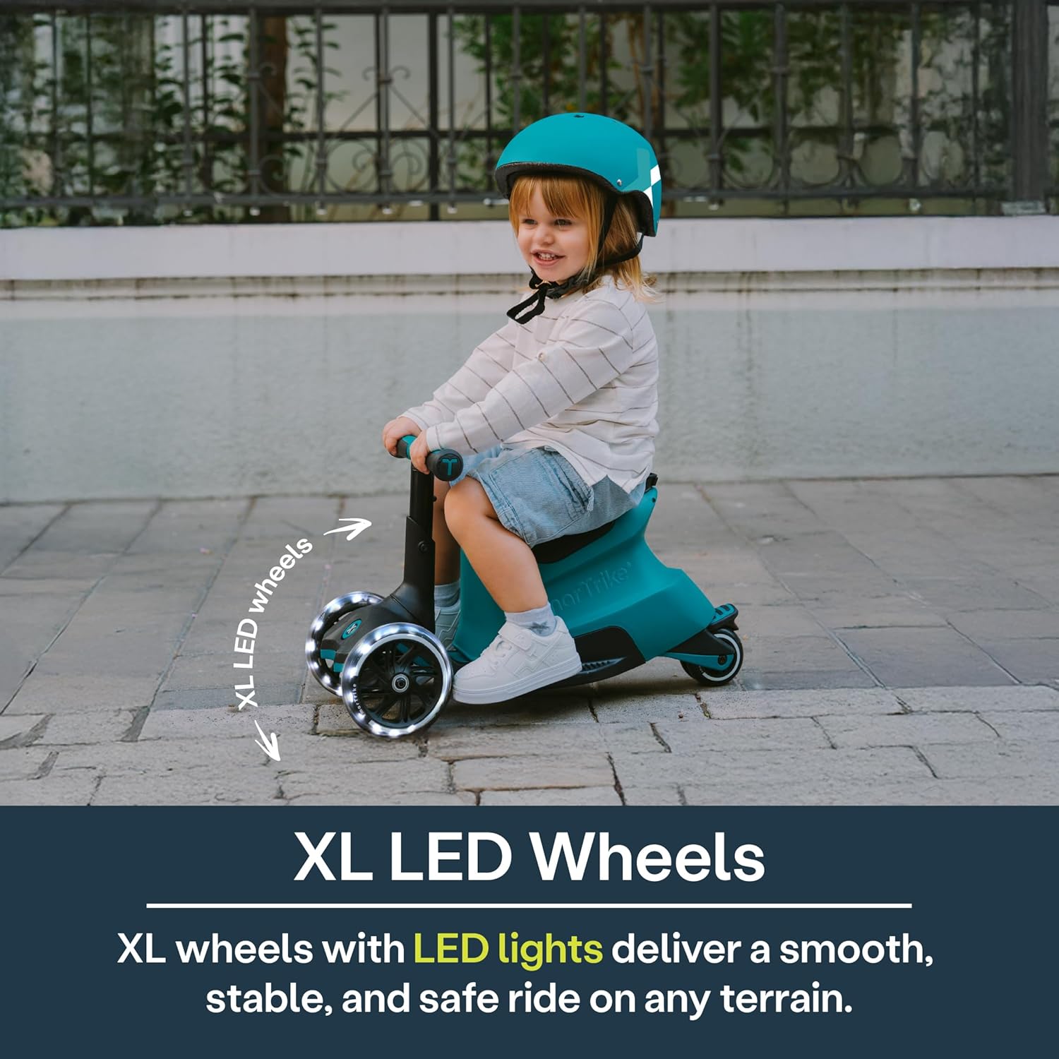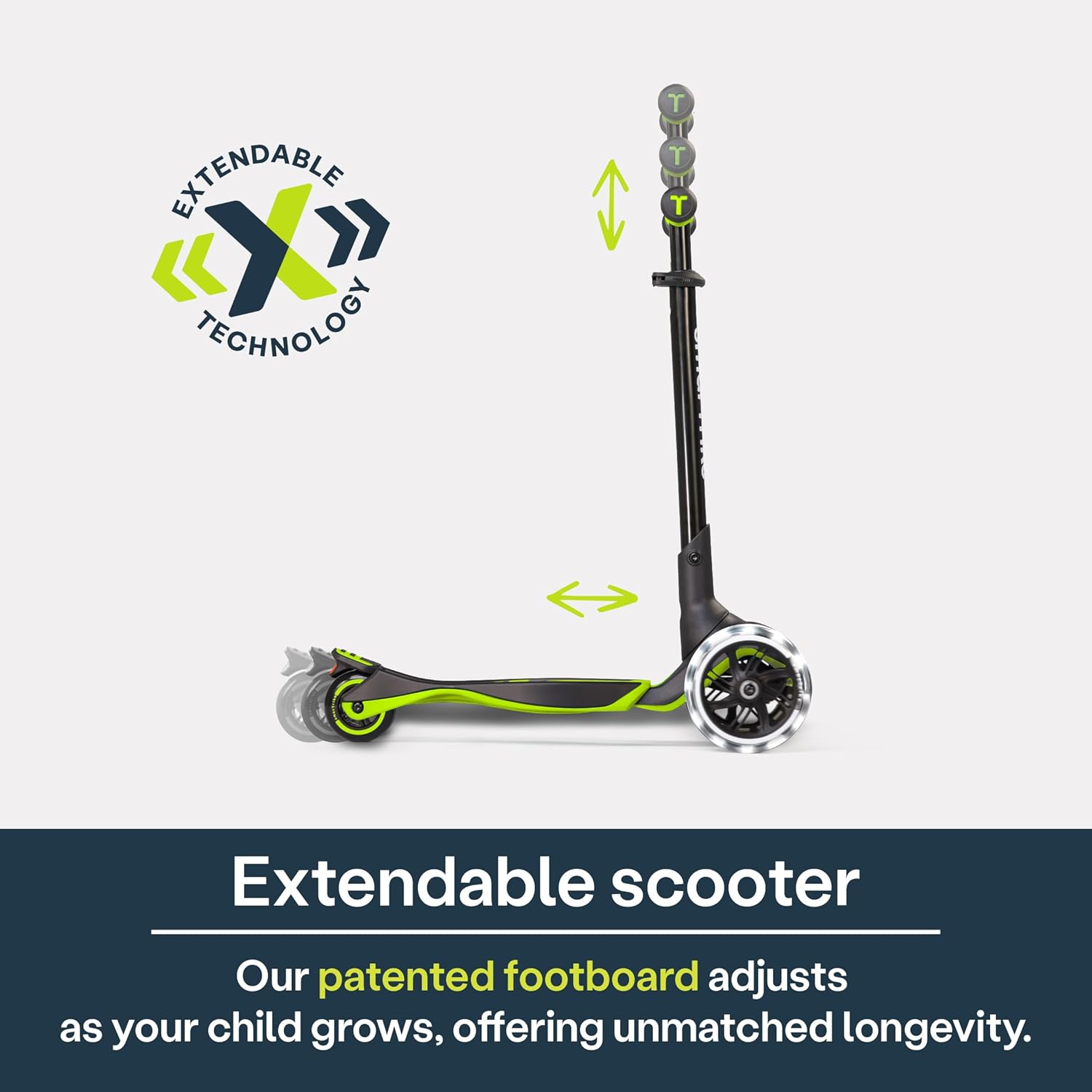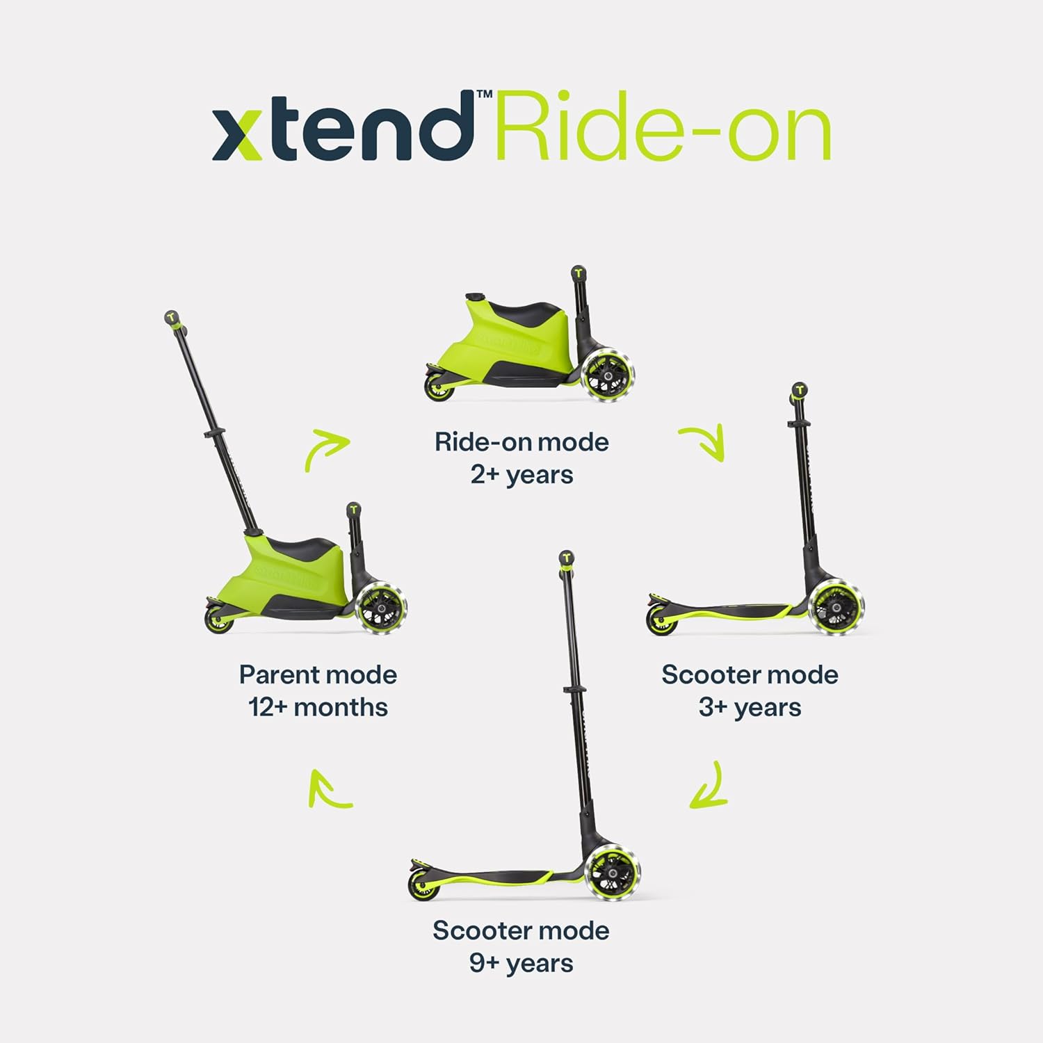 Il monopattino Xtend Ride-on è adatto per bambini dai 12 mesi ai 12 anni in quanto può essere regolato in 5 livelli, poiché è stato progettato per accompagnare i bambini durante tutta l'infanzia quando crescono dai 12 mesi ai 12 anni. Aggiungendo una carrozzeria a scatto allo scooter Xtend, abbiamo reso ancora migliore lo scooter più avanzato del mondo. La carrozzeria a scatto si collega perfettamente al nostro scooter Xtend e amplia la fascia di età, la funzionalità e le possibilità di utilizzo del prodotto. Una volta che i bambini hanno superato l'opzione di scivolamento, è possibile rimuovere il sedile rapidamente e facilmente, allungare il manubrio e lasciare che i bambini guidino liberamente Dotato di 3 ruote: nella parte anteriore ci sono 2 ruote a LED luminosi extra grandi da 142 mm per guidare sui terreni più difficili.