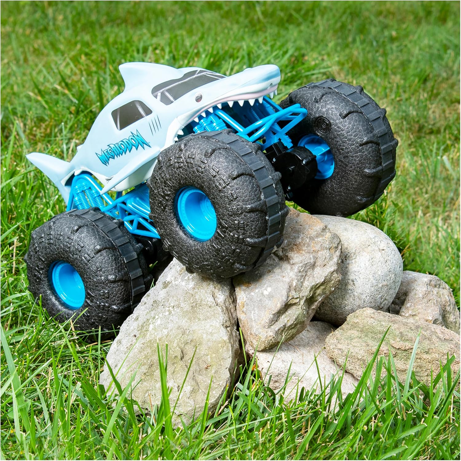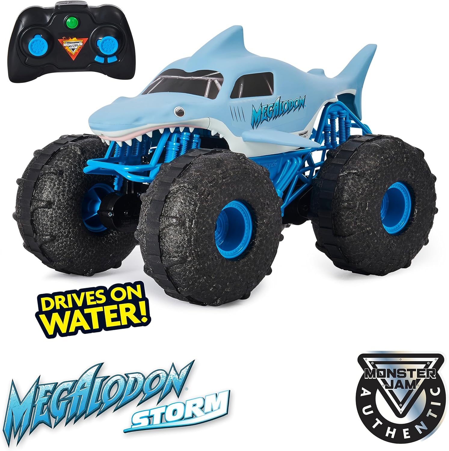 FUNZIONA IN ACQUA: grazie al design idrorepellente e alle gomme personalizzate ad alte prestazioni, Megalodon STORM può sfrecciare su qualsiasi superficie, anche in acqua AFFRONTA QUALSIASI TERRENO: questo veicolo radiocomandato è in grado di affrontare qualsiasi tipo di terreno con potenza e velocità: neve, fango, rocce, erba e molto altro ancora RIPRODUZIONE UFFICIALE DI MEGALODON: con design, dettagli e pneumatici BKT autentici, sarà come guidare quello vero. Le gomme leggere di Megalodon STORM offrono prestazioni mai viste in acqua e a terra RICARICABILE VIA USB: il veicolo Monster Jam Megalodon STORM radiocomandato è ricaricabile tramite USB ed è un'idea regalo per i bambini dai 4 anni in su Il radiocomando richiede 2 pile AAA (non incluse) Include: 1 Megalodon STORM radiocomandato, 1 radiocomando, 1 guida per l'uso