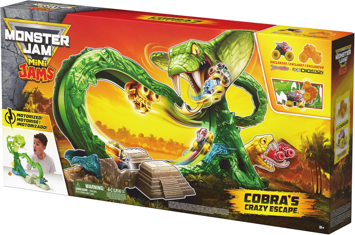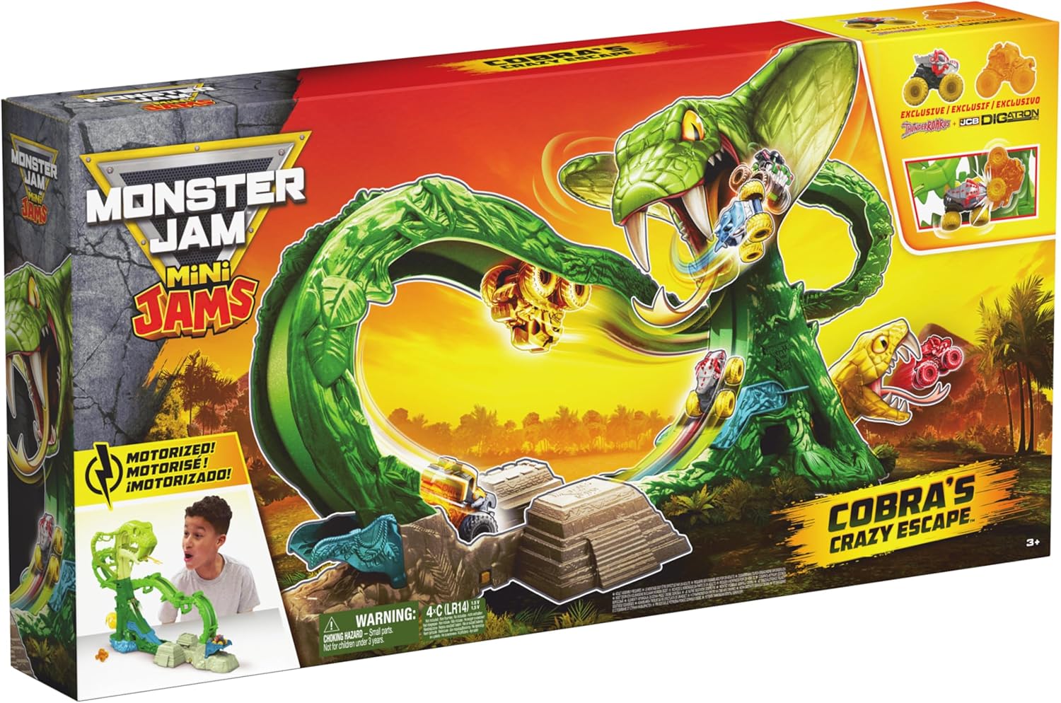 Avventura nella giungla da 28 pollici: lancia nel caos selvaggio di Monster Jam e accendi il lanciatore motorizzato e invia i tuoi Mini Monster Trucks che volano attraverso una pista della giungla ad anello che è lunga oltre 2 piedi 2 esclusive mini marmellate: scatena la potenza di ThunderROARus e JCB Digatron in scala 1:87, presenta epici design a tema gemma e uno stile feroce Monster Jam Fuggi dalla trappola del cobra: Riuscirai a sopravvivere nella giungla? Sollevare la leva segreta per aprire la porta nascosta e far saltare il camion fuori dall'uscita laterale (batterie non incluse) Monster Jam Conservazione: conservare e visualizzare fino a 6 mini jam Monster Jam mentre guardi questi camion zoom e capovolgere in pista (altri camion venduti separatamente) Giocattoli per ragazzi e ragazze di 3 anni: Monster Truck per ragazzi e ragazze dai 3 anni in su; rendendolo un ottimo regalo di vacanza o compleanno per bambini. Monster Jam camion, camion RC, auto rc e, auto giocattolo sono in cima alle figure giocattolo e set da gioco per bambini Include: 1 rampa di ingresso, 1 base booster, 1 base binaria, 1 supporto base sinistra, 1 supporto base destra, 1 curva traccia, 1 ponte pista, 1 Track End, 1 testa Cobra, 1 cappuccio Cobra sinistro, 1 cappuccio Cobra destro, 1 Mini Jams ThunderROARus, 1 Mini Jams Digatron, 1 foglio di istruzioni (lingua italiana non garantita) Coperto dall'impegno Spin Master Care. Vedi sotto per tutti i dettagli