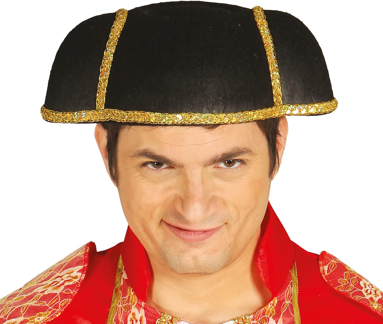 Impossibile caricare il contenuto multimediale. Tuvimos una fiesta en la que fuimos disfrazados de toreros, me faltó una montera y compré este modelo al estar los otros agotados y no poder llegar en el plazo. La montera es muy básica, de fieltro simple y con un cordón dorado pegado con silicona caliente y restos de silicona por todas partes. Aunque sea para un disfraz pero la calidad es muy básica para el precio que pagué. Después de releer bien el anuncio de compra vi que ponia que era de fieltro, pero al tener solo una foto no se puede saber como es el interior. El tamaño es grande para un adulto.