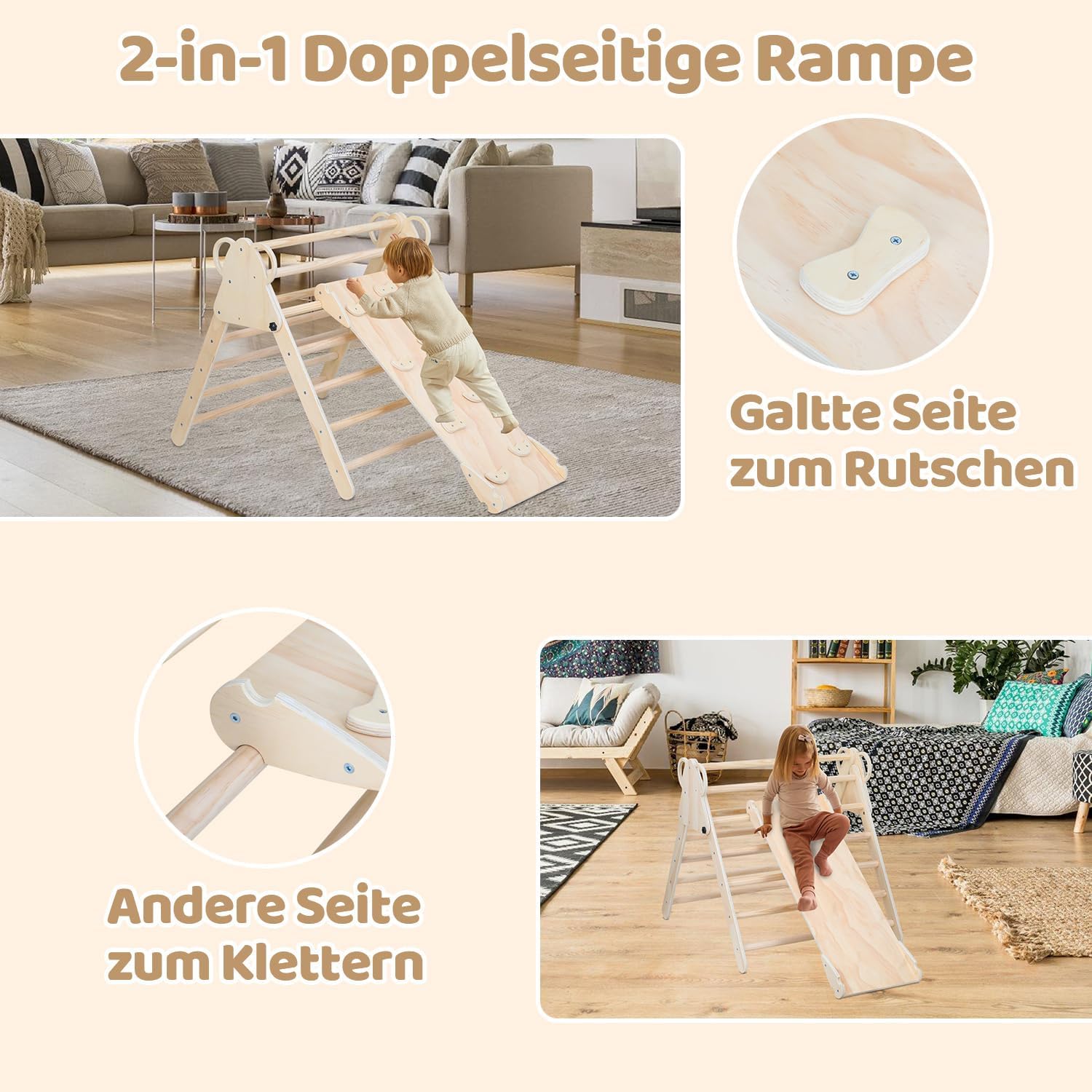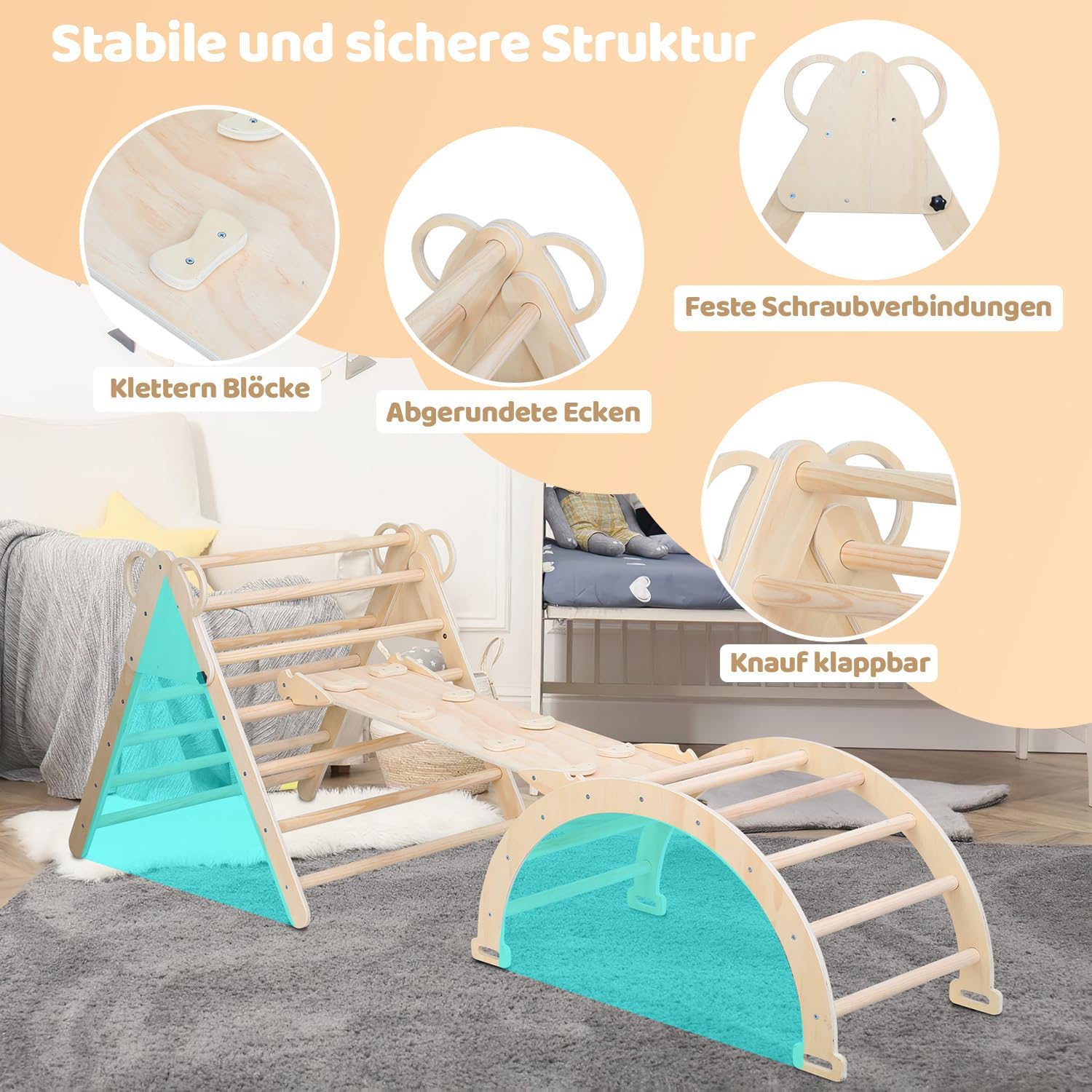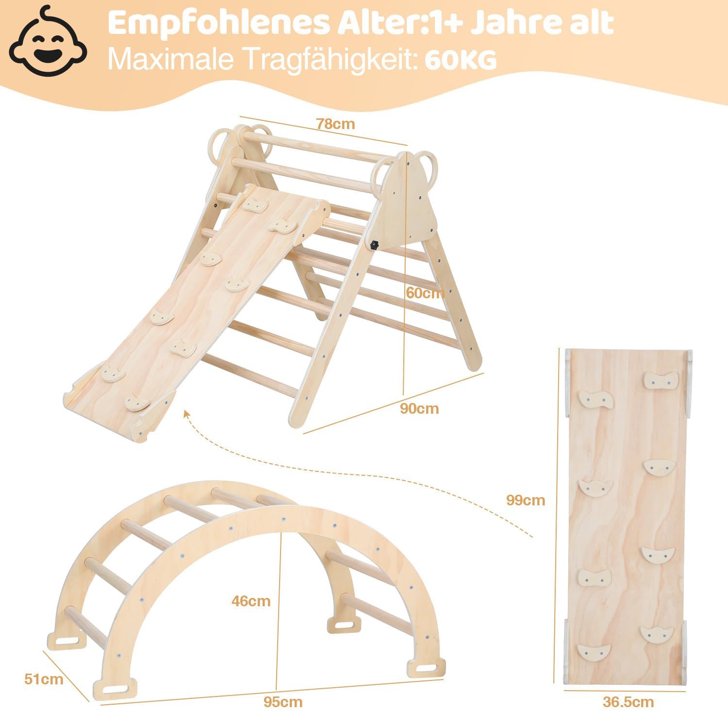 Set da arrampicata flessibile 3 in 1: questo set da arrampicata per interni contiene un triangolo da arrampicata, un arco da arrampicata e una parete da arrampicata su entrambi i lati. Gli elementi possono essere combinati liberamente, sia come triangolo da arrampicata con scivolo, palestra o come giocattolo ispirato ai Montessori. Quindi promuove le capacità motorie e l'immaginazione! Sicuro e stabile: realizzato in robusto compensato e barre di legno massiccio, il set supporta fino a 60 kg. Tutti i bordi sono arrotondati e privi di sbavature, per giocare al sicuro senza rischio di lesioni. Consigliato per bambini da 2 a 8 anni. Multiuso: la piastra da arrampicata è utilizzabile su entrambi i lati: liscia come scivolo o con manici come rampa da arrampicata. L'arco da arrampicata può essere girato e utilizzato come altalena Difficoltà regolabile: l'inclinazione della struttura da arrampicata può essere regolata in altezza in base a diversi livelli di difficoltà ed età, mantenendo la motivazione e lo sviluppo a lungo termine! Dimensioni pratiche e facile da montare: dimensioni: triangolo da arrampicata (montato): 90 x 80 x 78 cm; arco da arrampicata: 95 x 51 x 46 cm; piastra da arrampicata: 99 x 36,58 cm. Contenuto della confezione: attrezzi e istruzioni per il montaggio (lingua italiana non garantita)