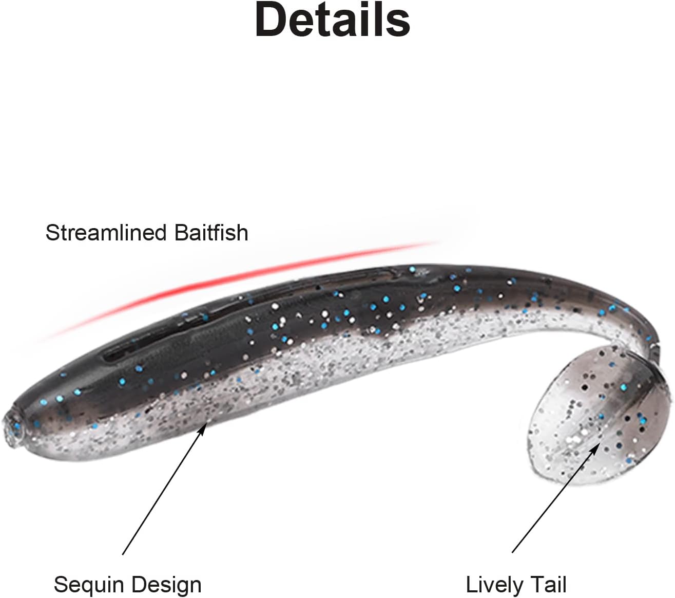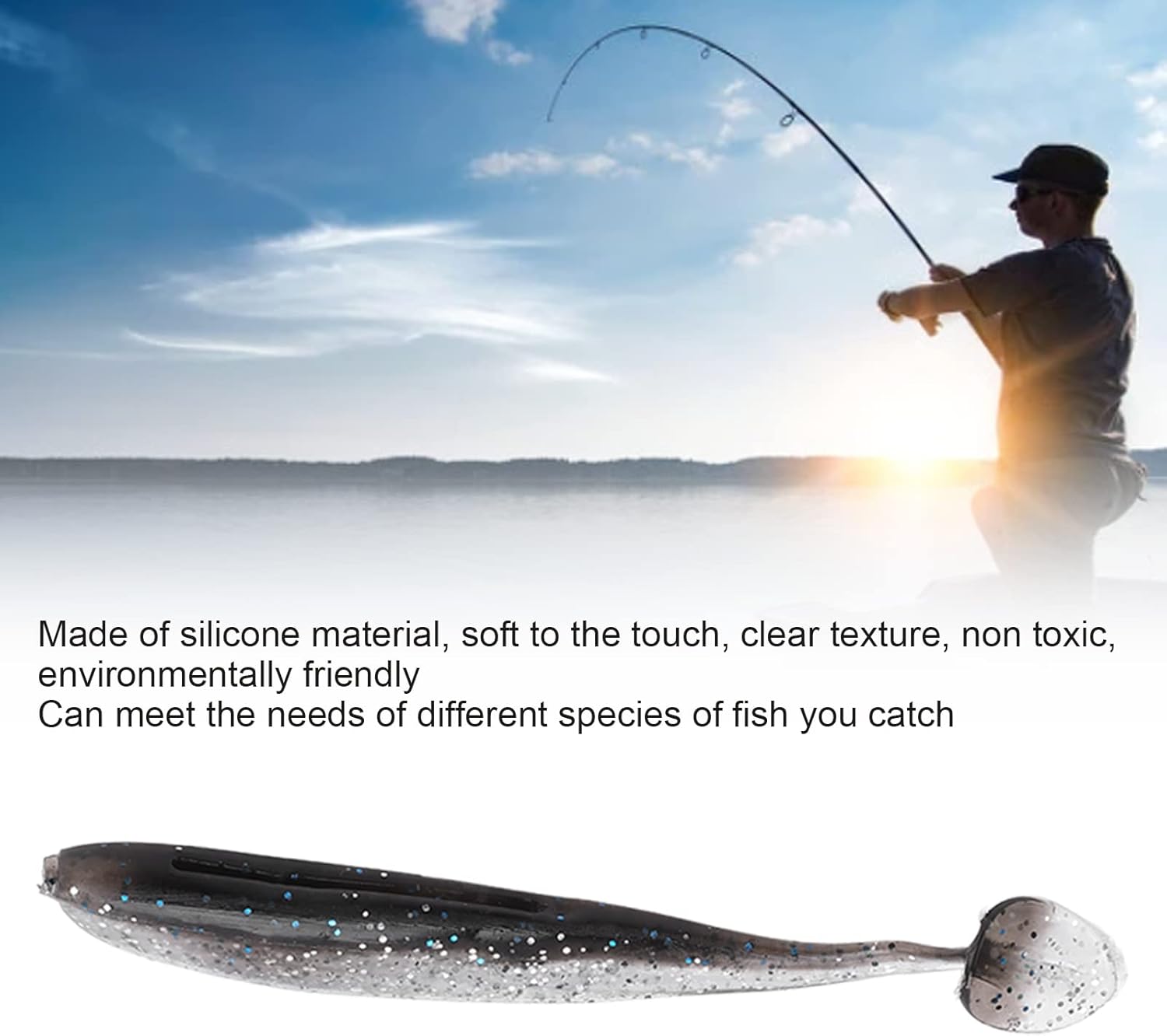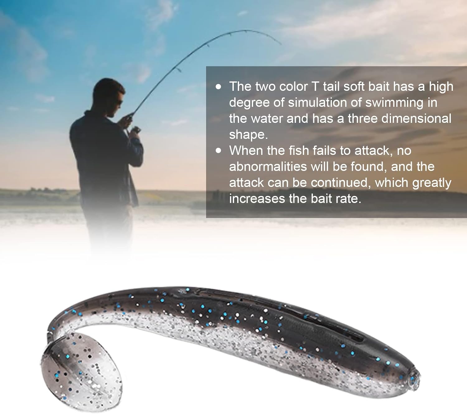 Materiale in silicone: realizzato in materiale siliconico di alta qualità, morbido al tatto, consistenza chiara, non tossico, ecologico, ad alta resistenza e durevole. Alta simulazione: l'esca morbida con coda a T bicolore simula altamente il nuoto nell'acqua e ha una forma tridimensionale. Aumenta il tasso di pasturazione: Quando il pesce non attacca, non vengono rilevate anomalie e l'attacco può continuare, aumentando notevolmente il tasso di pasturazione. Scene applicabili: adatte per la pesca d'acqua dolce, la pesca in mare, la pesca in barca, disponibili in primavera, estate, autunno e inverno. Leggero e portatile. Pesci applicabili: adatto per spigola, Culter Alburnus Basilewsky, pesce serpente, pesce gatto, pesce mandarino, pesce osmanto e ghiozzi. Può soddisfare le esigenze dei diversi tipi di pesci catturati.
