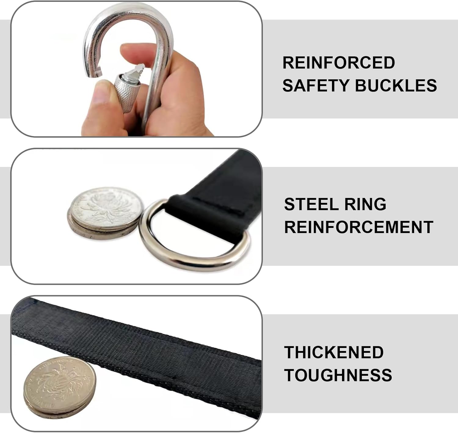 Le nostre cinghie per altalena per alberi non sono solo, ma anche senza attrezzi aggiuntivi Migliora il tuo divertimento all'aperto con il nostro set di cinghie oscillanti da 5 pezzi La sua caratteristica resistente cinturino in nylon e moschettoni per una maggiore sicurezza e stabilità Queste cinghie per altalena sono ideali per altalene, amache e anelli da palestra per la famiglia cerca di creare un ambiente di gioco sicuro
