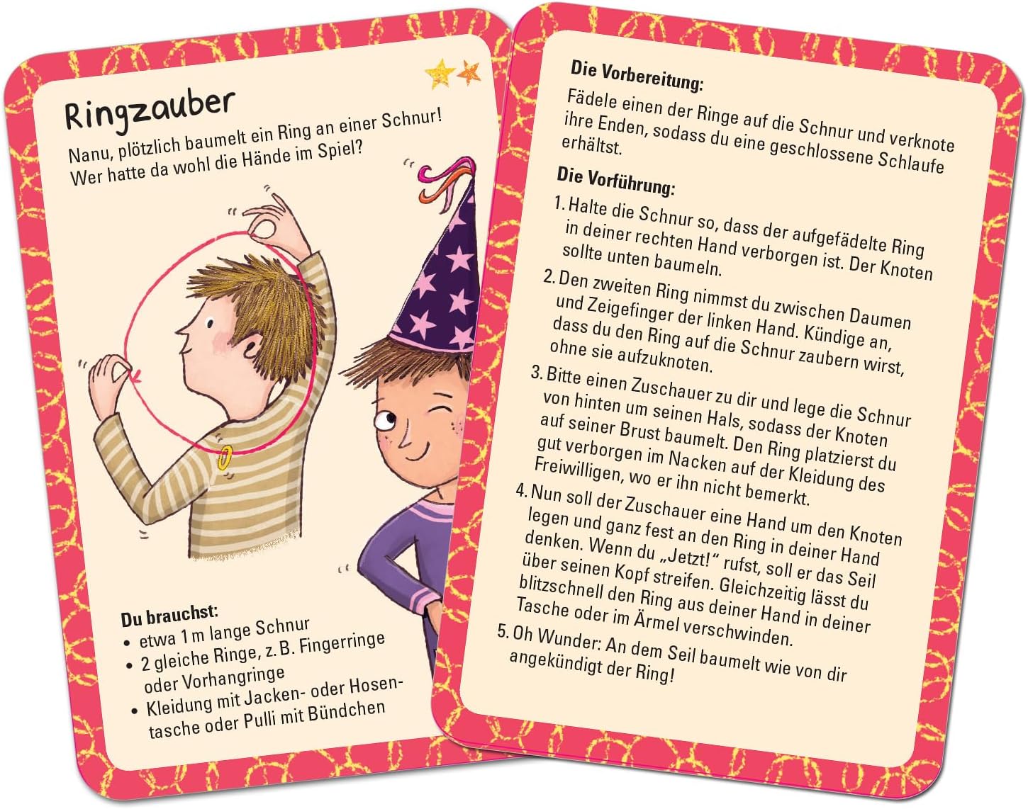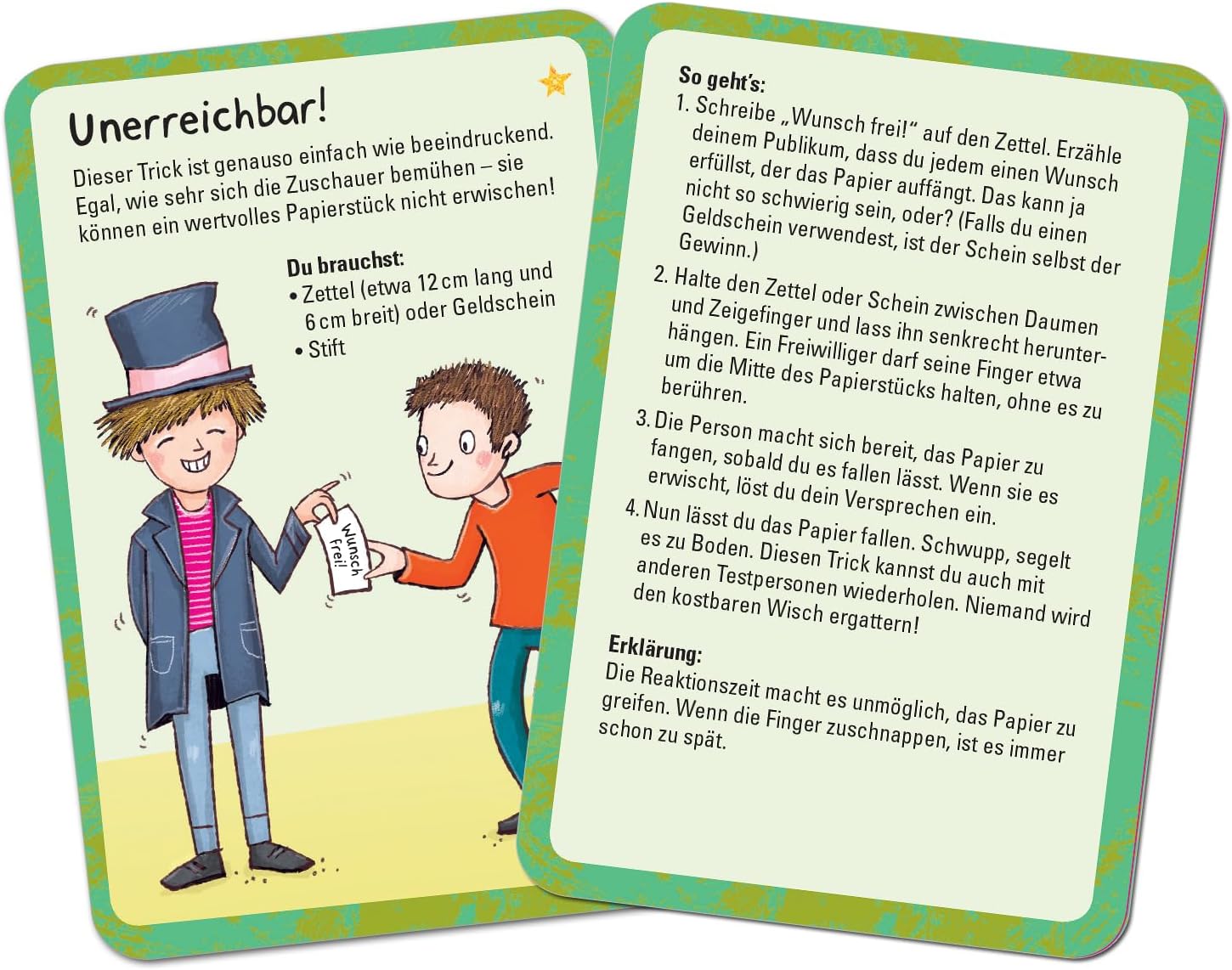 Trucchi magici accattivanti ✓ In questo gioco di carte, 50 trucchi dal gioco infantile all'impegnativo aspettano di essere appresi, praticati e dimostrati: un must per tutti i maghi dagli 8 anni in su. Vario ✓ Dall'illusione ottica alla chiaroveggenza, alla magia oscura, agli incantesimi d'amore e ai calcoli dei fulmini per registrare nodi e fili magici: compiti divertenti che garantiscono divertimento e richiedono poco materiale. Illustrazioni a misura di bambino ✓ Le carte progettate con cura con istruzioni passo passo ben spiegate e illustrazioni divertenti permettono ai bambini di addentrarsi in profondità nel mondo della magia e dei trucchi magici Ben confezionato ✓ Con l'imballaggio di alta qualità, le 50 carte da gioco sono riposte al sicuro anche durante le escursioni e le vacanze. Grazie alla collezione di trucchi, i bambini saranno impegnati nei lunghi viaggi e potranno preparare il loro prossimo spettacolo di magia. Simpatica idea regalo ✓ Sia come regalo segreto di Babbo Natale, regalo di compleanno o semplicemente come piccolo souvenir, il set di carte è la sorpresa perfetta per i piccoli maghi, principianti o esperti