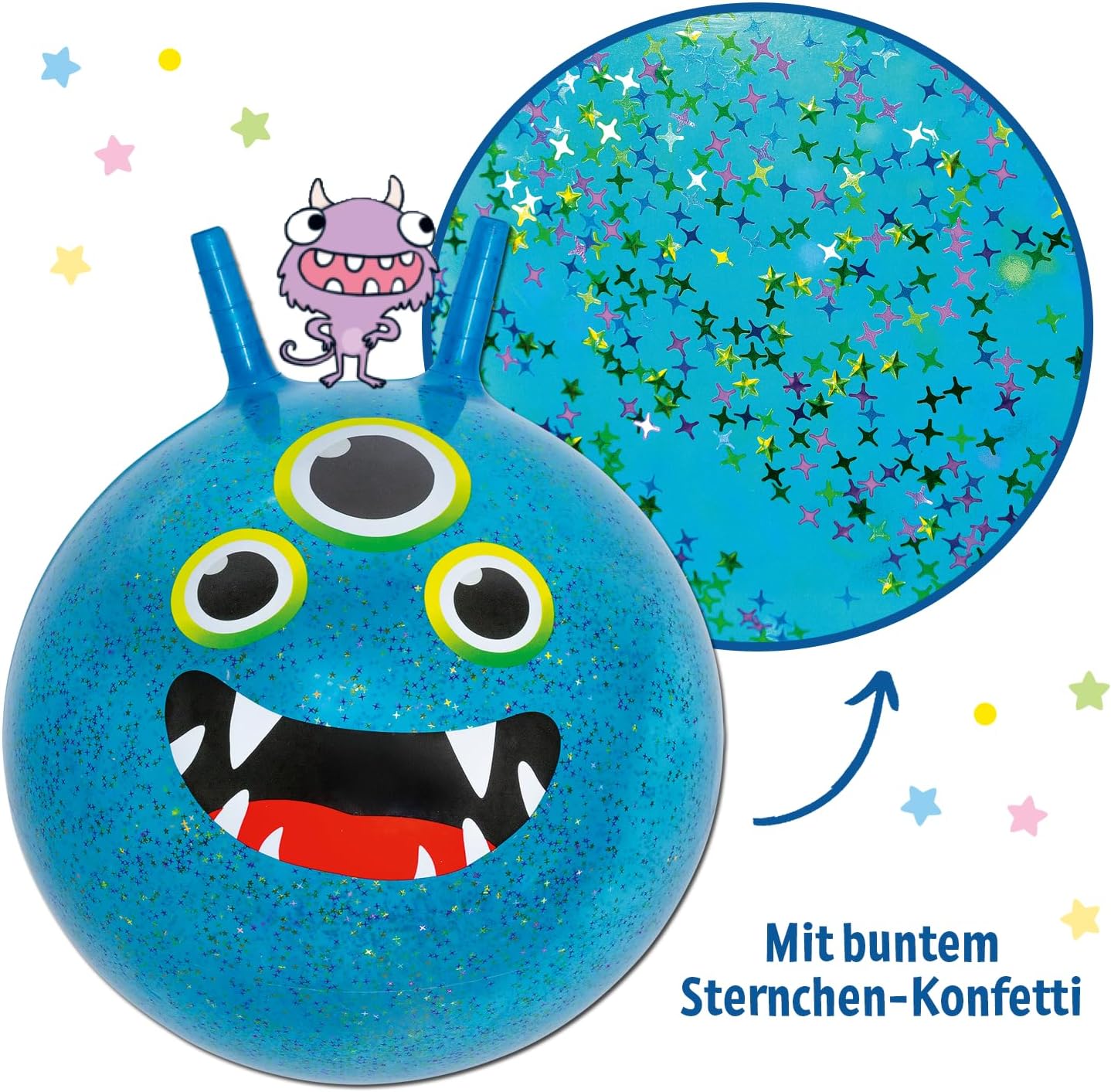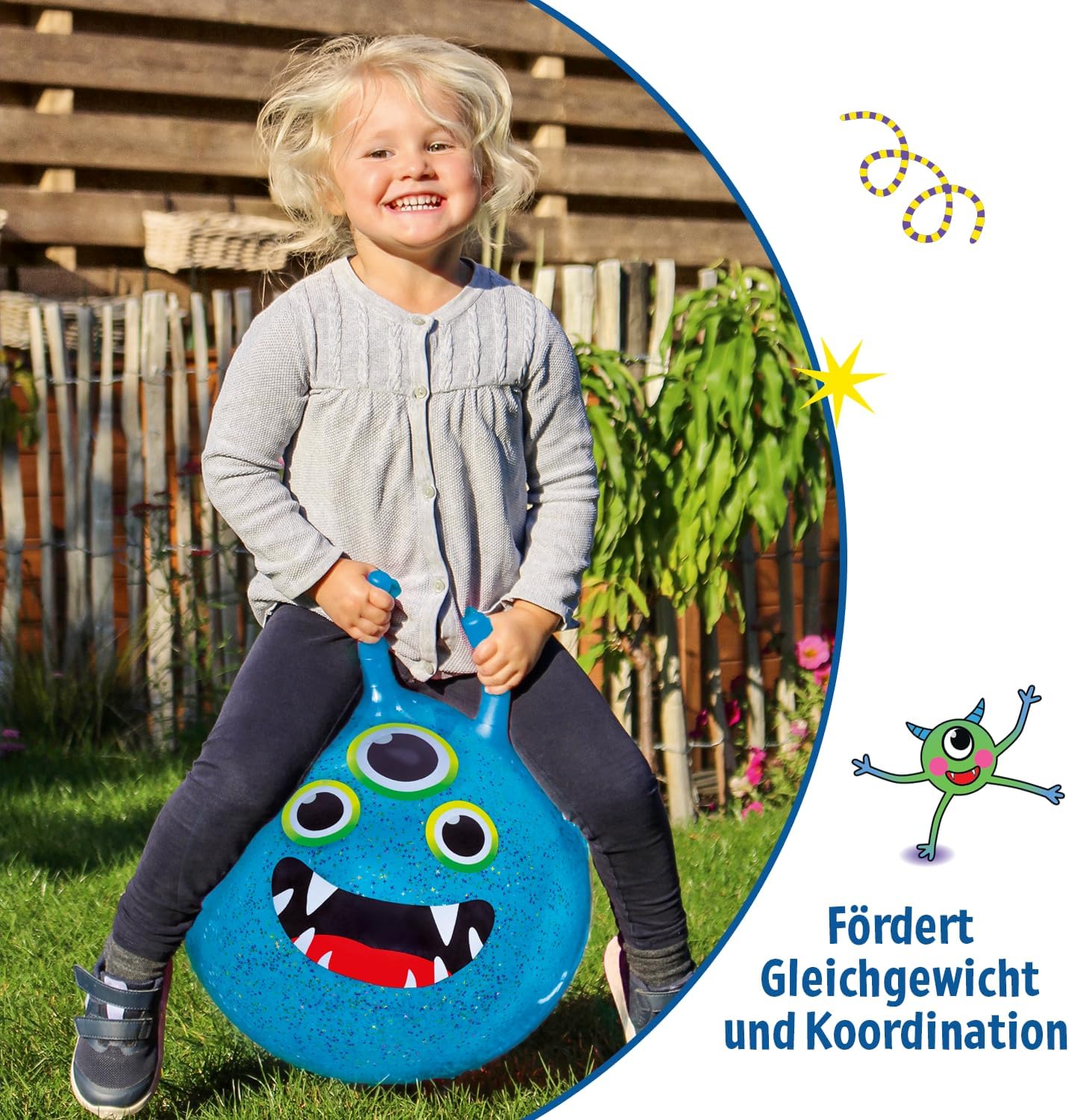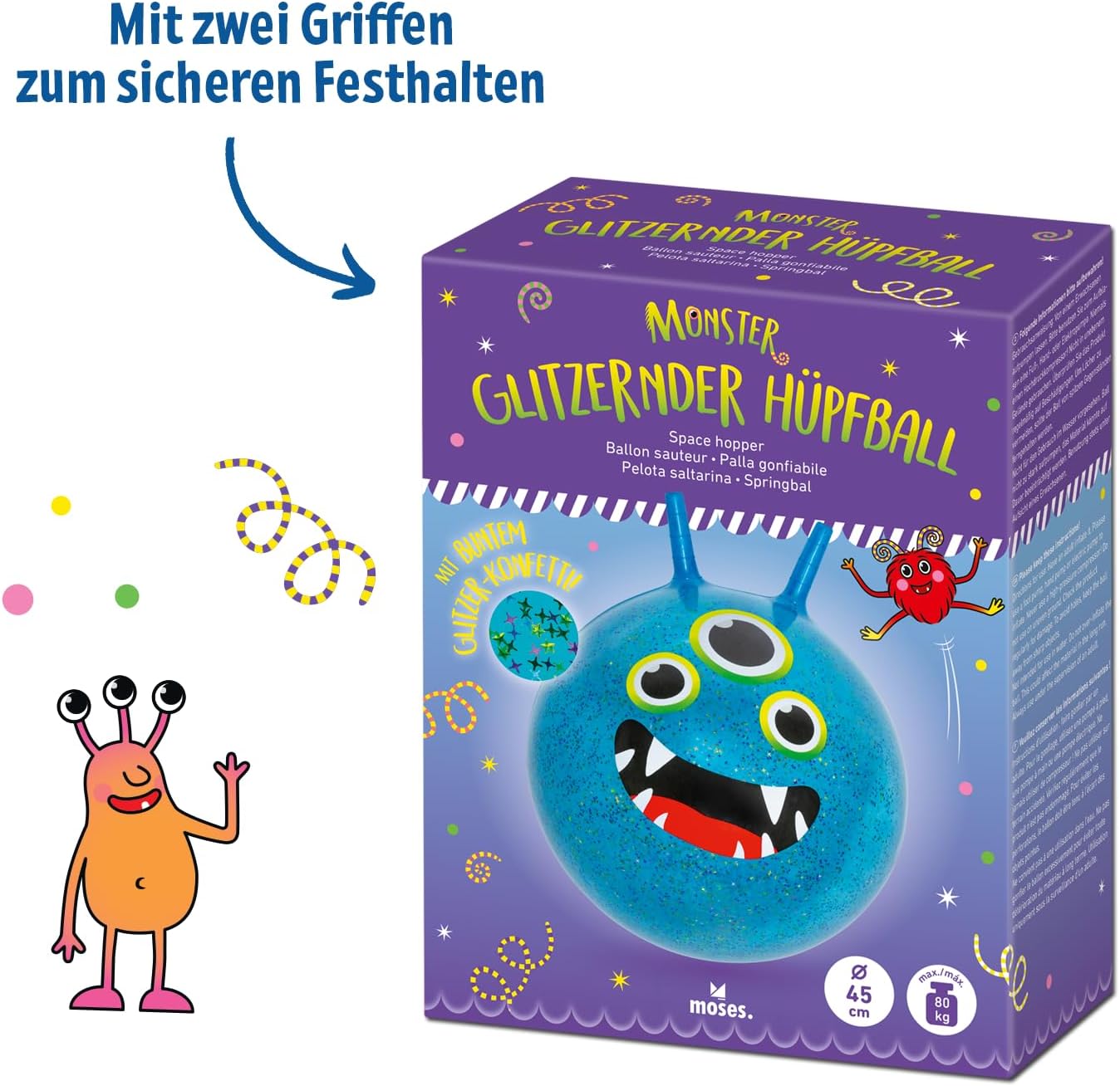 Design accattivante del mostro ✓ Con il viso divertente, tre occhi e un effetto coriandoli scintillante, la palla rimbalzante diventa un punto forte nella cameretta dei bambini e nel parco giochi Piacere di saltare ogni giorno ✓ Sia all'interno che all'esterno – la robusta palla garantisce un divertimento divertente e porta più movimento nella vita quotidiana dei bambini attivi Effetto di gioco scintillante. ✓ Ad ogni salto, i coriandoli glitter si aggrovigliano all'interno – un particolare colpo d'occhio che motiva i bambini a saltare Tenuta sicura durante il rimbalzo ✓ Due maniglie antiscivolo offrono una presa salda e garantiscono una sensazione di sicurezza durante il salto, la corsa e l'atterraggio Ideale per bambini dai 4 anni ✓ Con un diametro di 45 cm e una portata fino a 80 kg, la palla è perfetta per i piccoli appassionati di movimento – anche come regalo un'ottima scelta