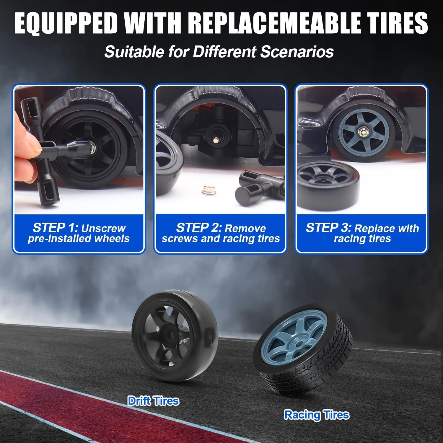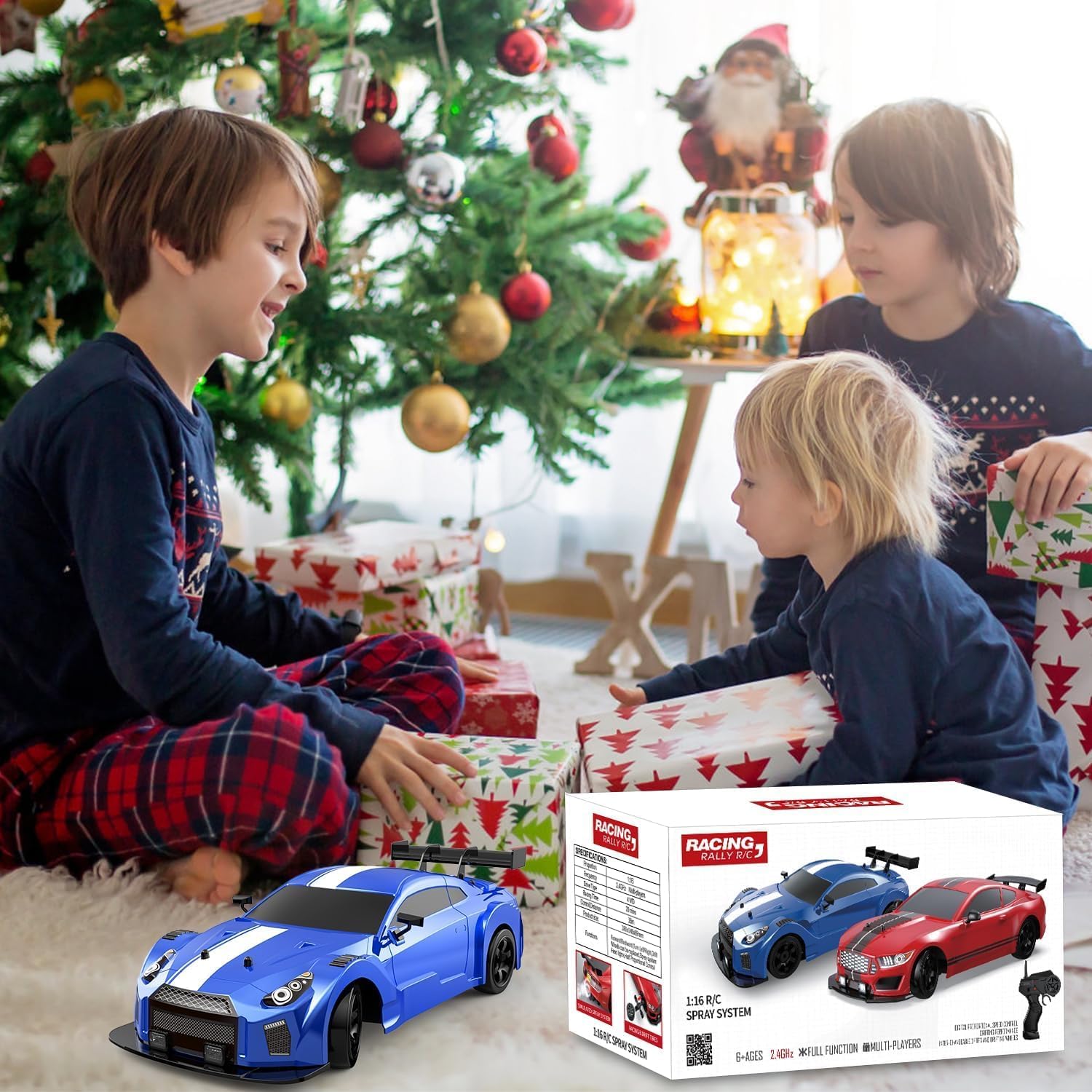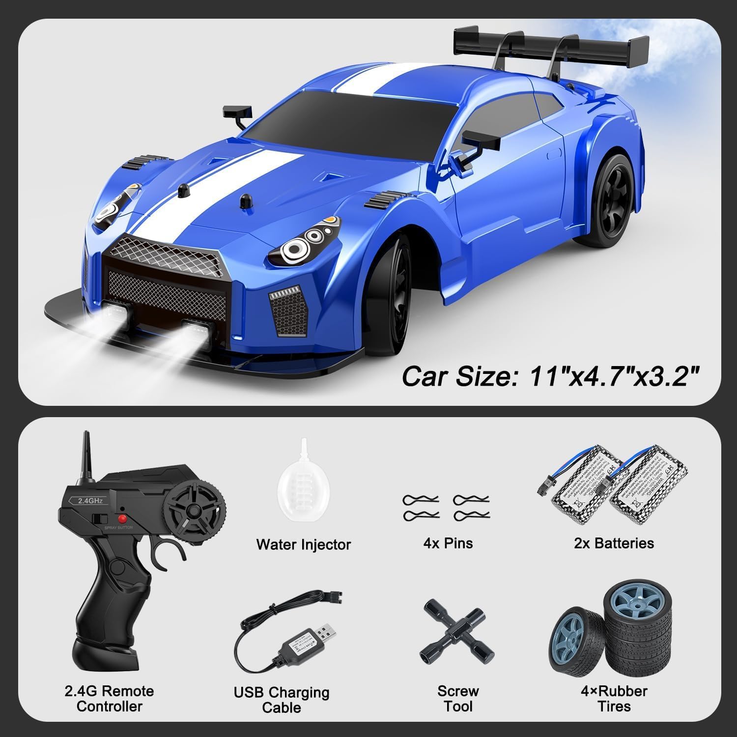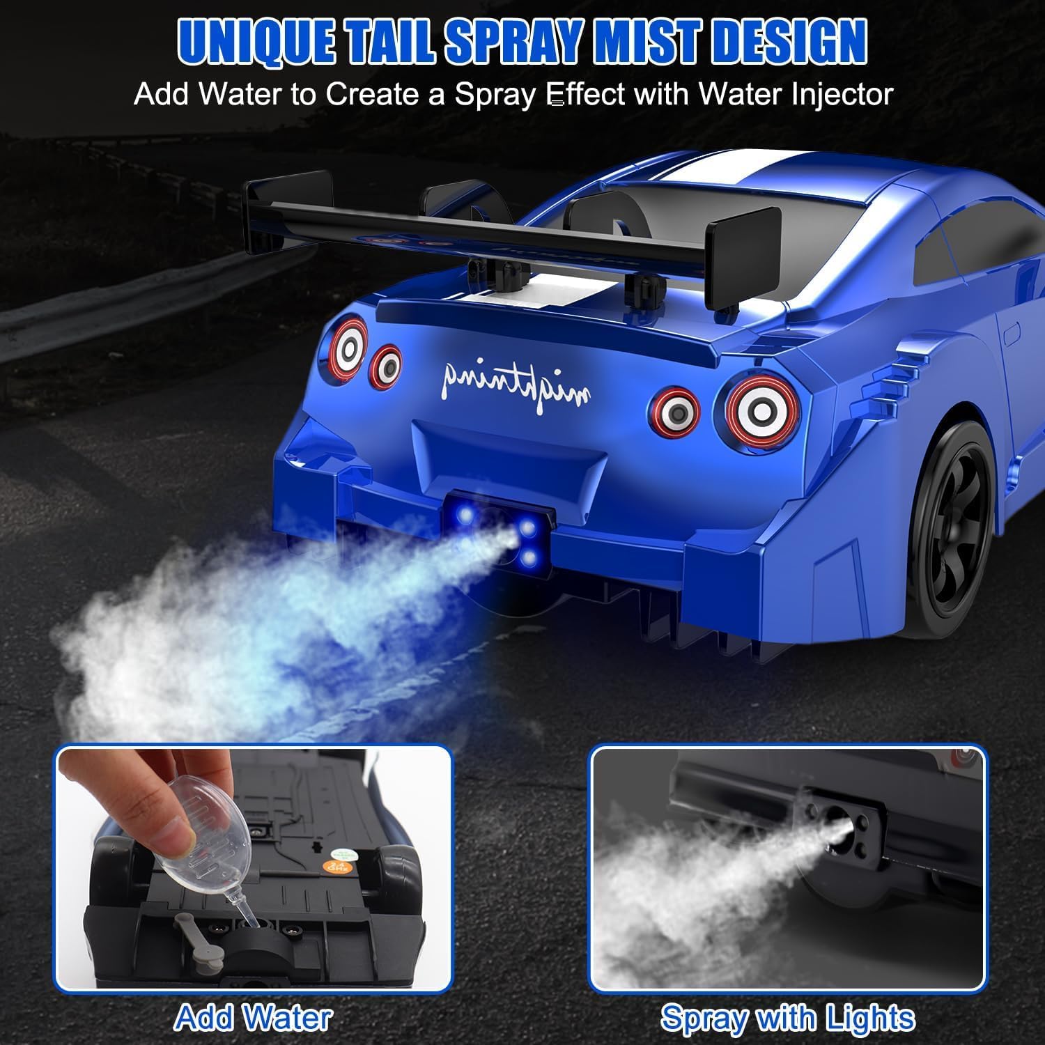 Aspetto unico e realistico Racing Cars: avanti, indietro, girare a sinistra e a destra, l'auto radiocomandata a 4 ruote motorizzata con componenti di alta qualità e potenti motori che rendono l'auto con potenza e forza motrice, la velocità massima fino a 18 + km/h. Ti porterà una fantastica esperienza di corsa, è una buona scelta per ogni appassionato di auto RC Drift Luce LED e spruzzatore: la RC Drift Car viene fornita con un paio di luci a LED e spray LED. Quando l'auto RC è accesa, le luci inizieranno a lampeggiare splendidamente. Riempire la bottiglia nella confezione con acqua inclusa, accendere il pulsante spray maniglia del telecomando, il retro dell'auto mostrerà una nebbia d'acqua fresca, rendendo l'auto più fresca ed emozionante durante la guida Doppia configurazione pneumatici: l'auto drift è dotata di 4 pneumatici da corsa e 4 pneumatici drift. Pneumatici da rally adatto per all'aperto, un altro sono per la deriva all'interno. Due tipi di pneumatici possono adattare l'auto RC su più superfici stradali diverse, può andare alla deriva su tavole lisce, piastrelle, tracce, migliore maneggevolezza, migliore agilità Controller non interferenza 2.4G: il telecomando sensibile con proporzionale funzione di controllo del gas e dello sterzo, il giocatore può regolare la velocità e la direzione attraverso il controller. 2,4 GHz ad alta frequenza, può raggiungere una distanza di 145 pollici (circa 35 metri), assistere più persone a giocare l'auto telecomando allo stesso tempo, senza interferenze Divertimento per tutte le età: questa auto RC Drifting è adatta sia per bambini che per adulti e offre tensione ad alta velocità e controllo preciso. Ideale per bambini e adulti, ideale per compleanni, vacanze, festa dei bambini e Natale. Godetevi il tempo di famiglia felice e puro piacere di controllo