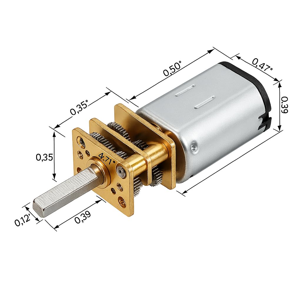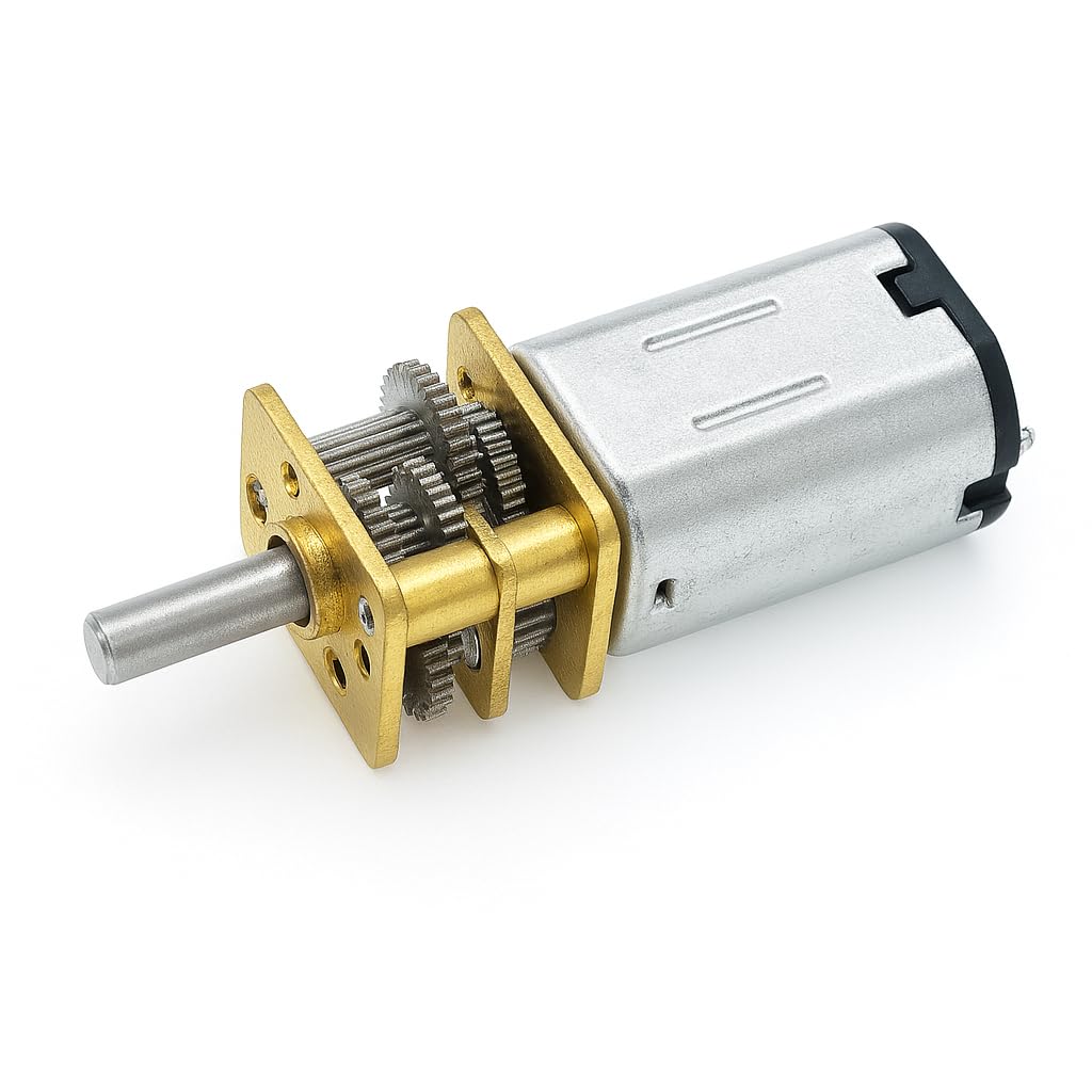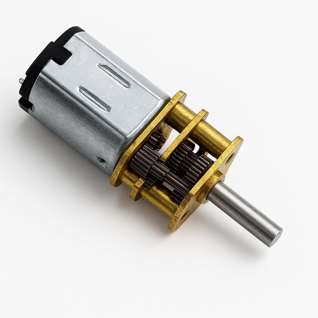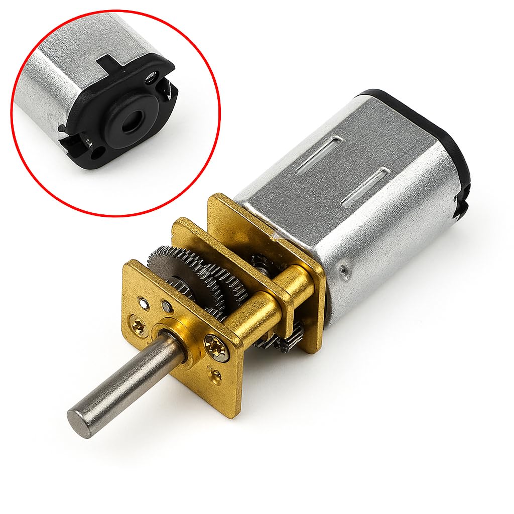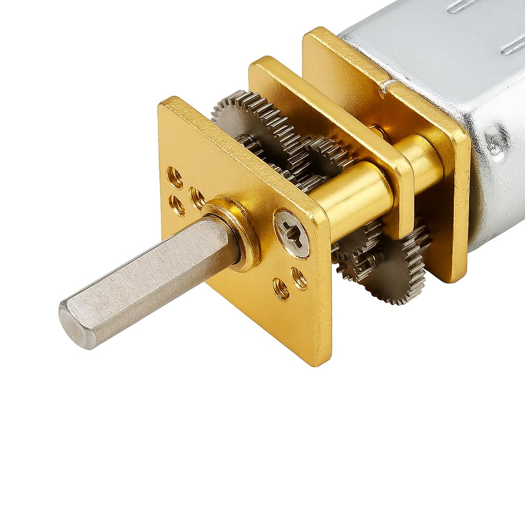 MOTORE DC: motore ad ingranaggi di precisione con riduttore integrato, realizzato con componenti metallici di alta qualità in finitura argento e oro COSTRUZIONE ROBUSTA: Alloggiamento in metallo argentato con ingranaggi di trasmissione dorati che garantiscono un funzionamento durevole e stabile DESIGN COMPATTO: Sistema di riduzione della velocità efficiente in un piccolo formato, ideale per progetti di robotica e automazione MECCANISMO DI PRECISIONE: Ingranaggi metallici ad alta precisione che forniscono una trasmissione di potenza fluida e controllata VERSATILITÀ: Perfetto per applicazioni che richiedono un controllo preciso della velocità e coppia in spazi ristretti