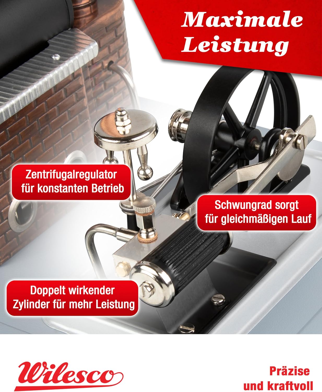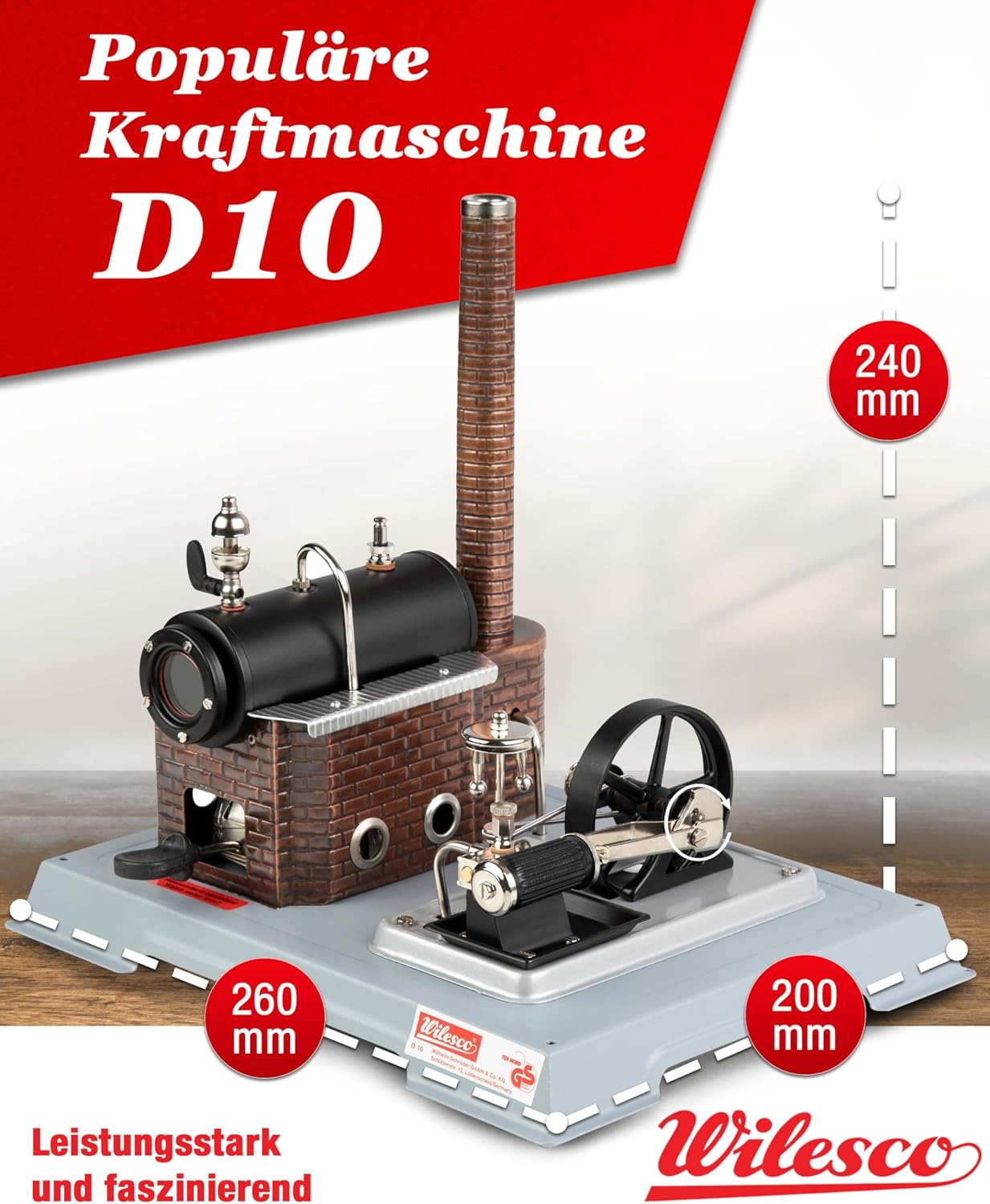 Motore a vapore Wilesco D10 - robusta caldaia in ottone 155 cm³, cilindro a doppio effetto, regolatore centrifugo, vero camino fumante, ideale per collezionisti e amanti della tecnologia