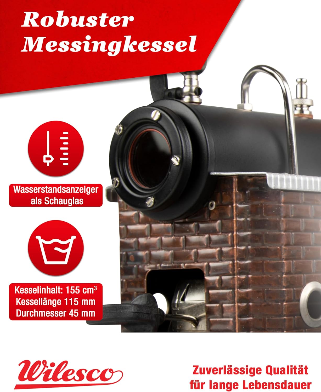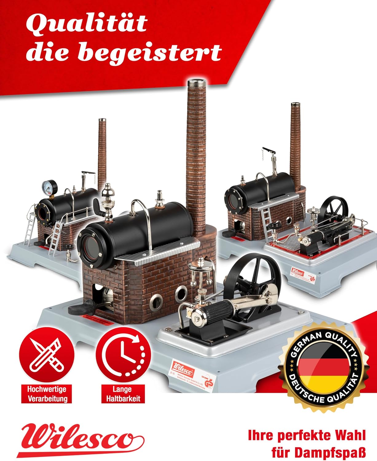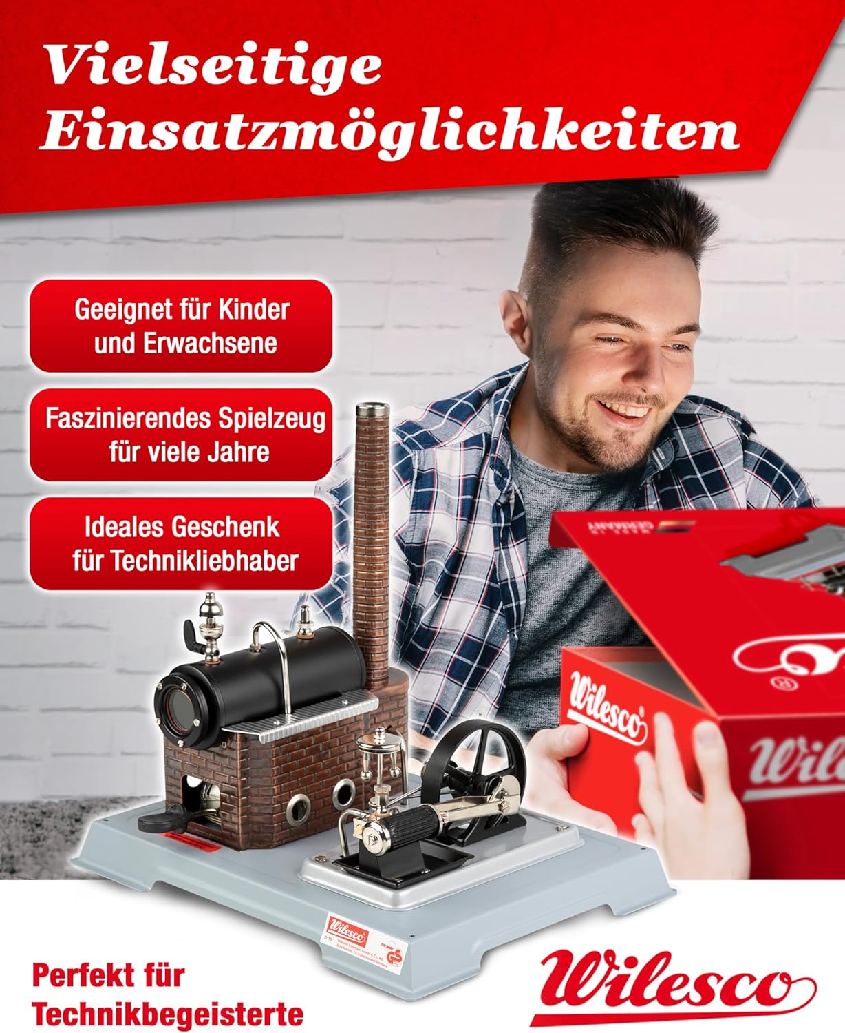 INGEGNERIA TEDESCA DI ALTA QUALITÀ E DURATA: esperienza di oltre 110 anni di insuperabile lavorazione artigianale dei motori a vapore di Wilesco. Il motore a vapore D10 con motore Stirling e robusta caldaia in ottone e parti del modello nichelate garantiscono una lunga durata e prestazioni affidabili. Una testimonianza dell'ingegneria tedesca, ideale per hobbisti e collezionisti. REGALO EDUCATIVO E DIVERTENTE PERFETTO: il D10 è un prezioso strumento di apprendimento per bambini dagli 8 anni in su che insegna chiaramente i principi della potenza del vapore e della meccanica. Ideale per ragazzi e ragazze, promuove l'amore per la scienza e la tecnologia e offre alle famiglie divertimento formativo condiviso. FACILE DA ASSEMBLARE CON UN'ESPERIENZA DI VAPORE REALISTICA: Progettato sia per i principianti che per gli appassionati esperti, questo motore a vapore Wilesco D10 è facile da montare e utilizzare. Prova la sensazione autentica di un vero camino fumante e di un cilindro a doppio effetto che fornisce una dimostrazione coinvolgente e realistica della potenza del vapore. KIT MOTORE A VAPORE CON CARATTERISTICHE DI SICUREZZA: Dotato di valvola di sicurezza a molla e vassoio di condensa, questo motore a vapore garantisce ogni volta un funzionamento sicuro e pulito. Sicurezza e divertimento vanno di pari passo con il modello di motore a vapore Wilesco D10. ACCESSORI INCLUSI: Questa macchina a vapore per bambini e adulti è dotata di camino, scivolo del bruciatore, fischietto per vapore a cupola con leva in plastica, guarnizioni, combustibile secco WiTabs, olio per macchine a vapore, imbuto corto e vaschetta per la condensa. Questi accessori consentono un'esperienza di svapo completa e realistica, assicurandoti di avere tutto il necessario per un funzionamento immediato.