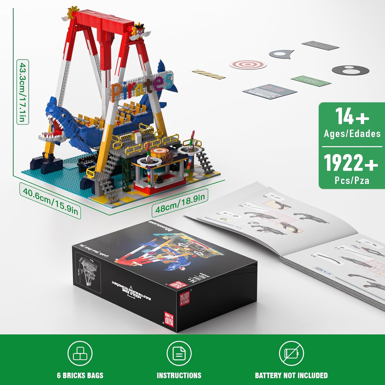 【Esperienza di rotazione da sogno】: dopo essere entrato in modo ordinato sulle sedie della nave pirata, premi l'interruttore e la nave pirata elettrica inizia a oscillare e avverte un forte senso di mancanza di peso e stimolazione psicologica come esperienza di base. Ogni dettaglio è progettato con cura per farti sentire come un vero parco divertimenti. Architettura dei blocchi di bloccaggio: questo kit di costruzione in mattoni di bloccaggio della nave pirata è composto da 1922 pezzi, dimensioni: 48 × 40,6 × 43,3 cm. Tutto confezionato in sacchetti singoli con istruzioni dettagliate, giocattolo da costruzione per parco divertimenti facile da capire e da costruire: questo è uno dei nostri felici progetti di costruzione di parchi divertimento: una nave pirata oscillante con un motore elettrico che sfida l'avventura e ti sentirai pieno di vitalità. Questa esperienza ti consente di vivere in prima persona il viaggio in barca a vela dei pirati. Materiale di sicurezza: realizzato con materiali ABS ecologici e sicuri e materie prime toner naturali, sicuri e innocui. I mattoncini a pinza Corsair costruiti hanno una struttura solida e sono vicini alla realtà. I pezzi da costruzione sono compatibili con i giocattoli in mattoncini di altre marche e possono essere assemblati con componenti di altre marche per creare il giocattolo desiderato. 【Post-vendita di alta qualità】: regalo ideale per adolescenti dai 14 anni in su. Effettuiamo vari test durante il processo di produzione per garantire la qualità del prodotto. Se durante il processo di installazione mancano degli accessori, contattare Mold King