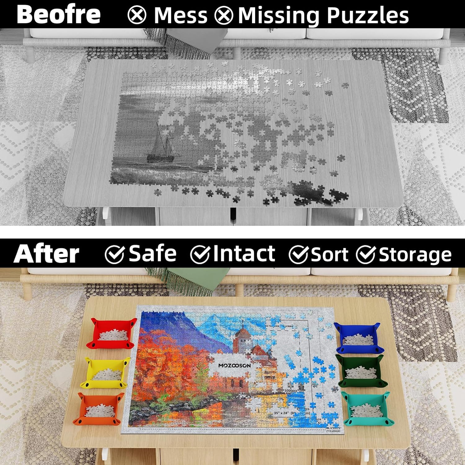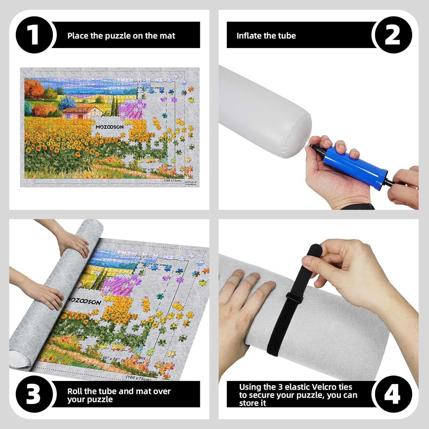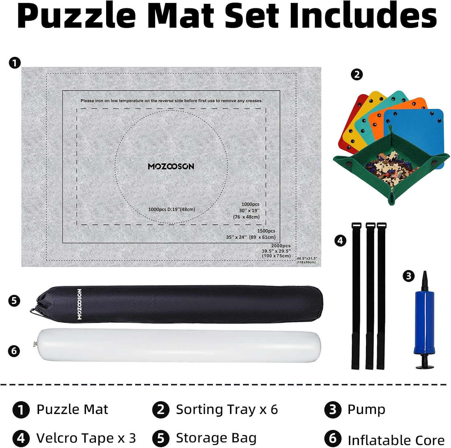Tappetini puzzle di alta qualità - I nostri tappetini puzzle sono realizzati in feltro di alta qualità, con una superficie morbida e antiscivolo, più spessa della maggior parte dei tappetini puzzle sul mercato, più adatti per essere riposti arrotolati. E può attutire efficacemente i danni ai pezzi del puzzle causati da fattori esterni, proteggendo meglio i pezzi del puzzle non finiti. Tappetini puzzle per puzzle fino a 2000 - Il rotolo di tappetino puzzle 118*80 cm/46,5*31,5 pollici può contenere fino a 1500 pezzi di puzzle, adatto per 500 1000 1500 2000 puzzle sul mercato, il tappetino puzzle è diviso in zone puzzle chiare, puoi facilmente trovare il puzzle nel posto giusto e migliorare l'efficienza del tuo puzzle. (Nota: il set di tappetini puzzle non contiene puzzle) Facile da riporre e trasportare - La combinazione di tubo di gonfiaggio + cinturino in velcro + custodia non solo protegge bene il puzzle, ma è anche molto facile da riporre e trasportare. Puoi semplicemente arrotolare i tappetini puzzle e metterli nell'apposita custodia, puoi appenderli per risparmiare spazio o trasportarli comodamente, puoi goderti il divertimento del puzzle sempre e ovunque. Funzione di ordinamento organizzato con selezionatori di puzzle - Il tappetino puzzle aggiunge 6 vassoi di smistamento colorati aggiuntivi per ordinare i pezzi del puzzle per forma, colore o motivo, rendendo il puzzle facile da cercare e modificare. Ciò significa che puoi ridurre la preparazione disordinata prima di scervellarti. Regalo pratico: il tappetino puzzle può soddisfare l'interesse degli amanti dei puzzle di tutte le età, è un pratico regalo di compleanno e Natale e altri vari festival per famiglia, amici e bambini. In caso di problemi con il rotolo puzzle, contattaci immediatamente per risolverlo.