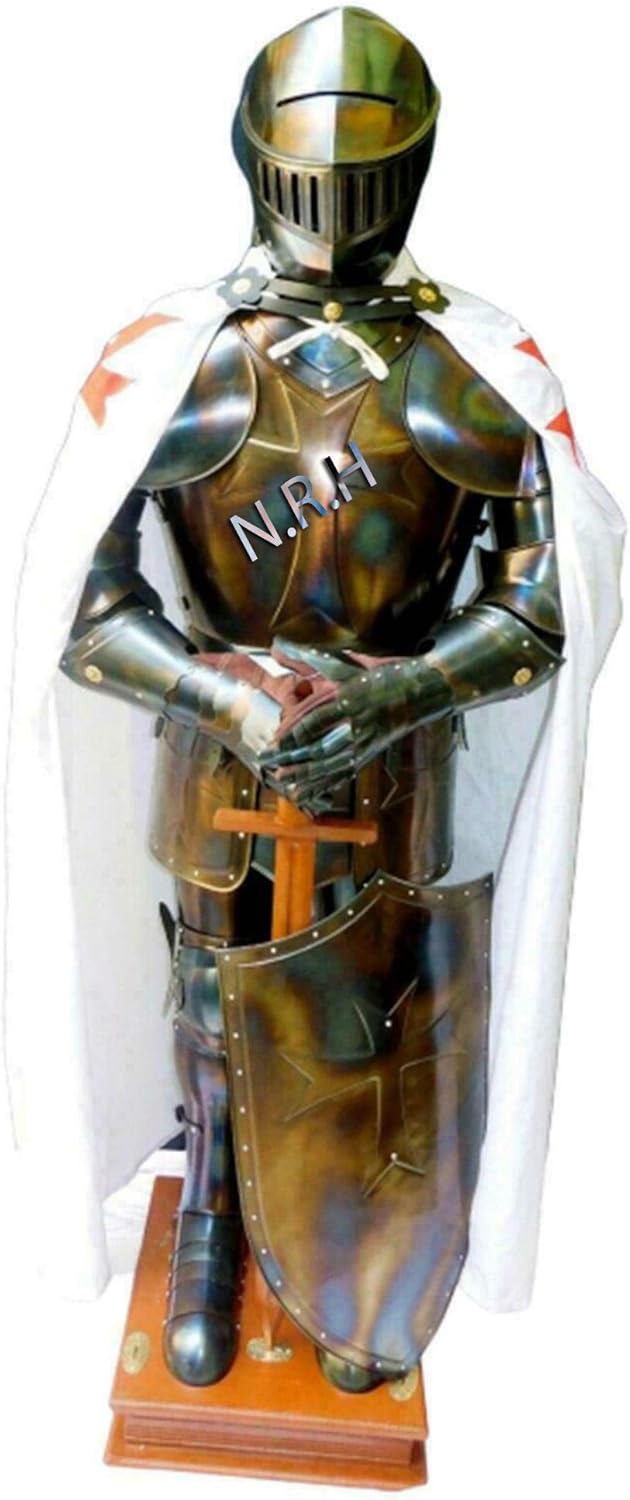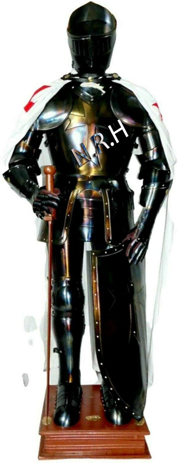 Abito da cavaliere medievale del XVII secolo Abito da battaglia con scudo e base in legno Dimensioni: 1,8 m Colore: ottone nero. Materiale: acciaio calibro 18 Venduto da: Nautical Replica Hub.