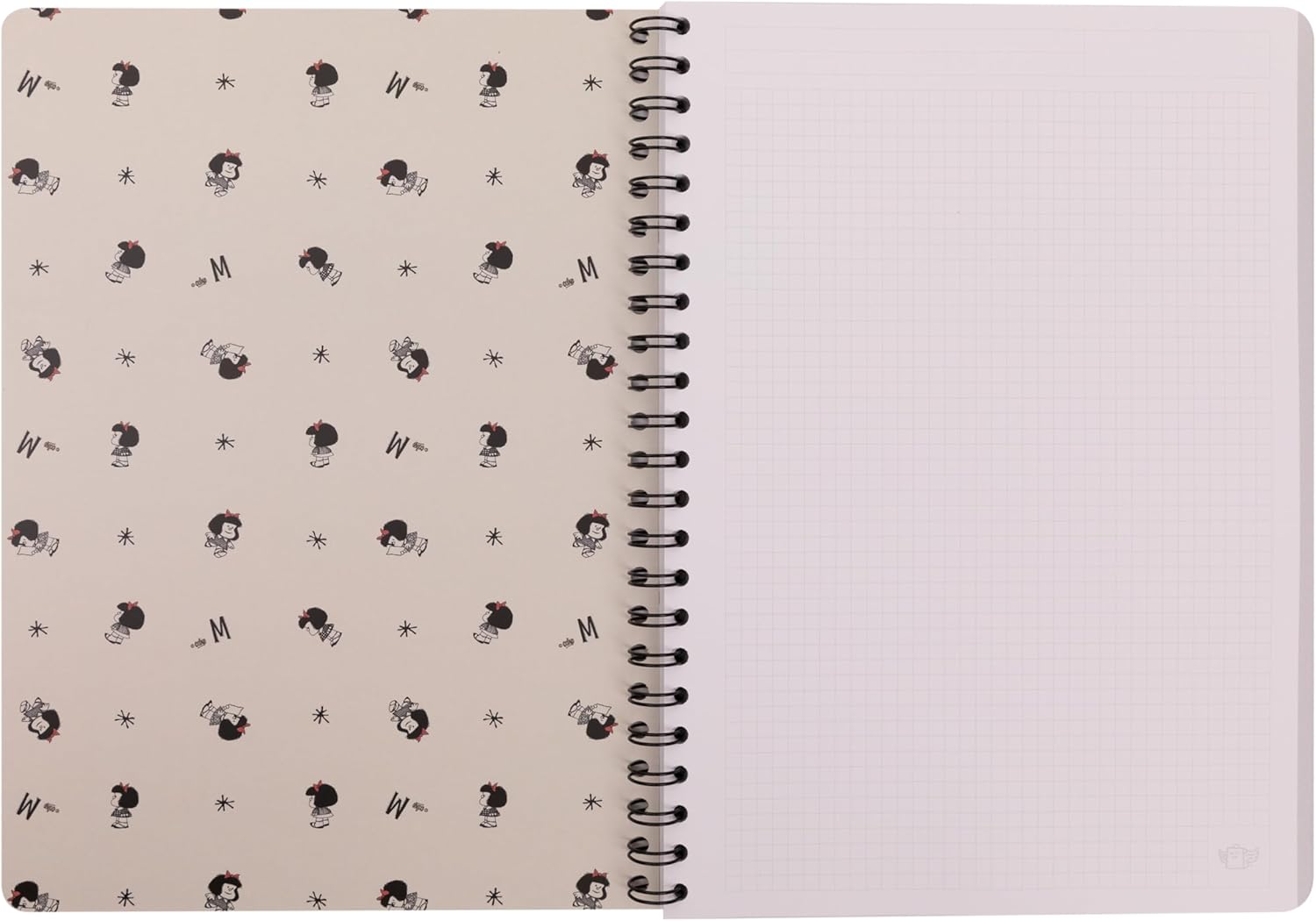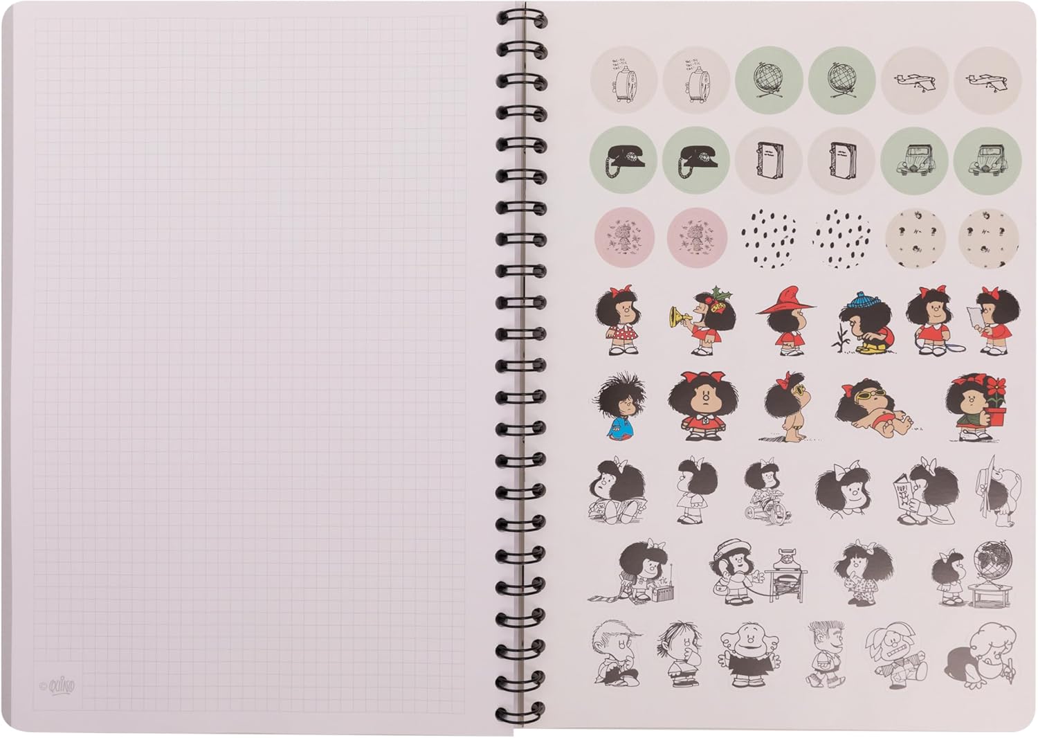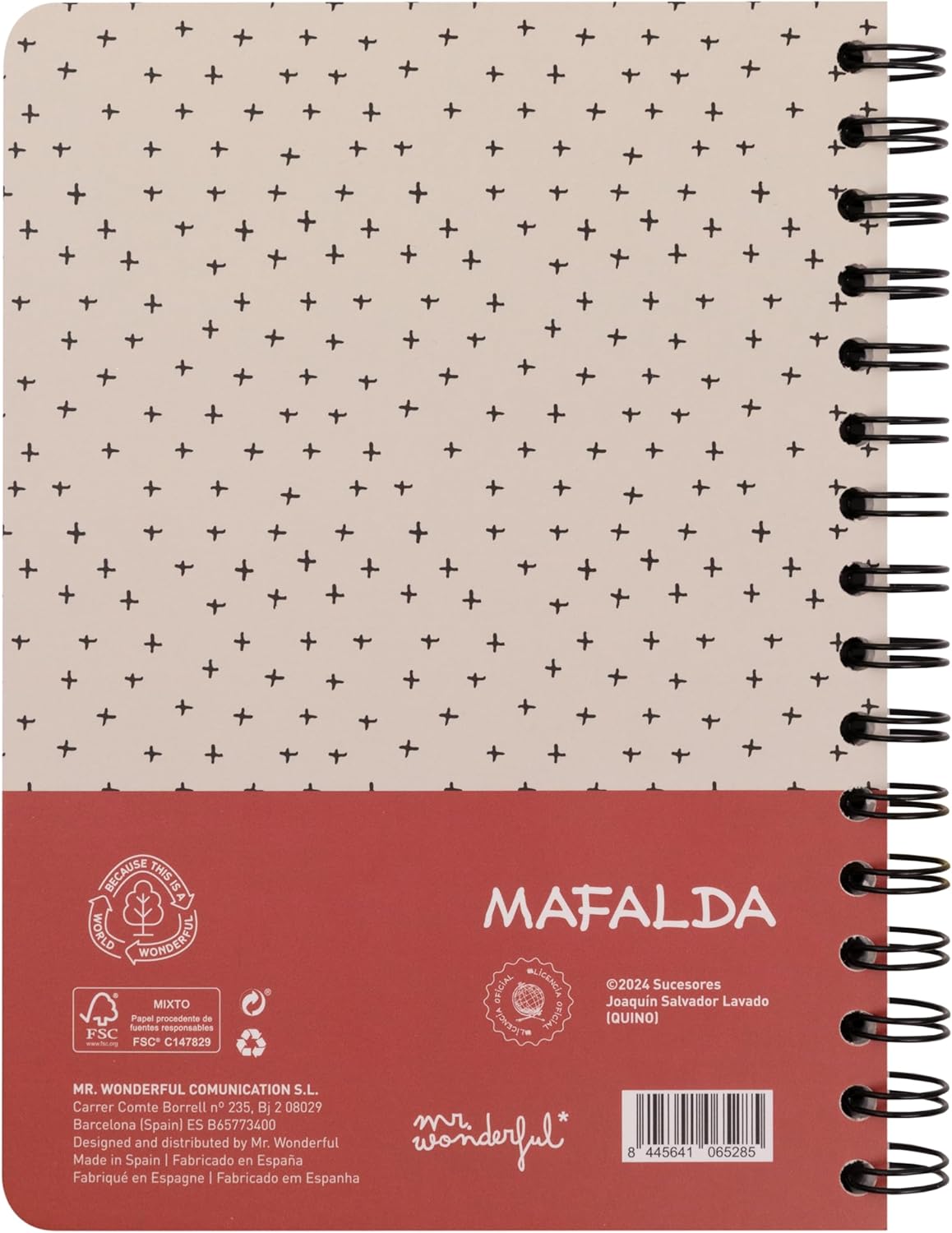 Quaderno A5 con rilegatura a spirale. Sulla copertina Mafalda e Felipe sono i protagonisti, con un disegno e un messaggio di Quino. Interno foderato. Include 1 foglio di adesivi, sempre di Mafalda. Certificato FSC, che garantisce che è stato realizzato con carta proveniente da foreste gestite responsabilmente.