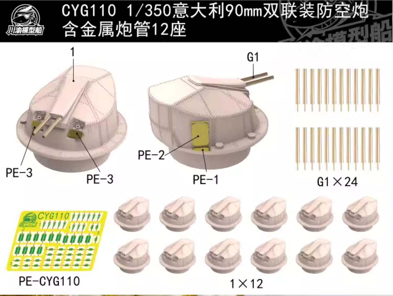 CYG110 1/350 Italilan Heavy Cruiser 90mm AA Gun + Metal Barrel Kit di montaggio Rapporto: 1/350 Caratteristiche: Non dipinto Tema: Militare Materiale: Resina verniciata 3D