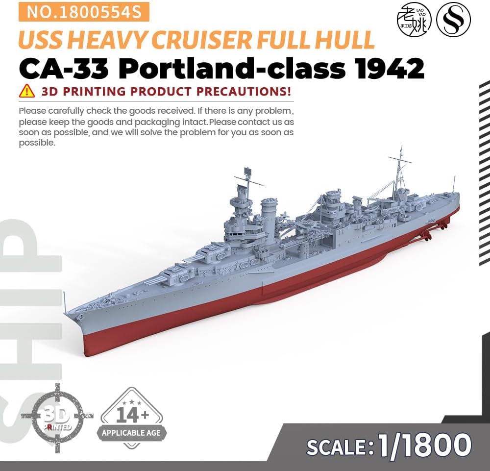 Kit modello militare USS Portland Classe CA-33 Incrociatore pesante 1942 Rapporto scafo completo: 1/1800 Caratteristiche: Non dipinto Tema: Militare Materiale: Resina verniciata 3D