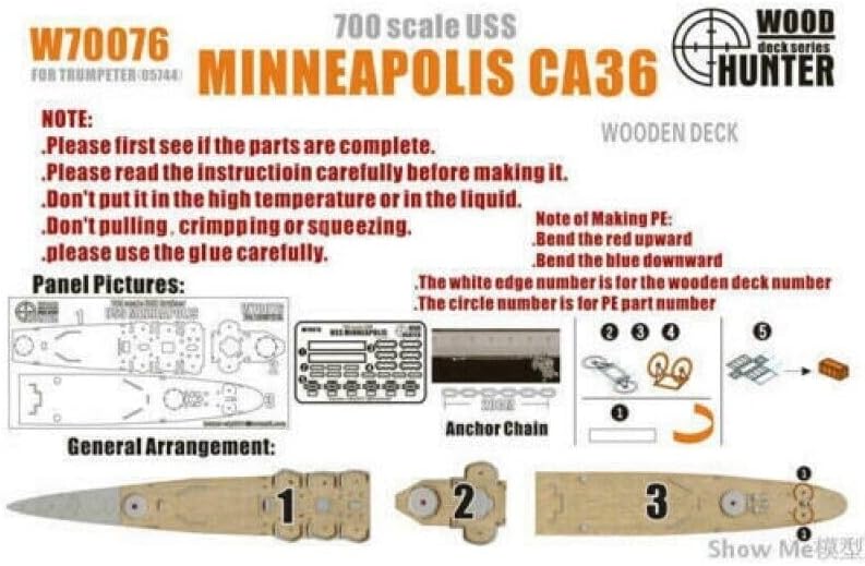 Hunter W70076 1/700 Wood Deck USS MINNEAPOLIS CA36 FOR TRUMPETER 05744 Rapporto: 1/700 Caratteristiche: Non dipinto Tema: Militare Materiale: Resina verniciata 3D