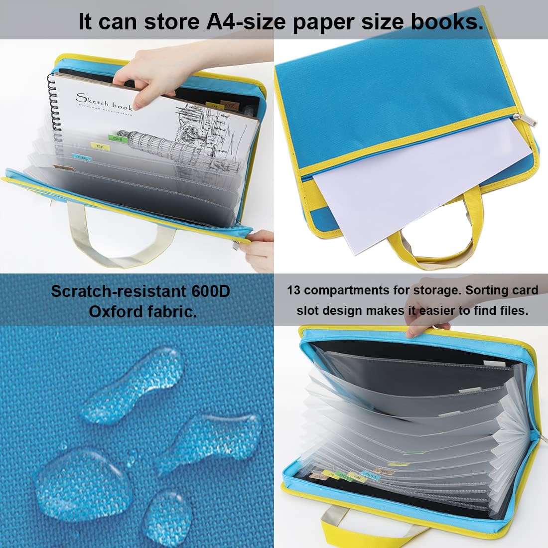 Materiale: tessuto Oxford 600D esterno e interno in PVC. Tasche: 1 tasca principale con doppie cerniere (include 13 tasche interne in pvc) + 1 tasca frontale con cerniera singola. Caratteristiche: Le doppie maniglie sono più facili da trasportare e il design dei colori contrastanti rende la borsa più attraente, la forma piatta non occupa spazio ed è facile da trasportare all'esterno. Dettagli: Gli scomparti in PVC nella tasca sono progettati con fessure per l'inserimento di etichette per lo smistamento, aiutando a organizzare i documenti in modo più efficiente e rapido. Ampiamente usato: stile unisex, perfetto per scuola, viaggi di lavoro, conferenze, esami e altre attività.